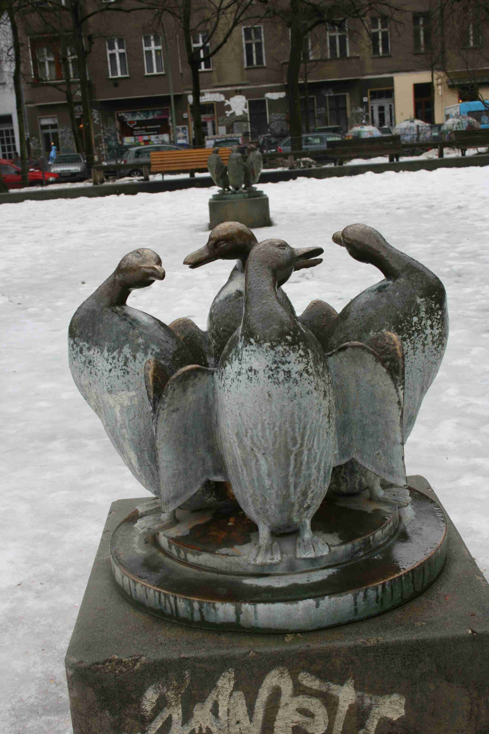 Ein 300 m² großes Becken, eine Plansche mit Betonrand, nimmt die westlichen Platzhälfte des Boxhagener Platzes ein. Zwei bronzene Brunnengruppen sind in diese Fläche eingesetzt worden: eine Gruppe mit vier Pinguinen und eine Gruppe mit vier Enten. In der Südhälfte des Beckens befindet sich auf einem rechteckigen Betonsockel stehend auf einer runden Plinthe die Gruppe der vier in einem Kreis stehenden Pinguinen. Alle vier sind nach außen gewendet, die berühren sich mit den Spitzen ihrer Flügel, alle haben ihren Kopf nach rechts gewendet. Auf der Plinthe ist die Gruppe bezeichnet. In der Nordhälfte des Beckens ist analog eine Figurengruppe mit vier Enten platziert. Auch diese Gruppe besteht aus vier nach außen gewendeten auf beiden Füßen stehenden Tieren, auch sie bilden, die Flügel aneinanderhaltend einen Kreis, sie haben ihre Köpfe nach links gewendet. Auf der Plinthe ist die Gruppe bezeichnet. Die Tiere beider Brunnengruppen sind realistisch gestaltet, die Gruppierung ist kindgerecht konzipiert. Jede Figurengruppe birgt in der Mitte eine Wasserdüse (Jörg Kuhn, Susanne Kähler).