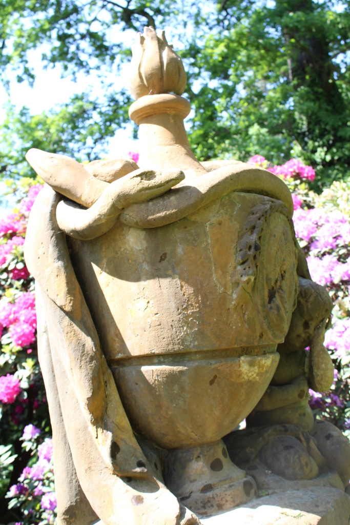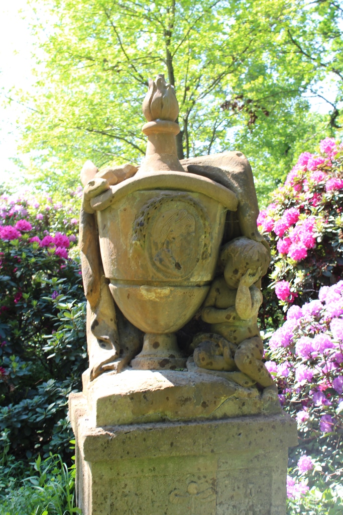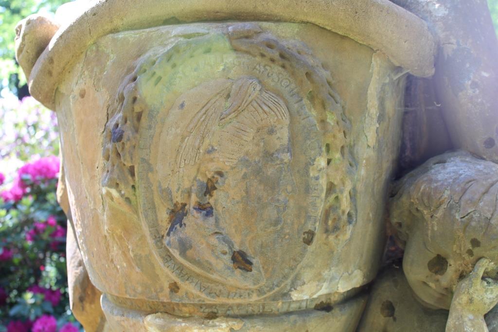 Barocke steinerne Gedächtnisurne der Marianne von Schmettau auf einem Sandsteinsockel mit Porträtrelief und Inschrift im Kranz.