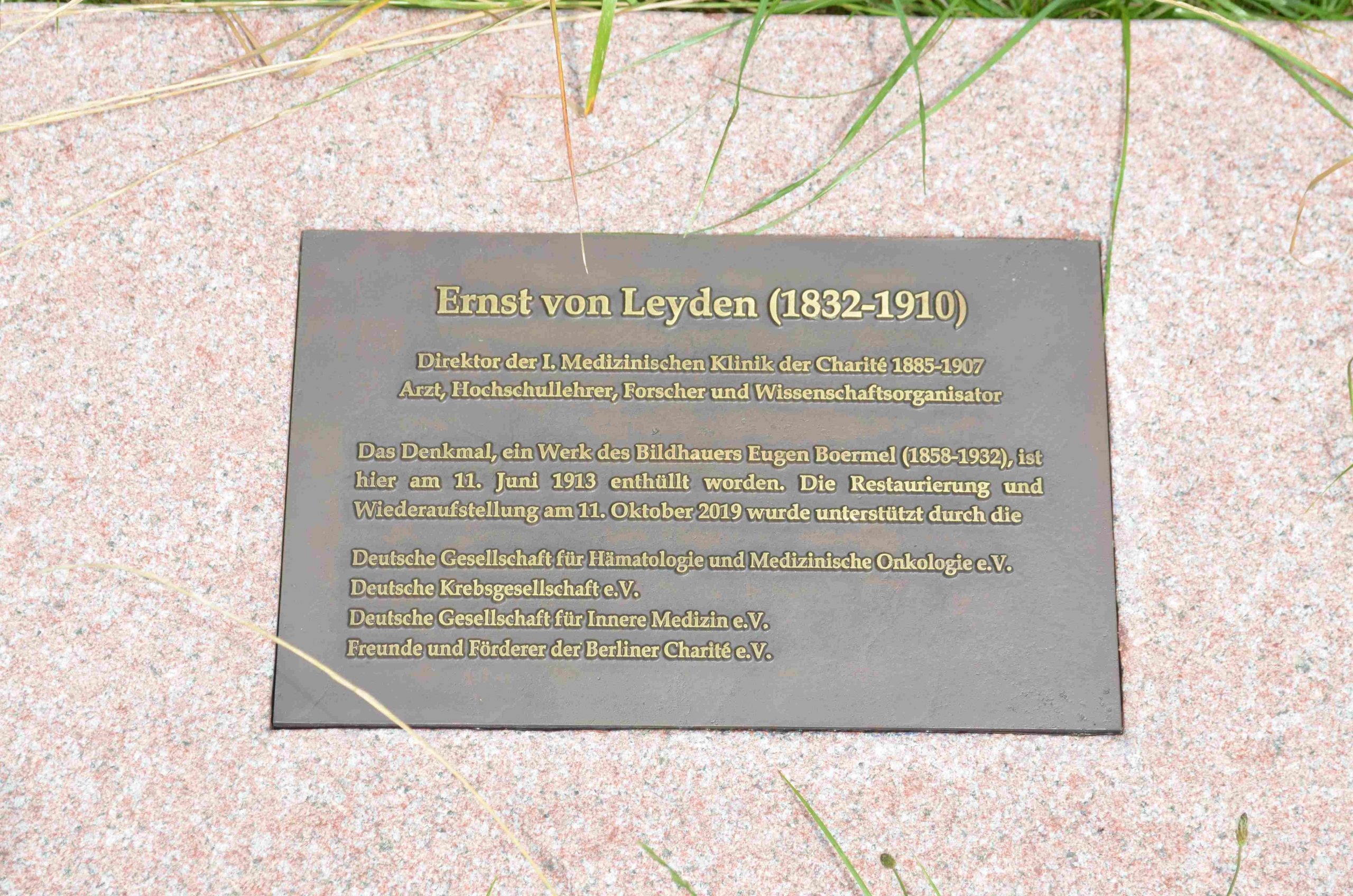 Ernst Viktor von Leyden (1832-1910) kam 1876 nach Berlin. Von 1885 bis 1907 leitete er die I. Medizinische Klinik an die Charité. Das durch Kollegen, Freunde und Weggefährten - darunter der Internist Georg Klemperer (1865-1946) - initiierte Denkmal von Leydens wurde 1913 vor der I. und II. Medizinischen Klink auf dem Gelände der Charité aufgestellt. Im April 1945 durch Beschuss beschädigt. 1990 eingelagert. Unter Federführung der DGHO (Deutsche Gesellschaft für Hämatologie und Medizinische Onkologie) wurde eine die "Schusswunde" über dem linken Auge der Büste als Geschichtszeugnis konservierende Restaurierung und die (bereits fest geplante) Wiederaufstellung am 11.10.2019 des Büstendenkmals erreicht (Jörg Kuhn).