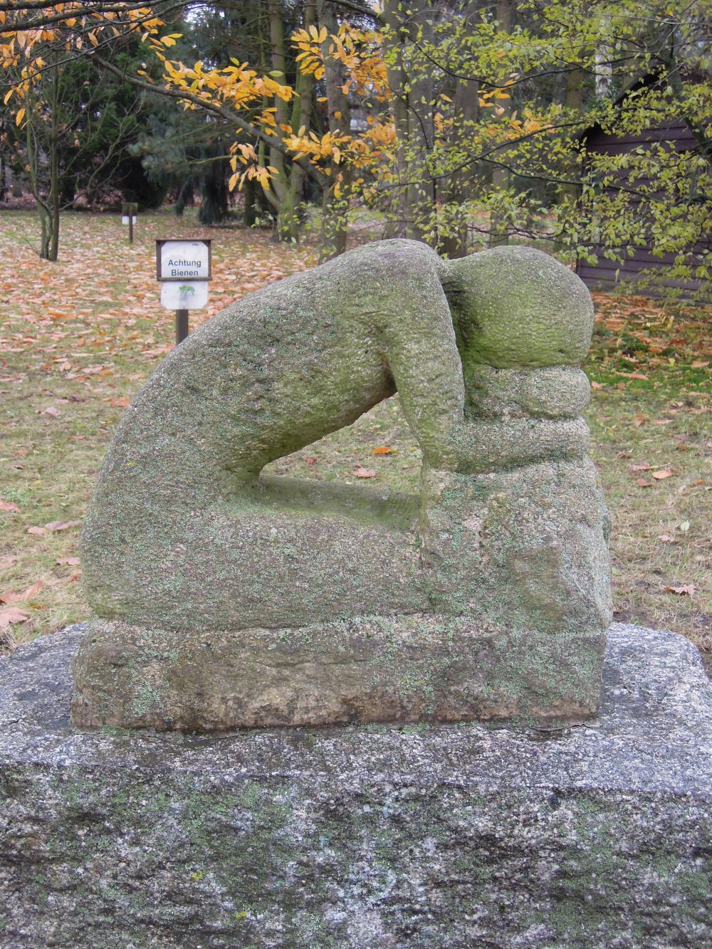 Auf einem teilweise unbehauenen Granitquader ist eine gelblich-bräunliche Skulptur aus Rudolstädter Sandstein aufgestellt, die eine kauernde, offenbar nackte und stark stilisiert formulierte Gestalt zeigt. Nach vorne gebeugt ruht ihr Gesicht auf den verschränkten Armen. Die Figur fußt auf einem L-förmigen Sockel. Figur und Sockel sind aus einem Steinblock herausgearbeitet (Jürgen Tomisch).