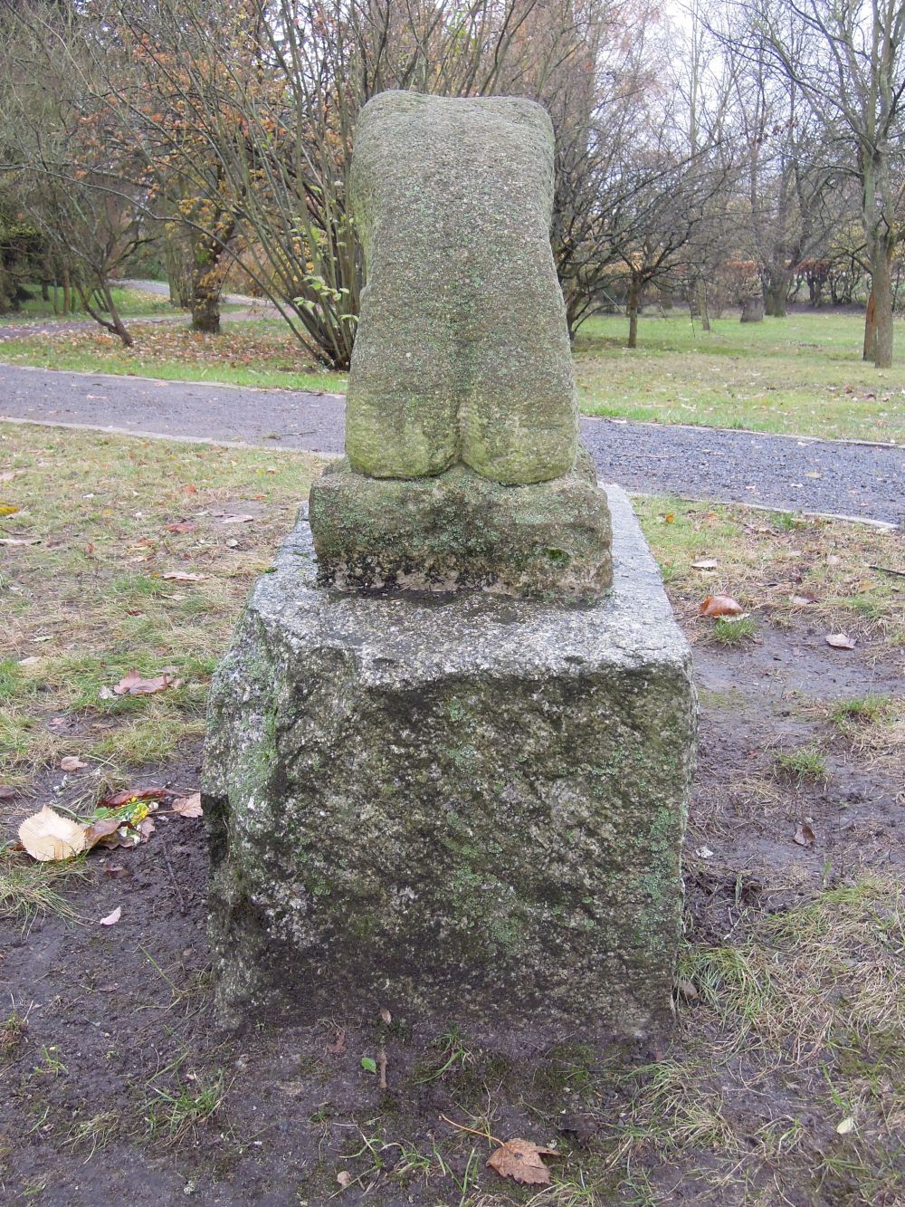 Auf einem teilweise unbehauenen Granitquader ist eine gelblich-bräunliche Skulptur aus Rudolstädter Sandstein aufgestellt, die eine kauernde, offenbar nackte und stark stilisiert formulierte Gestalt zeigt. Nach vorne gebeugt ruht ihr Gesicht auf den verschränkten Armen. Die Figur fußt auf einem L-förmigen Sockel. Figur und Sockel sind aus einem Steinblock herausgearbeitet (Jürgen Tomisch).