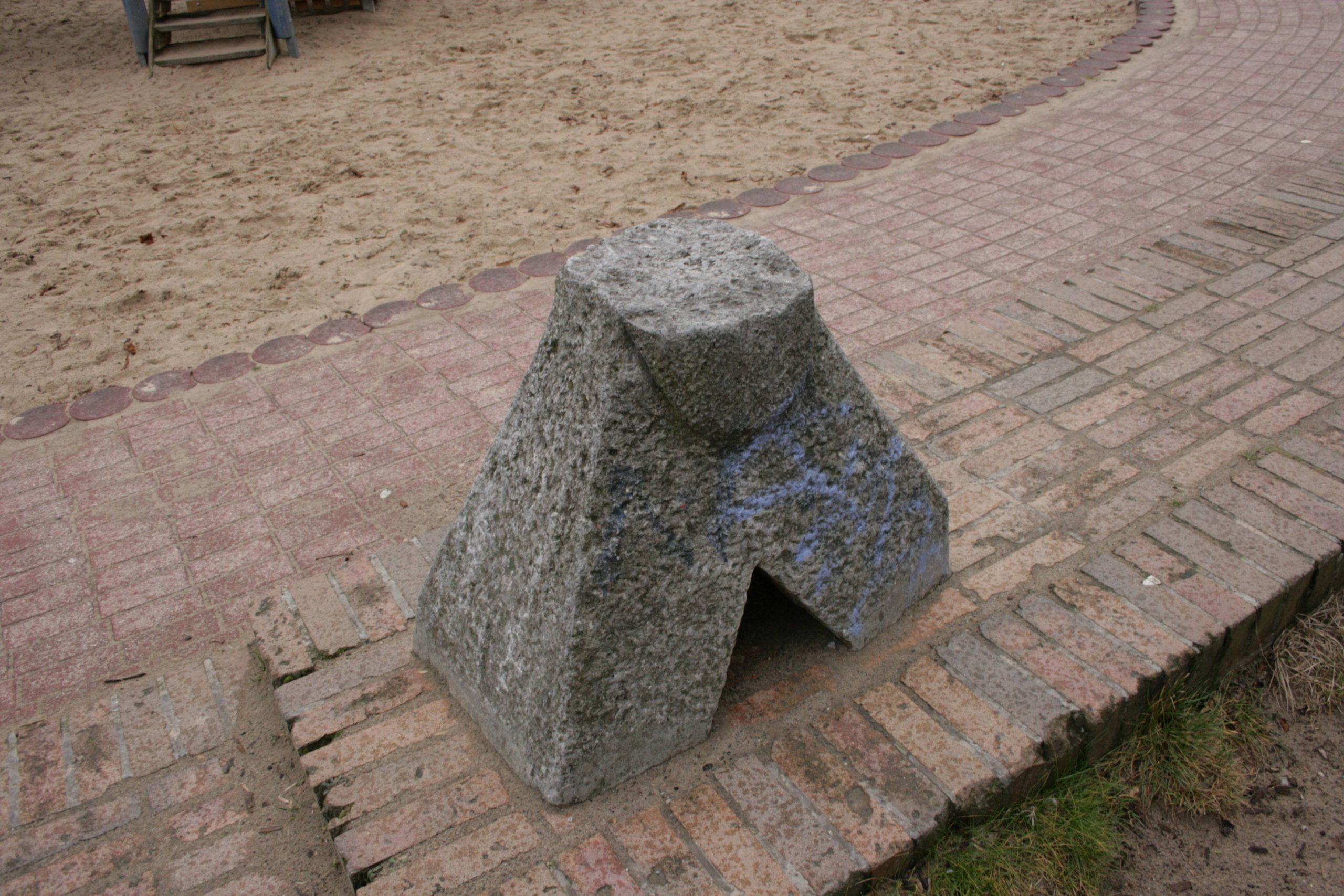 Tierskulptur zum Bespielen und Beklettern. Leider sehr stark beschädigt. Die Eule hatte ursprünglich eine Höhe von etwa 1, 40 Meter. Heute steht lediglich noch ein Sockel aus Muschelkalkstein in Form eines aufgerichteten spitzen Winkels mit gestockter Oberfläche vor Ort. Auf diesem Sockel saß die Eulenfigur auf, die eine kompakte Form aufwies, Details wie Gefieder und Schnabel waren angedeutet (Susanne Kähler, Jörg Kuhn).