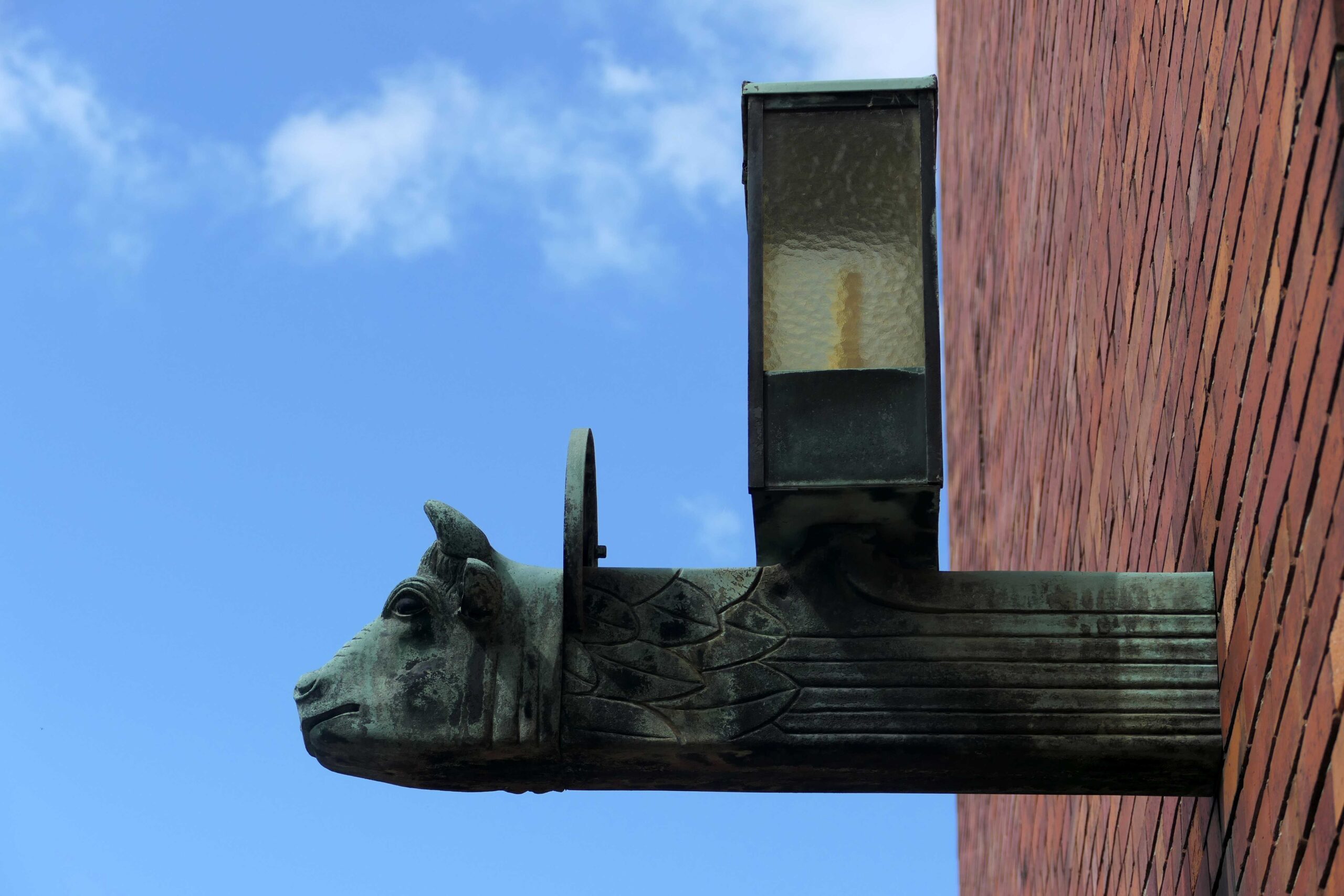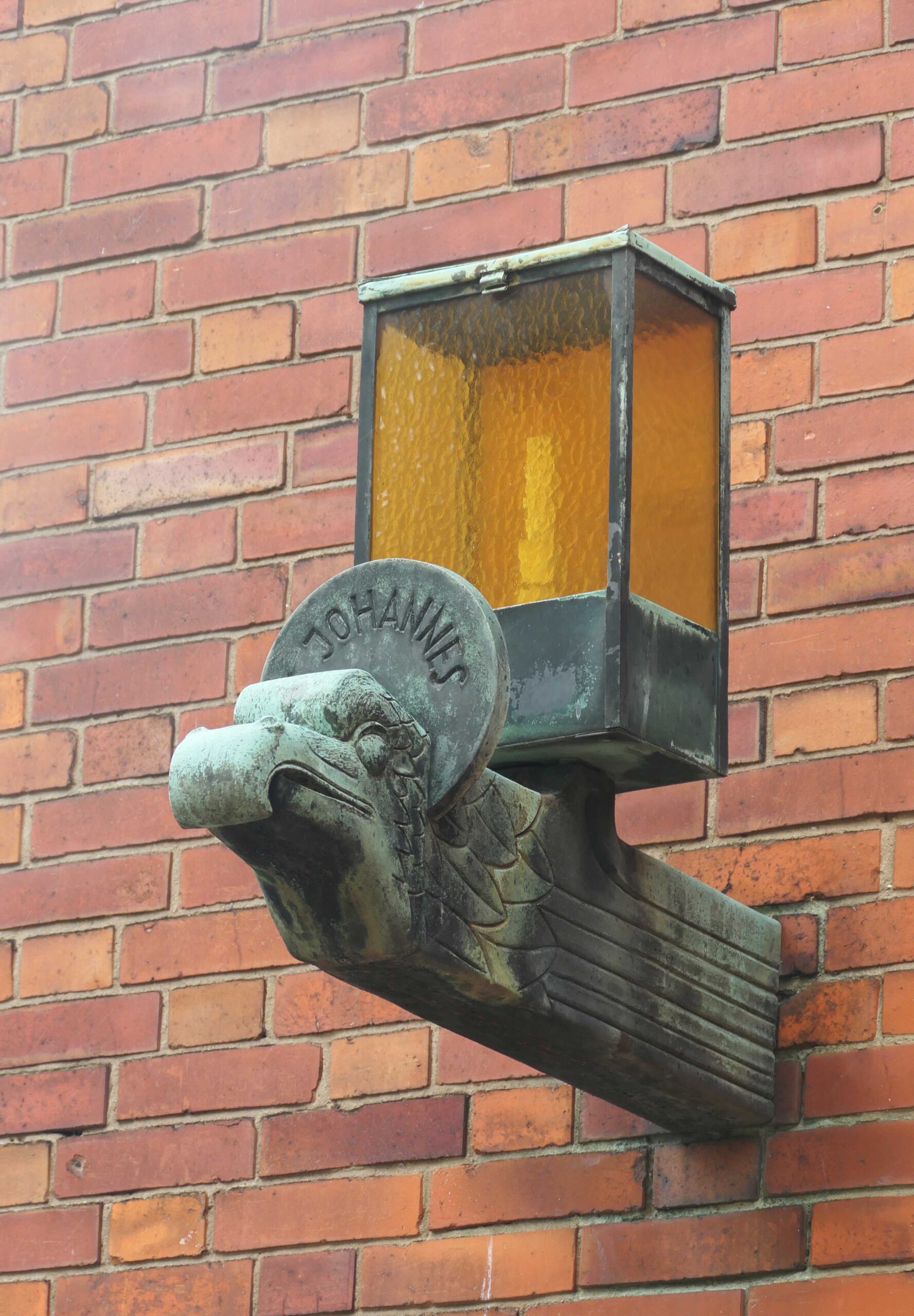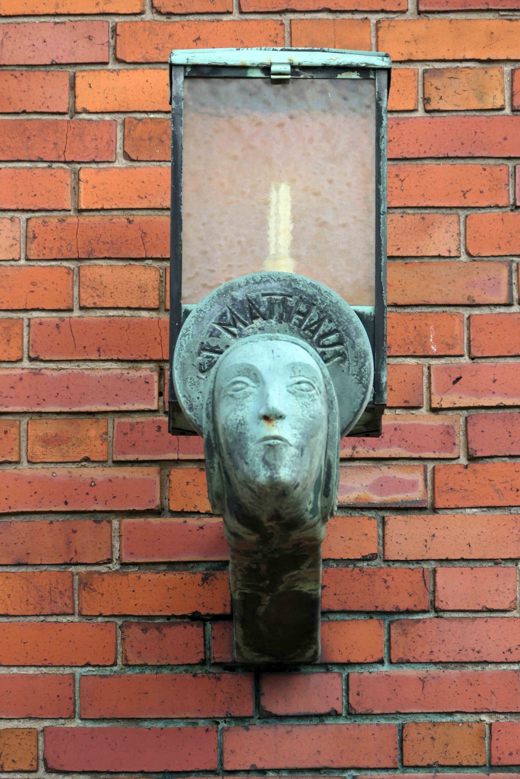Seitlich der Eingänge am Portalturm der St.-Bernhard-Kirche befinden sich vier vorspringende Leuchter, die mit den Symbolen der Evangelisten gestaltet sind. Zwischen Hinterkopf und Lampenkörper befindet sich jeweils ein Nimbus, der den Namen des Evangelisten benennt (Nicola Vösgen).
