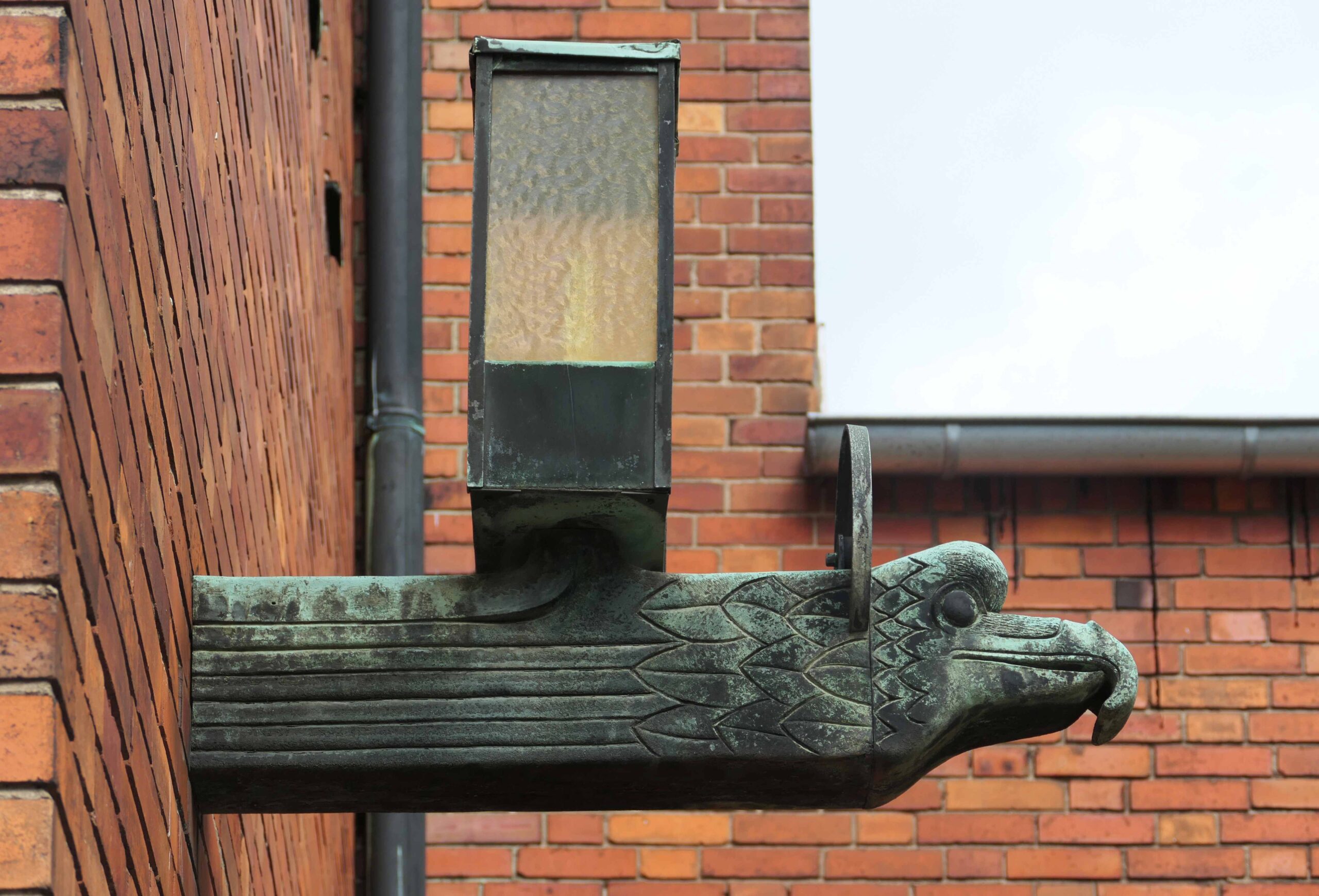 Seitlich der Eingänge am Portalturm der St.-Bernhard-Kirche befinden sich vier vorspringende Leuchter, die mit den Symbolen der Evangelisten gestaltet sind. Zwischen Hinterkopf und Lampenkörper befindet sich jeweils ein Nimbus, der den Namen des Evangelisten benennt (Nicola Vösgen).