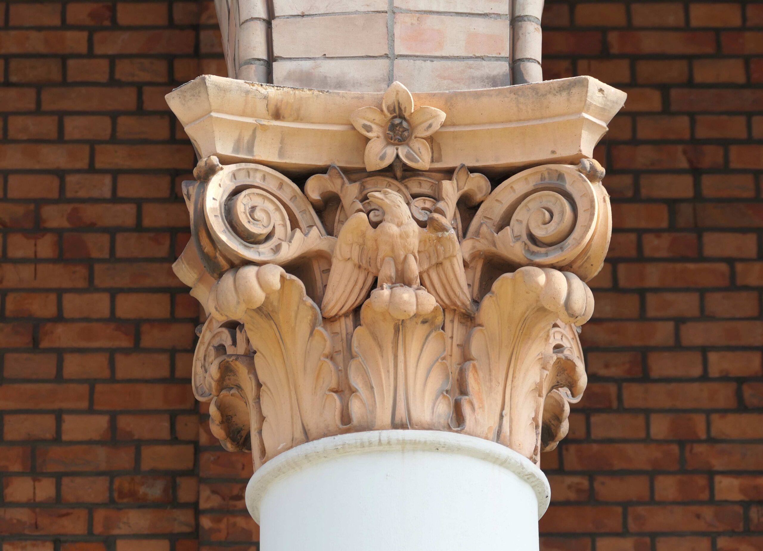 Die vier Säulen der Vorhalle der St. Lukaskirche enden in Kapitellen, die die geflügelten Symbole der vier Evangelisten tragen. Von links nach rechts handelt es sich um die Symbole Mensch/Engel (Matthäus), Löwe (Markus), Stier (Lukas) und Adler (Johannes) (Nicola Vösgen).