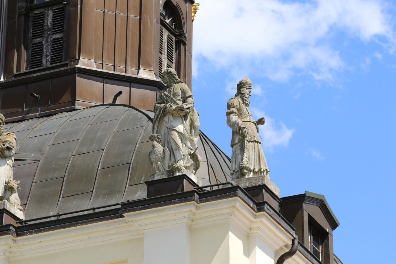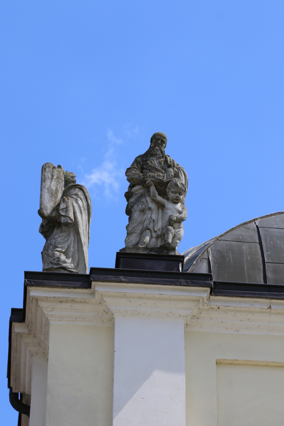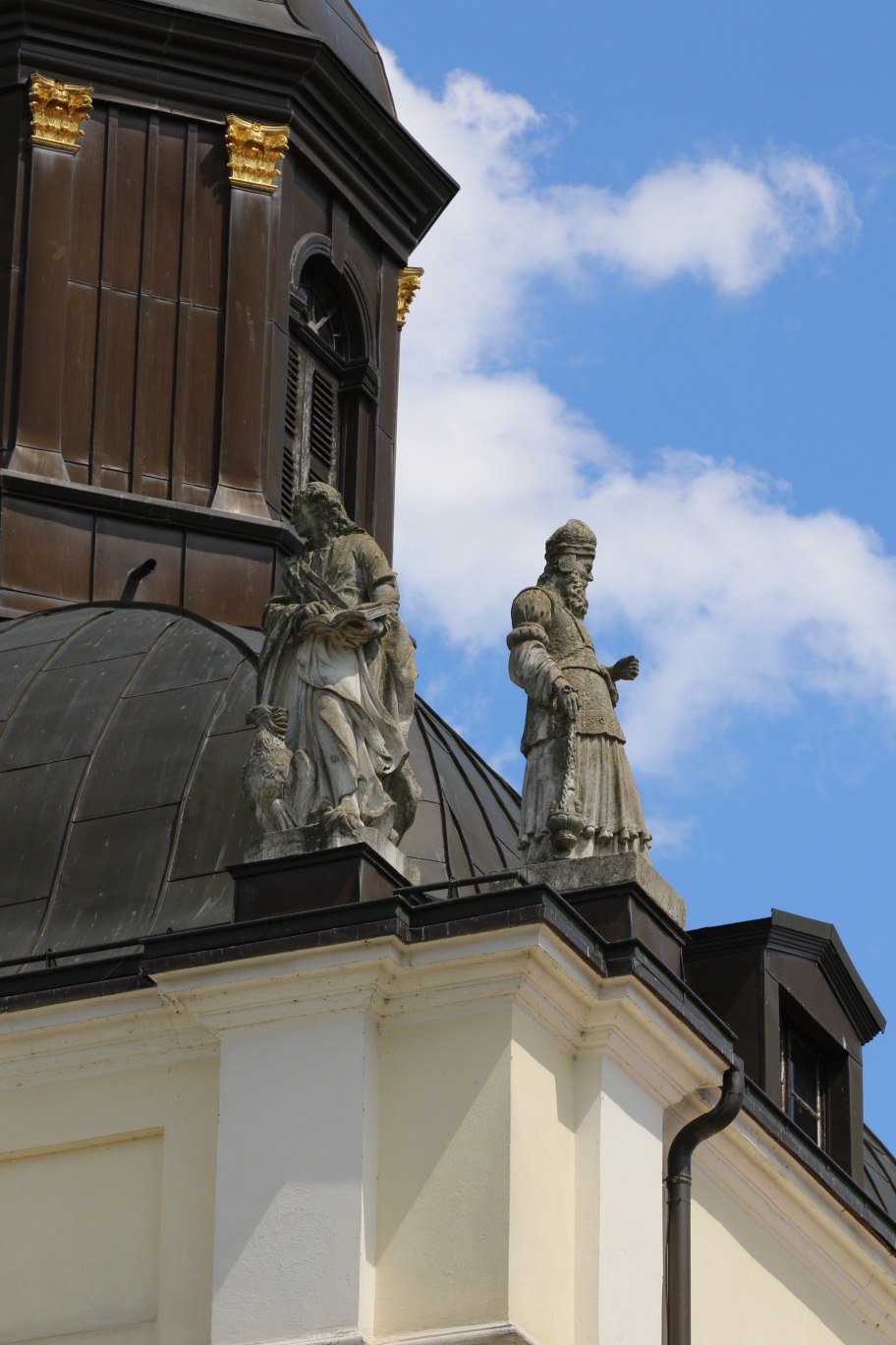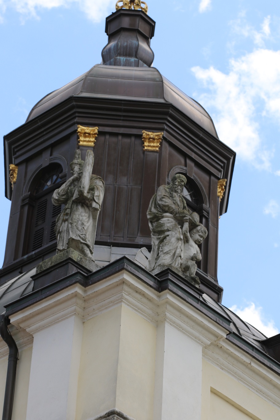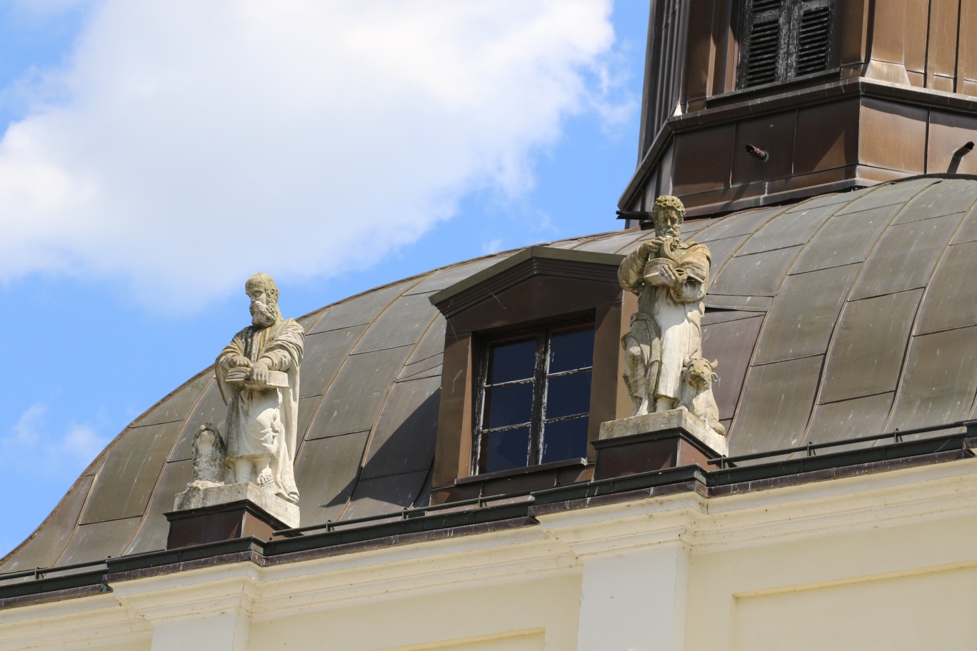 Über der hohen Attika der Fassade der Schlosskirche Köpenick stehen sechs überlebensgroße Skulpturen: An der Vorderseite die vier Evangelisten Matthäus mit dem Engel, Markus mit dem Löwen, Lukas mit dem Stier und Johannes mit dem Adler, rechts und links auf den Gebäudeecken Moses mit den Gesetzestafeln und sein Bruder, der Hohepriester Aaron (Nicola Vösgen).