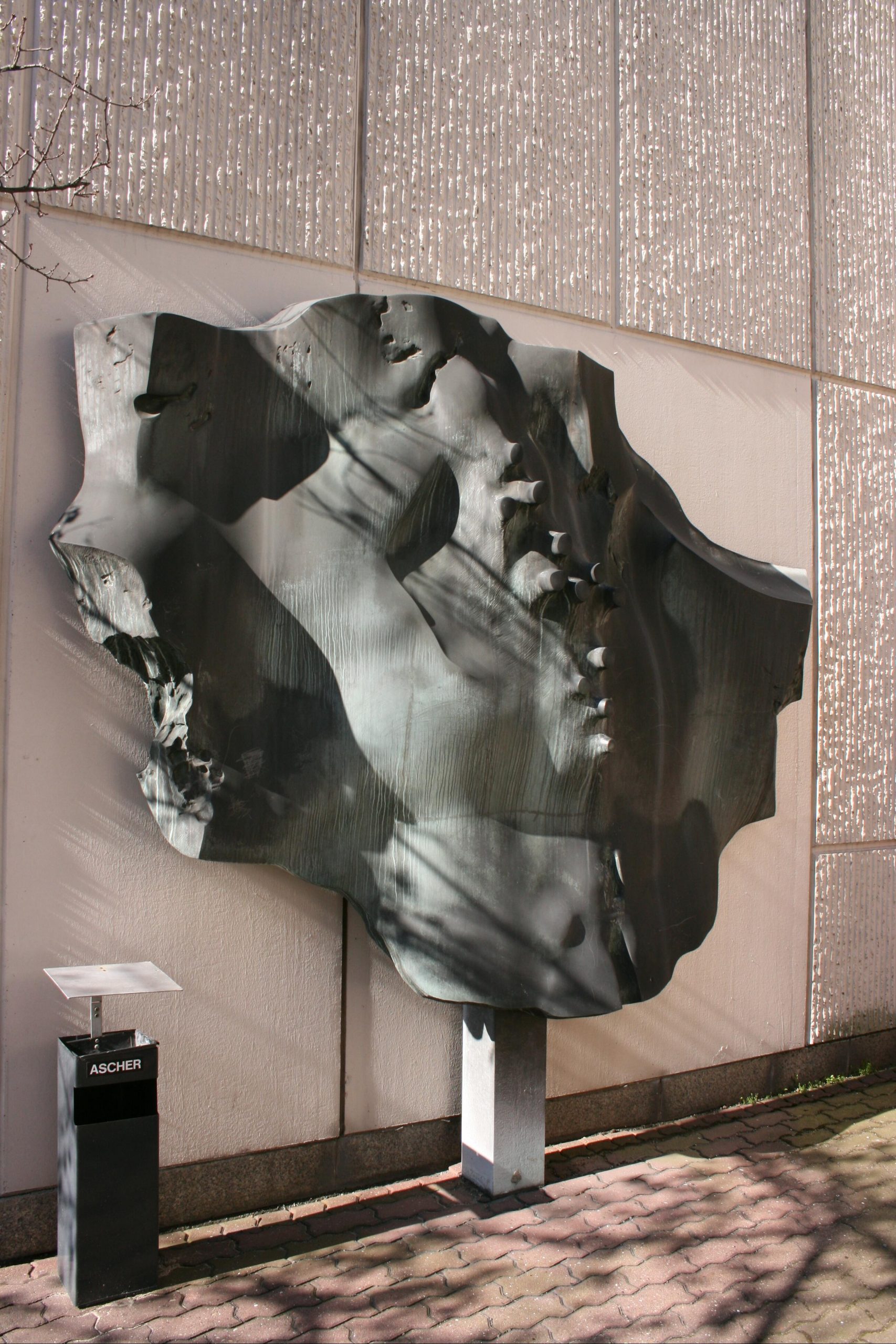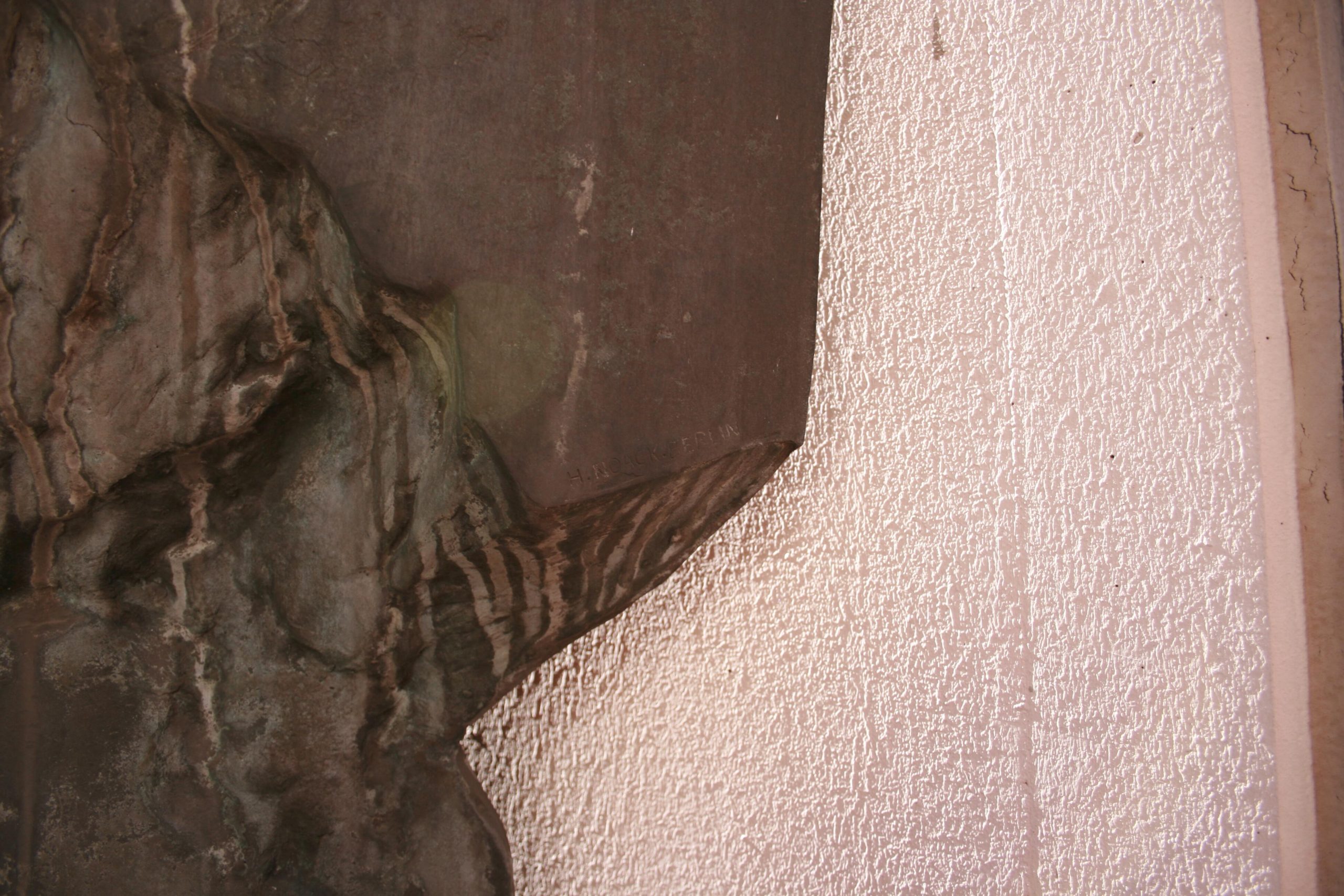 Hochrelief aus Bronze auf einer Vierkantstütze. Dargestellt ist verfremdet der Oberkörper eines Mannes mit ausgebreiteten Armen, die mit der flügelhaften Formulierung des irregulär gebildeten Reliefgrundes korrespondieren (Susanne Kähler, Jörg Kuhn).