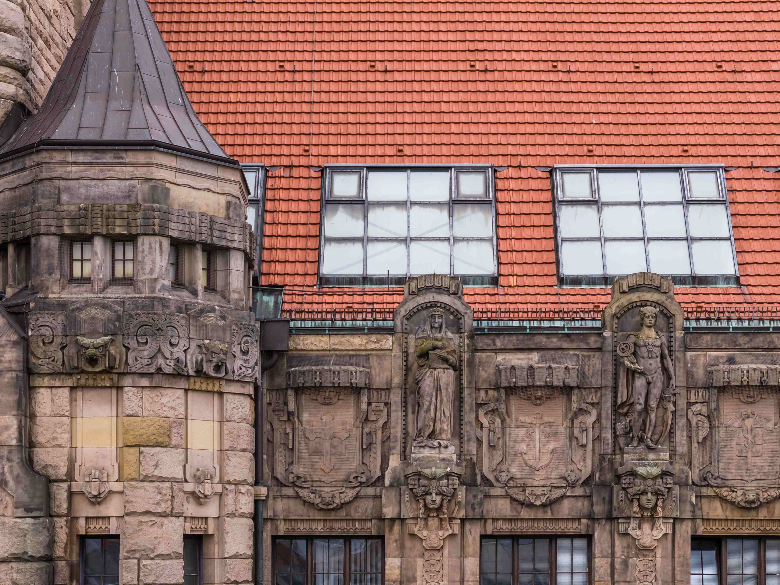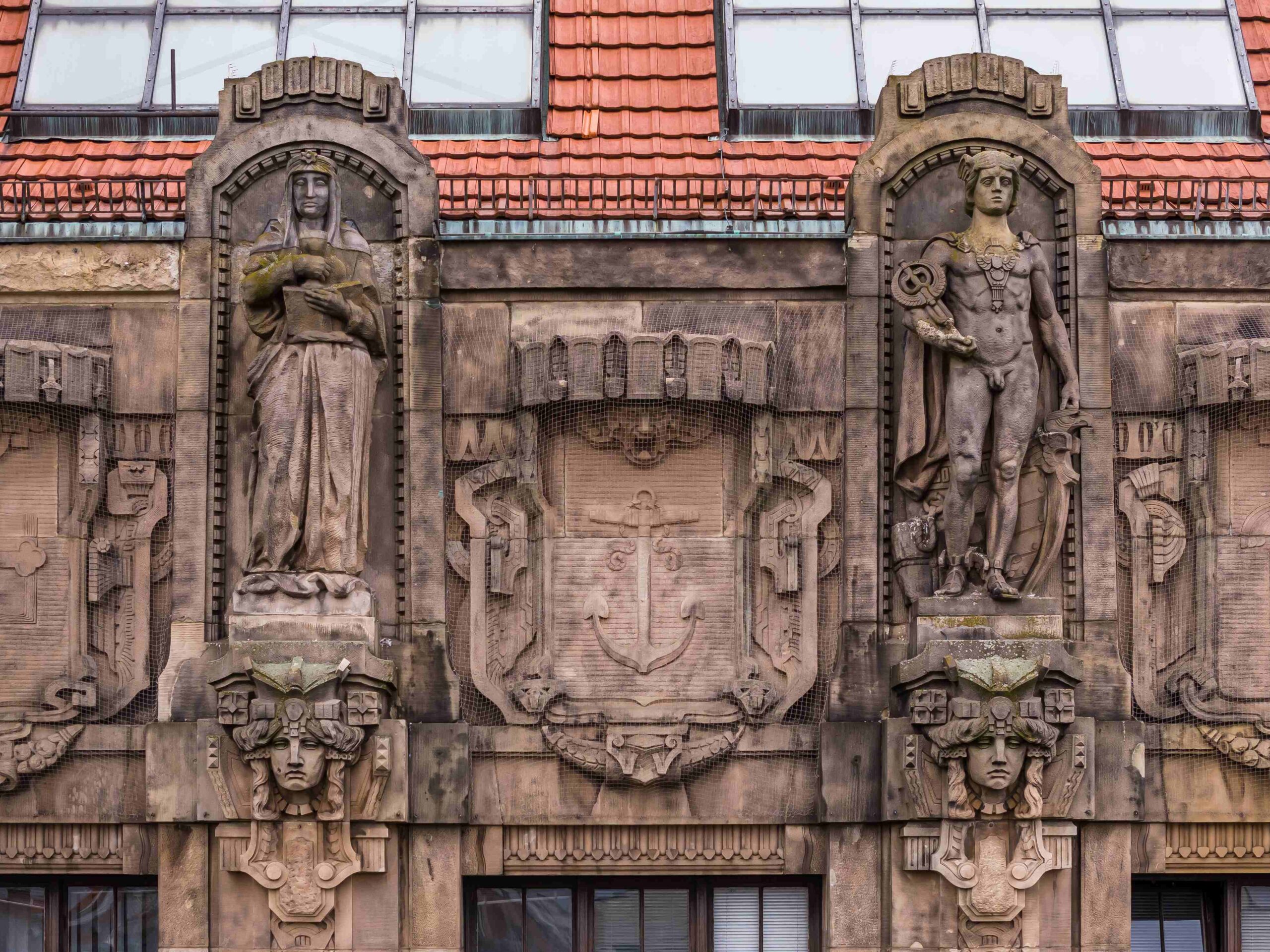 Portalfiguren Weisheit und Gerechtigkeit; Attikafiguren Jugendfürsorge und Heilkunst, vermutlich der östliche Schlussstein