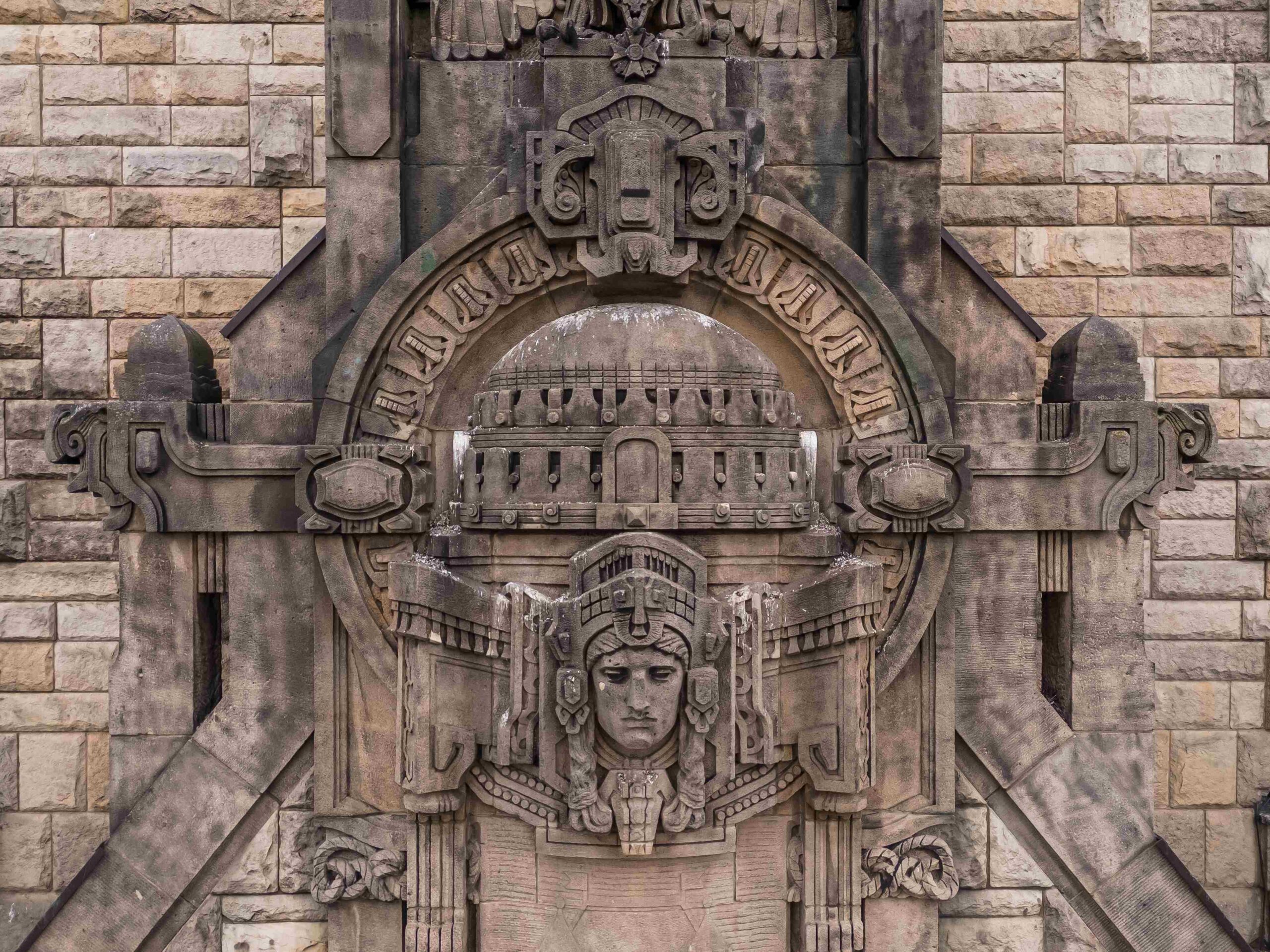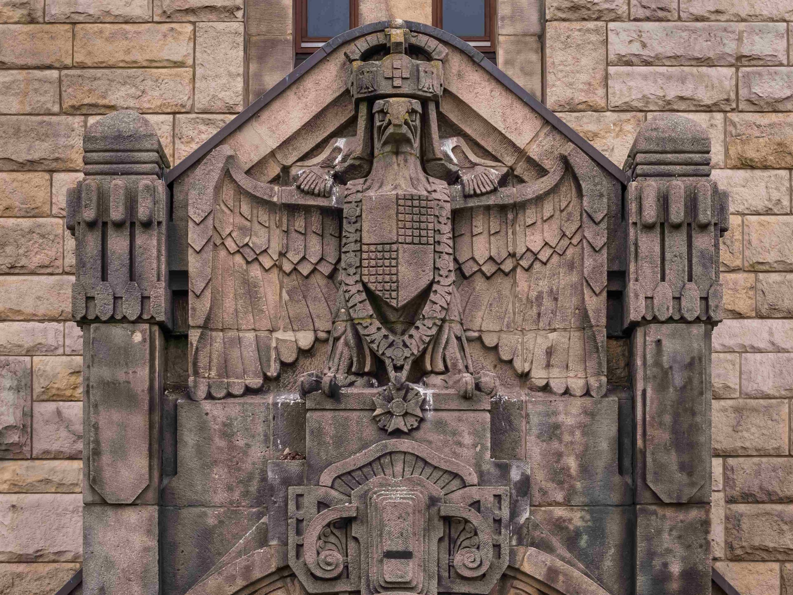 Die großen Rundbogenfester der seitlichen Flügel enden in Schlusssteinen in Form von männlichen und weiblichen Kopfdarstellungen mit begleitenden Tiersymbolen.