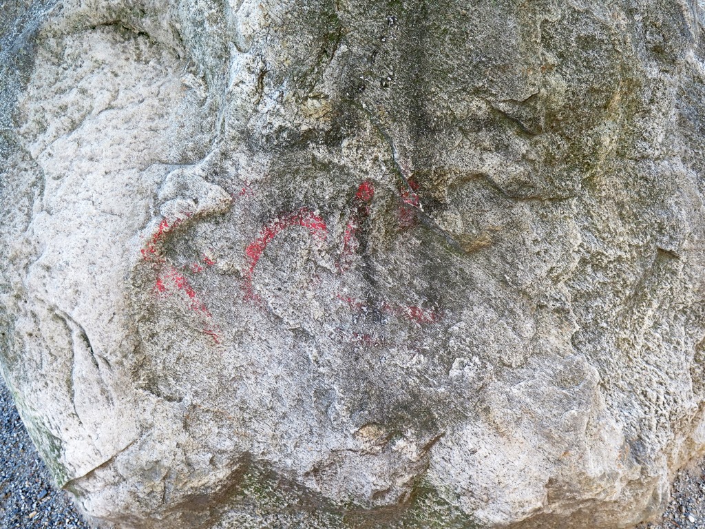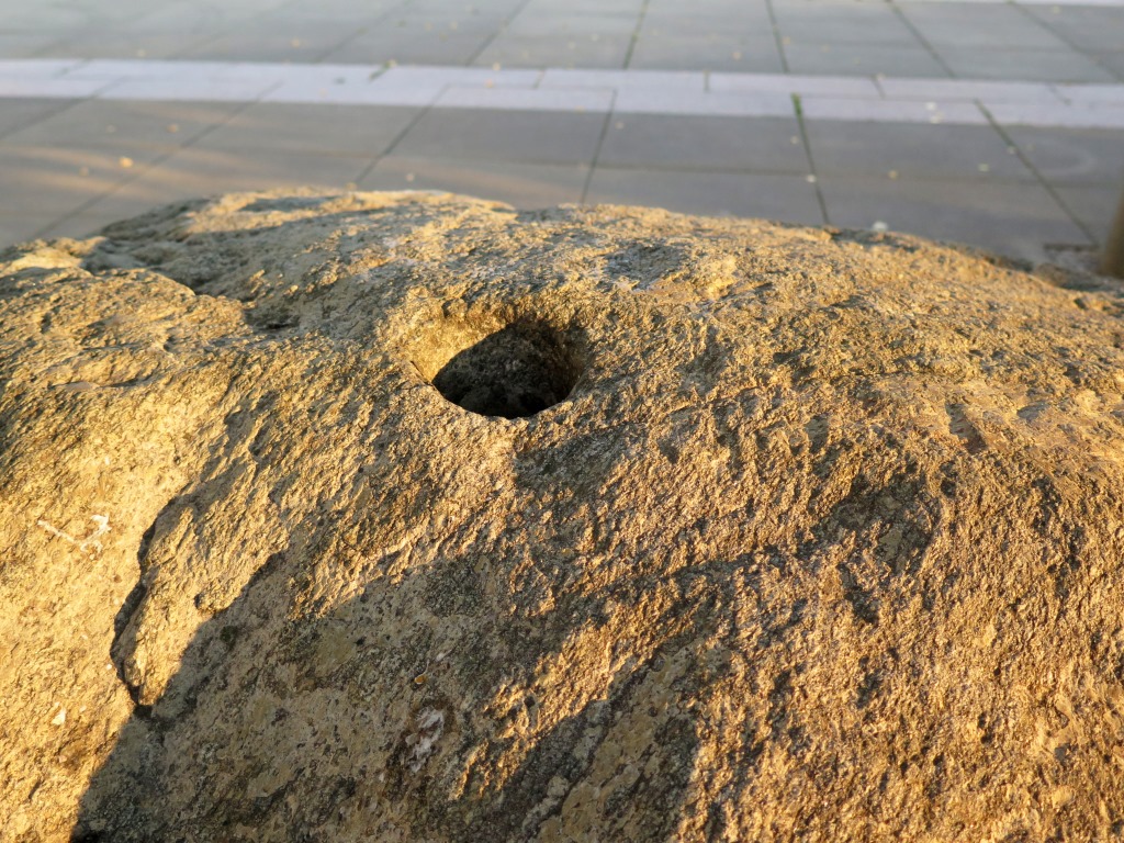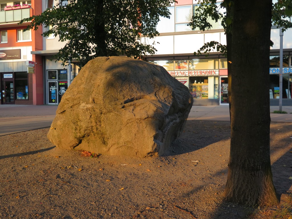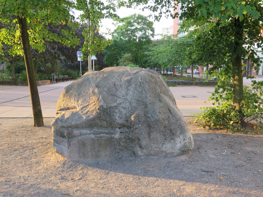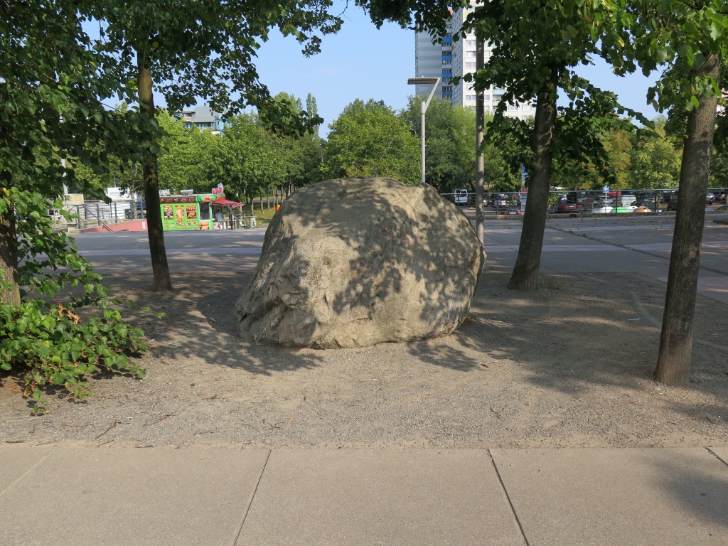 Am nördlichen Zugang zum Boulevard auf dem Anton-Saefkow-Platz liegt ebenerdig ein großer Granit-Findling in einem von vier Bäumen umstandenen Areal (Nicola Vösgen).