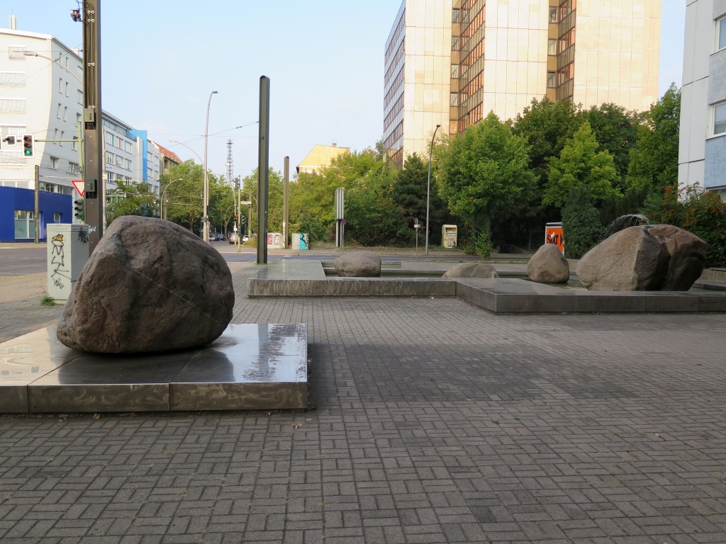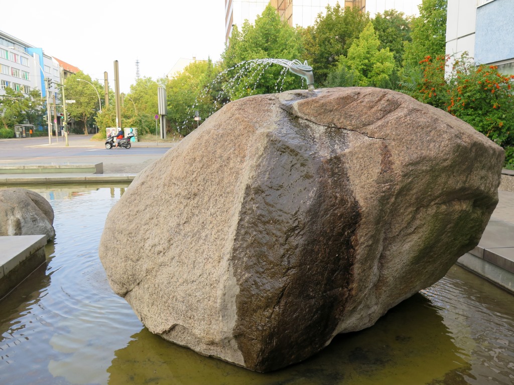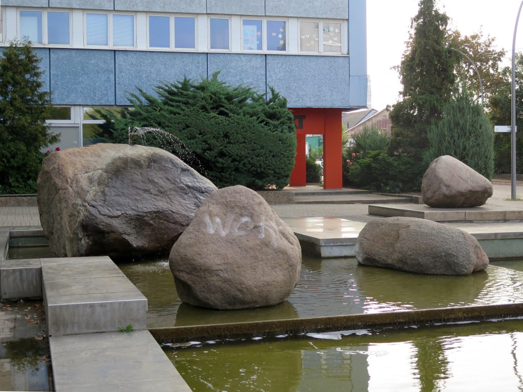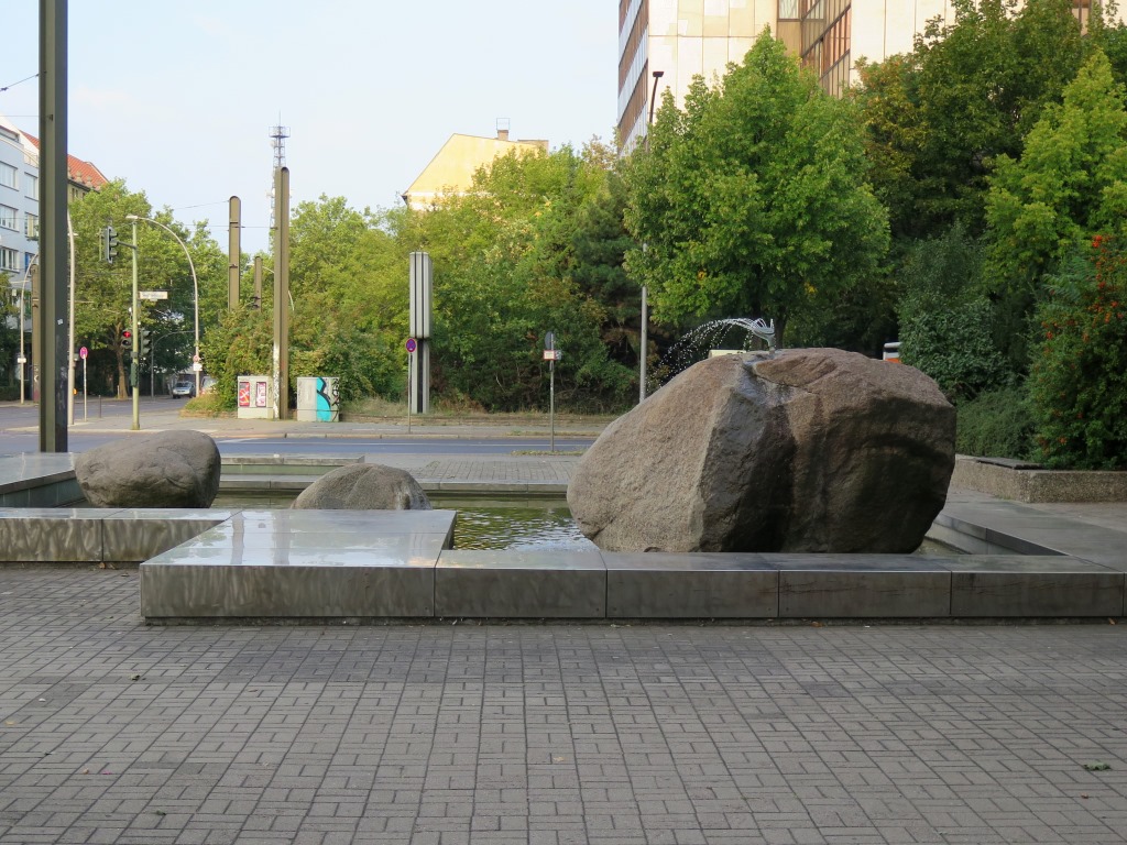 Mehrteilige Brunnenanlage mit Granitfindlingen. In einem Becken liegen auf einem etwas erhöhten mit Edelstahl verkleideten Podest drei Findlinge, von denen einer als Quellstein fungiert und einen fächerförmigen Wasserstrahl aussprüht. In dem darunter liegenden Beckenbereich befindet sich ein weiterer Findling. Das Becken ist von einer niedrigen Umfassungsmauer, die mir Edelstahl verkleidet ist, eingefasst. Östlich neben der Anlage steht ein weiterer einzelner Findling auf einem Edelstahlpodest (Nicola Vösgen).