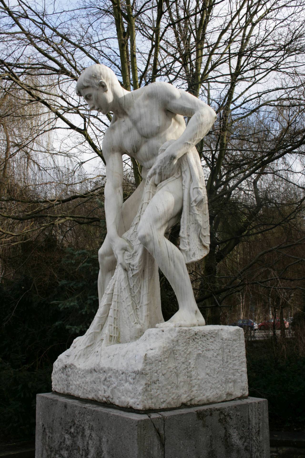 Historischer Hintergrund der Figur sind die Stralauer Fischer und ihr berühmter „Stralauer Fischzug“, der seit 1574 alljährlich ab dem 24. August, dem Bartholomäustag, stattfand. Der Zug beging in einer Festwoche das Anfischen nach der jährlichen Schonzeit zwischen Ostern und Bartholomäus, die Kurfürst Johann Georg von Brandenburg in einem Edikt vom 22. Februar 1574 verfügt hatte. Am 23. August 1873 verbot der amtierende Stralauer Amtsvorsteher das Fest, da es in immer wüstere Saufgelage und Schlägereien ausartete. 1923 (und um das 750-Jahr-Jubiläum Berlins 1987 herum) lebten die Feierlichkeiten nochmals kurzzeitig auf. Felderhoff arbeitete die Skulptur zwischen 1912 und 1916. Durch die ökonomisch unsicheren Bedingungen der Kriegs- und Nachkriegszeit wurde eine repräsentative Aufstellung der Marmorfigur unmöglich. Erst 1925, sechs Jahre nach Felderhoffs Tod, wurde von der Bezirksverordnetenversammlung Geld zur Verfügung gestellt, damit eine Brunnenlage und eine um diesen herum gelegene Fläche zu einer Parkanlage gestaltet werden konnte. 1925/1926 konnten hinter dem Brunnen bereits, im Halbkreis angeordnet, junge Bäume gepflanzt werden. Die Fertigstellung des Parks zog sich noch bis etwa 1929 hin. Die Parkanlage wurde in den 1950er Jahren neu gestaltet (Jörg Kuhn).
