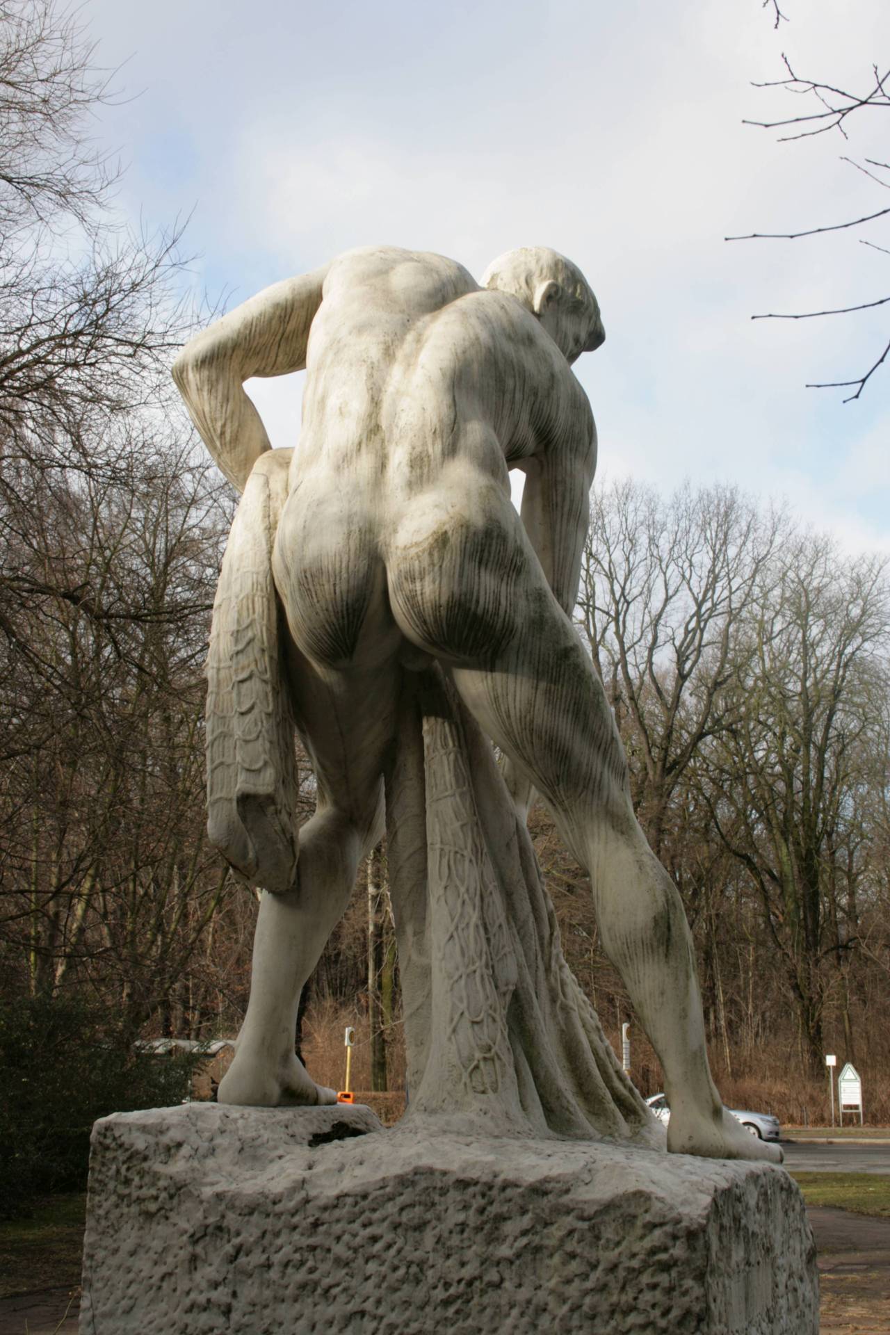 Die Anlage an der Nordseite des Rathauses Treptow beinhaltet ein vertieftes Brunnenbecken, dessen an antike Thermenbassins oder sogar Zeremonialräume erinnernder Grundriss ein Rechteck mit abschließender halbrunder Apsis zeigt, und dessen Betonwände eine Plattendeckung aufweist. Es erhebt sich vor der Apsis auf einem rechteckigen Sockel über in etwa rechteckiger Plinthe eine aus griechischem weißen Marmor gearbeitete Figur eines ideal gebildeten jungen und unbekleideten Fischers mit Fangnetz. Die überlebensgroße Figur wirkt durch die zur Erzeugung von Zugkraft breit auseinander gesetzten, sich gegen das Gewicht des Fangnetzes stemmenden Beine spannungsvoll und strahlt gleichzeitig eine konzentrierte Ruhe aus. Mit beiden Händen zieht er an dem offenbar wohl gefüllten Fischernetz (im Berliner Bezirkslexikon Treptow-Köpenick von 2009 vermuten die Autoren, dass der junge Fischer das Netz zum Auswerfen bereitet) (Jörg Kuhn).