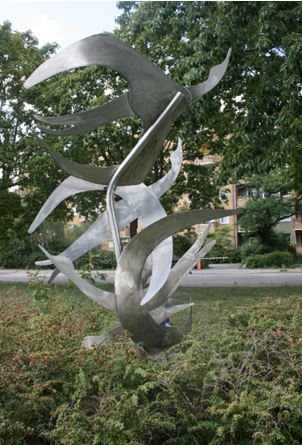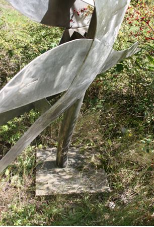 Aus flachen Edelstahlblechen geschnittene und geschweißte Plastik. Sie steht auf einer rechteckigen Betonplatte. Die abstrakten Vogelfiguren sind auf einer sich nach oben biegenden Stütze befestigt. Die Oberflächen zeigen sich wechselnd mattiert, satiniert und angeschliffen (Susanne Kähler, Jörg Kuhn).