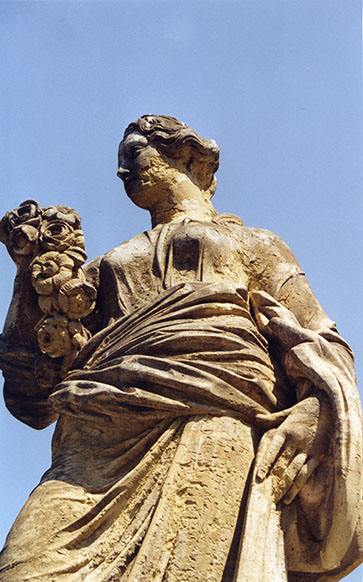 Das Sandsteinstandbild der allegorischen Figur „Flora“ steht im Zentrum des Wegekreuzes in der rechten Hälfe des Orangeriegartens. Ihr Pendant ist das auf der linken Seite stehende Standbild der „Pomona“. Die weibliche Standfigur barocker Prägung ist in ein antikisches Gewand gekleidet. Sie blickt nach rechts, in ihrer rechten Hand hält sie einen nach unten hängenden üppig bestückten Rosenzweig (Susanne Kähler).