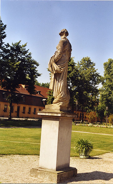 Die Figur wurde zusammen mit der „Pomona“ im Jahr 1890 an dieser Stelle aufgestellt. Clemens Alexander Wimmer vermutet anhand der nachträglich verkleinerten Plinthen und der relativ flachen Rückseiten, dass die „Flora“ sowie die „Pomona“ ursprünglich für eine Dachbalustrade geschaffen worden sind (Wimmer 1992, S. 34). Die für eine niedrige und solitäre Aufstellung relativ ausgewogenen Proportionen sprechen meiner Ansicht nach allerdings dagegen. Wimmer bezweifelt die Zuschreibung an den hauptsächlich in Dresden tätigen Bildhauer Jeremias Süssner, er hält den Duktus eher französisch als italienisch. Die barocken Figuren ergeben, auch als spätere, aus einem anderen Kontext stammende Zutaten, der Parkanlage ein harmonisches Bild (Susanne Kähler).