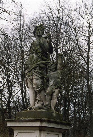 Auf einem rechteckigen, mehrteiligen Sockel steht auf rechteckiger Plinthe eine üppige Frauenfigur, bekleidet mit einem antikisierenden Gewand im barocken Sinne. Die rechte Brust ist unbedeckt. Das Gewand ist vorne unterhalb der Hüfte zusammengeknotet. Das linke Spielbein ist zurückgesetzt. Als Gürtel und als quer über die Brust geführtes Band trägt die Göttin Blütengewinde. In der linken Hand hält sie einen Grantapfel, auf den sich auch ihr Blick richtet. Entsprechend ist der Kopf zur Seite gewendet. Der rechte Arm ist am Körper entlang nach unten geführt. Die Hand stützt sich auf einem Ast ab. Das antikisierend gestaltete Haar ist über der Stirn mit einer Fruchtapplikation geschmückt. Der Figur dient ein teilweise durch das Gewandt verdeckter Baumstumpf (Feigenbaum?) als Stütze. Am Wurzelwerk des Baumstumpfes und zwischen den Beinen der Göttin sind weitere Früchte (Kürbisse oder Melonen etc.) gelagert. Rechts der Göttin steht ein kleiner, bis auf ein faltenreich um die Hüfte geschlungenes Gewandstück unbekleideter Putto mit dicklich, kindlichem Körper. Seinen rechten Fuß am vorgestellten rechten Bein hat er auf einen Gegenstand (Frucht, Stein?) aufgestellt. Mit dem rechten Arm hält er sein knappes Gewand, der linke Arm ist gerade nach oben ausgestreckt. In der linken Hand hält auch der Putto eine Frucht. Weitere Früchte und Blattwerk sind in sein antikisierend formuliertes Haar kranzartig eingewoben. Die weibliche Figur selbst lässt sich sowohl als Flora als auch als Pomona interpretieren. Die Anwesenheit des Putto dient auch nicht unbedingt zur Klärung dieser Frage, doch passt er thematisch besser zur Flora. Gleichzeitig lässt sich die zweifigurige Gruppe als Jahreszeitenallegorie verstehen, etwa als Sommer oder Herbst, oder aber als Allegorie eines „Erntemonats“. (Susanne Kähler/Jörg Kuhn)