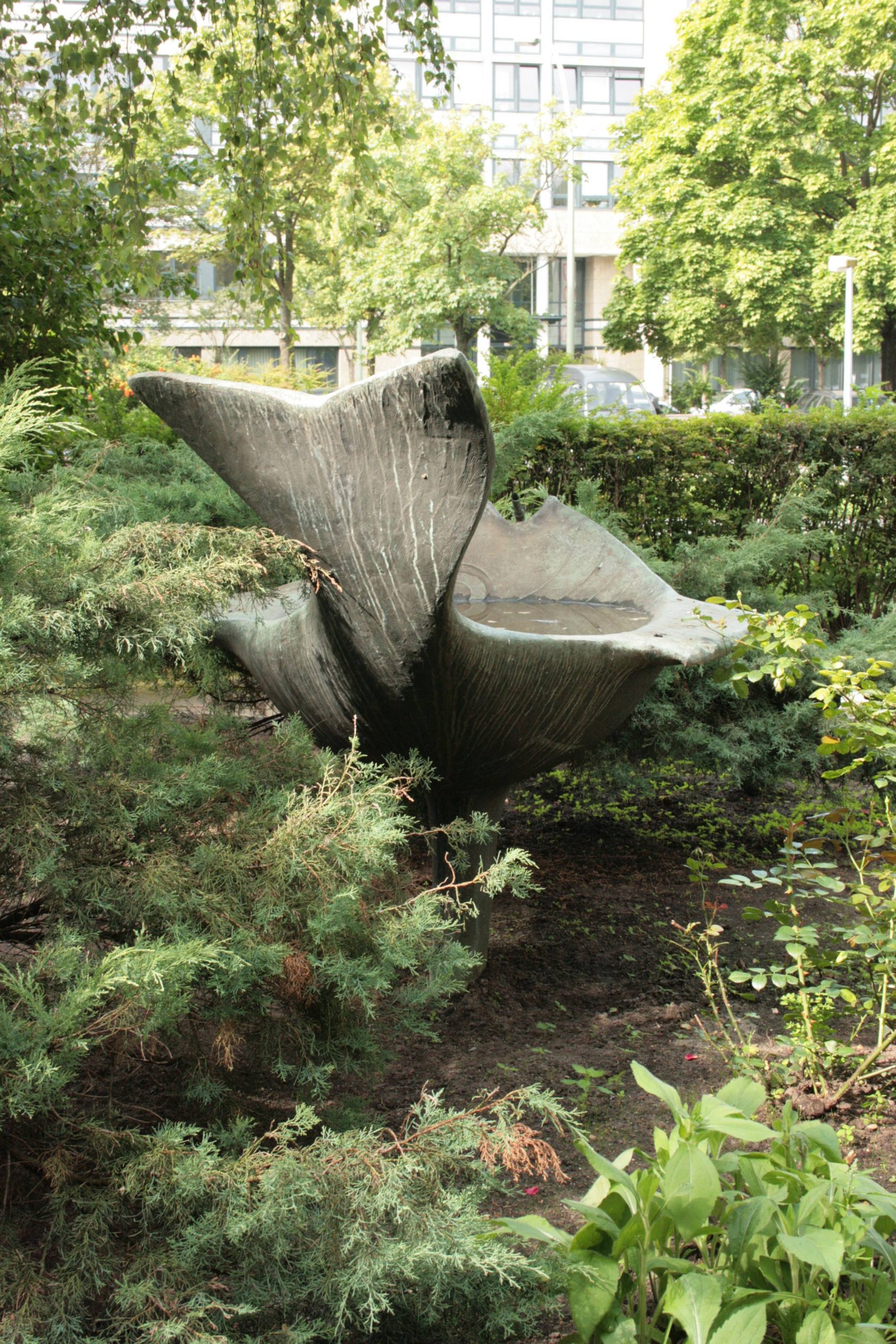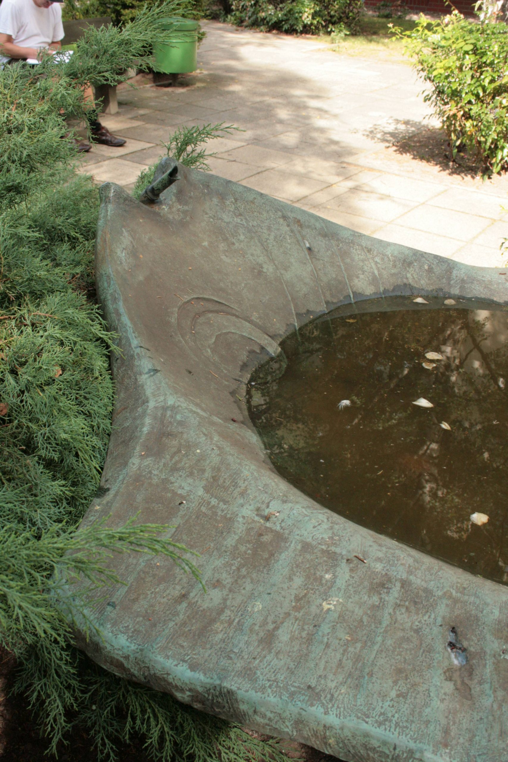 In der Grünanlage zwischen zwei Hausriegeln der wohl aus den 1960er Jahren stammenden Wohnanlage steht in einem vermutlich in 1980er Jahren angelegten, rechteckigen und mit steinernen Schwellen eingefassten Pflanzbeet der bronzene Brunnen in Gestalt einer Flunder. Auf einem kielförmigen Fuß liegt waagerecht der Fisch, die Schwanzflosse hoch aufgerichtet. Der Körper ist so geformt, dass er eine tiefe Beckenmulde bildet, in der sich das Wasser sammelt. Der Brunnen hat somit heute die Funktion einer Vogeltränke. Ein Auge ist vom Fisch sichtbar. Im Bereich des Maules sitzt der bronzene Wasserauslauf. Das Wasser sollte wohl ursprünglich über die Seitenflossen des Fisches herabfließen. Ein Auffangbecken unterhalb des Brunnens in Tiergestalt ist nicht mehr vorhanden, die Brunnenfunktion ist außer Betrieb (Jörg Kuhn).