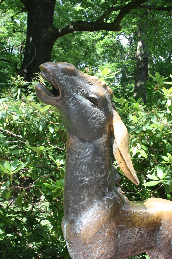 Auf einem gemauerten rechteckigen Sockel steht auf einer rechteckigen Kunststeinplatte plinthenlos die aus zwei Tieren bestehende Fohlengruppe. Vom Weg aus betrachtet steht zuerst ein Pferdefohlen, bei gedrehtem Hals den Kopf dem Betrachter frontal zugewendet. dahinter und weiter nach links vorgestellt steht ein Eselfohlen, den Kopf mit den herabhängenden Ohren erhoben, offenbar Laute von sich gebend. Stilisierung und Naturbetrachtung halten sich in der Formulierung etwa die Waage – wobei eine Idealisierung und Typisierung der Tiere festzustellen ist. Die vermutlich absichtsvoll unterschiedliche Patinierung ist durch Nutzabrieb zusätzlich je nach Körperbereich variierend (Jörg Kuhn).