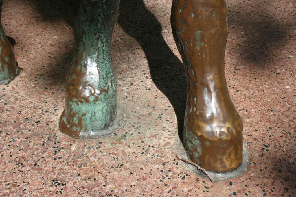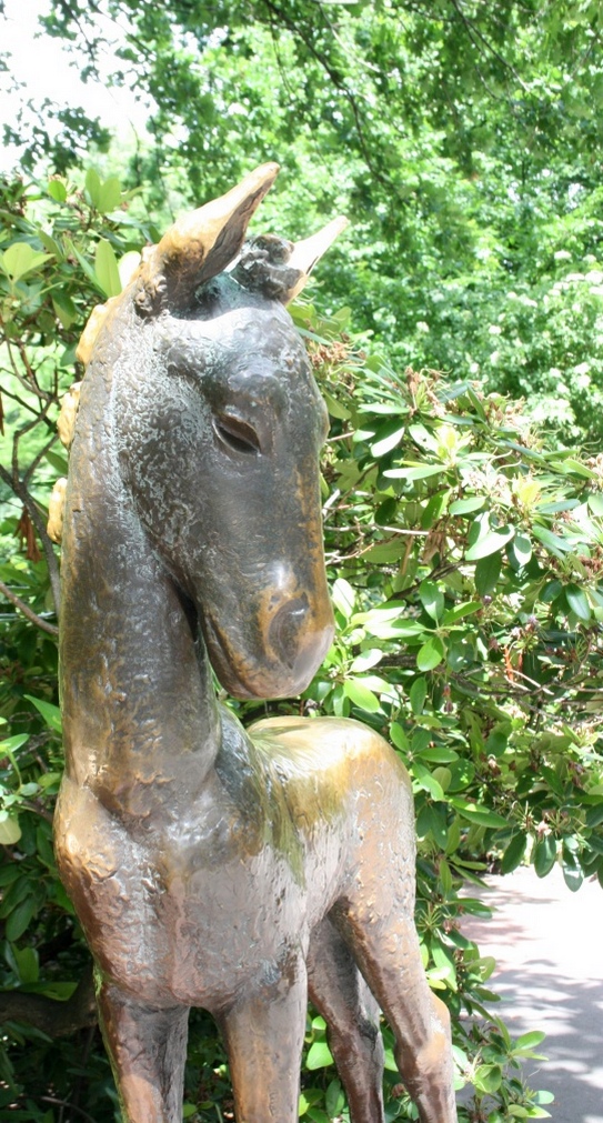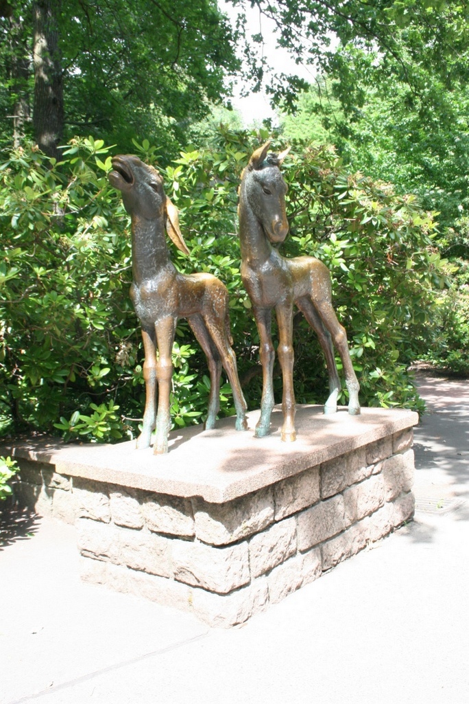 1955 entstanden und auf dem Gelände der Grundschule am Weißen See auf dem Becken eines Trinkbrunnens aufgestellt. Einige Jahre später, 1958, wurde die Gruppe als "Geschenk des Magistrats von Ost-Berlin, am jetzigen Standort" aufgestellt und 1959 wurde die Anordnung der Tiere auf Wunsch des Künstlers verändert. "Einst standen die sich die beiden Fohlen gegenüber", seit 1959 "stehen die Tiere versetzt nebeneinander" (vgl. Stefanie Endlich: Skulpturen und Denkmäler, 1990, S. 268). Die Gruppe wurde "inzwischen von Millionen von Kindern nicht nur 'begriffen' sondern auch 'besetzt' (...) Das vor dem hinteren Eselfohlen stehende Pferdefohlen war bereits 'durchgeritten' und wurde von der Bildgießerei Seiler aus Schöneiche wiederhergestellt" (E. Matthies, 2009, S. 54).