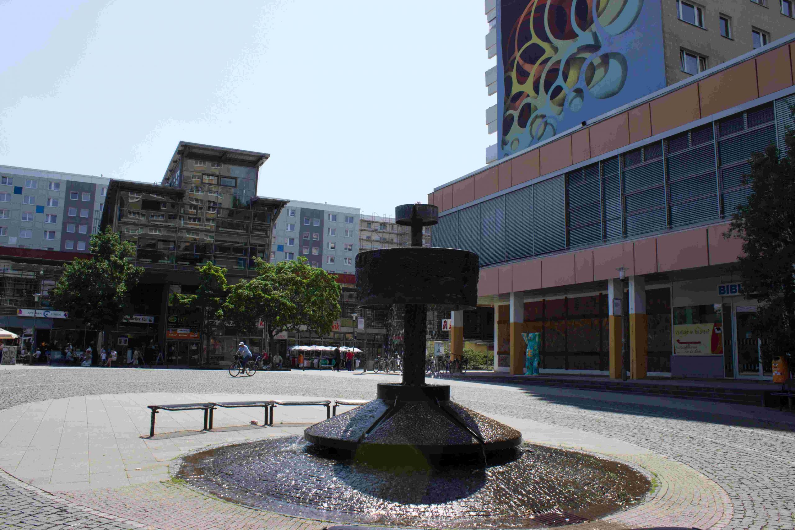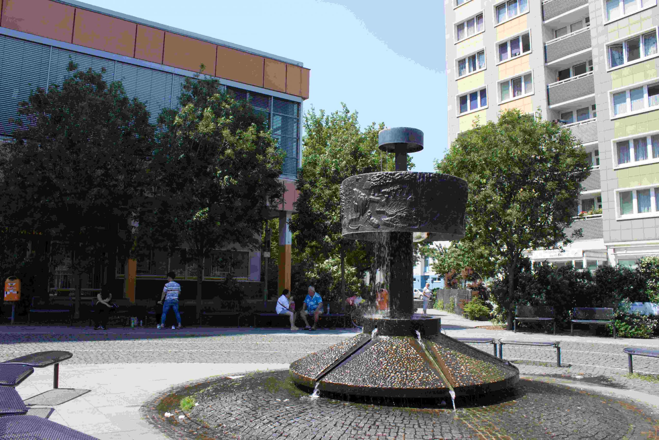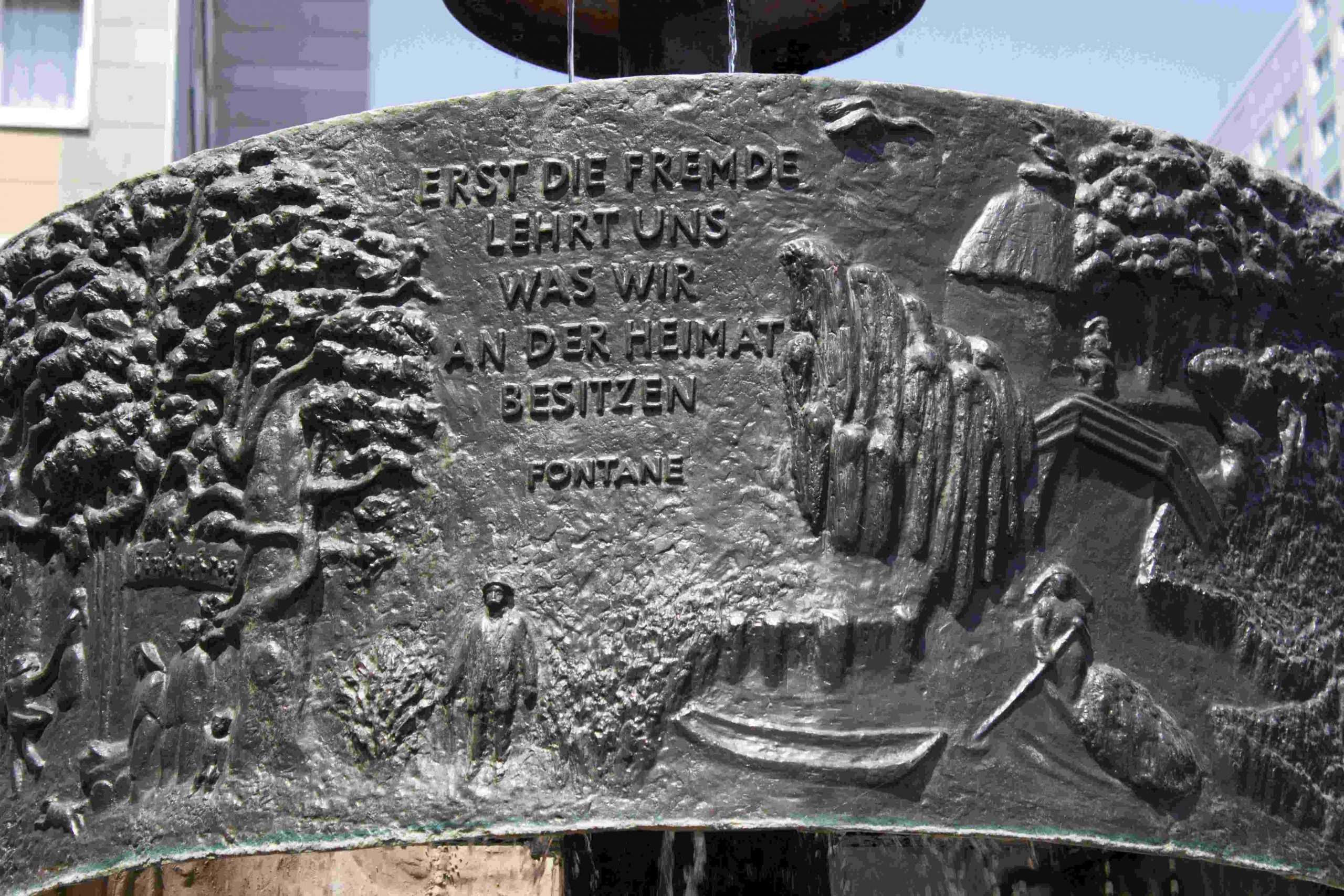 Der Fontanebrunnen wurde im Jahre 1982 vom Bildhauer Hans-Detlef Hennig (1927-2017) geschaffen. Im Rahmen der Errichtung von Neubauvierteln in den 1970er Jahren – insbesondere auch im Bezirk Lichtenberg – gab es die staatliche Vorgabe, dort auch Raum für gesellschaftliche Zentren zu schaffen. Neben Einkaufsmöglichkeiten und Dienstleistungen sollten kleine Grünanlagen mit Sitzgelegenheiten und Blumenbeeten, Springbrunnen und Skulpturen den gesamten Komplex verschönern. Künstler der früheren DDR erhielten den Auftrag, Brunnen und Skulpturen zu erschaffen, die anschließend vom damaligen Ost-Berliner Magistrat nach internen Wettbewerben ausgewählt und finanziert wurden. Für den Bereich an der Erich-Kurz-Straße 7-9, an der heutigen Dathepromenade, wurde der Fontanebrunnen ausgewählt. 1998 wurde der Bronzeteil des Brunnens restauriert. Im Zeitraum 2005 bis 2008 erfolgte eine Neugestaltung der ursprünglichen Basisanlage des kreisförmigen Hauptbeckens. Dabei wurde das schlichte Betonbecken mit einem Basaltmosaik neu gestaltet. Gleichzeitig wurde die Dathepromenade, benannt nach dem Direktor des Tierparks Friedrichsfelde, Heinrich Dathe (1910-1991), mit verschiedenfarbigen, ellipsenförmig angeordneten Basaltsteinen versehen. Bis zu der Neugestaltung des Heinrich-Dathe-Platzes stand der Brunnen sehr verloren zwischen teils 10-geschossigen Wohngebäuden. Erst nach der Neugestaltung entwickelte sich der Fontanebrunnen zu einem zentralen Element des Heinrich-Dathe-Platzes auf der Dathepromenade. Leider ist das Bronzerelief mit der Inschrift und den märkischen Motiven des Dichters Theodor Fontane zu hoch angebracht und so für flanierende Menschen kaum erkennbar. Im Juni 2019 musste die Brunnenanlage kurzfristig wegen ungeklärten hohen Wasserverlustes außer Betrieb genommen werden. Anzumerken ist, dass ein zweiter Fontanebrunnen in Frankfurt (Oder) steht. Der Brunnen wurde 1984 vom Bildhauer Hans-Detlef Hennig und vom Keramiker Manfred Wenck geschaffen. Anders als der Fontanebrunnen in Berlin enthält dieser Brunnen ein Bronzerelief mit ländlichen Motiven aus der Mark Brandenburg, wie Bauern die Getreide mähen, einen Schäfer mit seiner Herde usw. Nur das Zitat ...ERST DIE FREMDE... ist gleich (zusammengestellt von Yasemin Isabel Kunter auf der Grundlage von: https://www.goruma.de/staedte/frankfurt-oder/sehenswuerdigkeiten, 24.07.2019, 19:40 Uhr; https://de.wikipedia.org/wiki/Heinrich_Dathe, 25.07.2019, 15:39 Uhr; https://de.wikipedia.org/wiki/Liste_der_Brunnenanlagen_im_Berliner_Bezirk_Lichtenberg, 27.07.2019, 20:00 Uhr. Inforoute Platte & Co Am U-Bahnhof Tierpark).