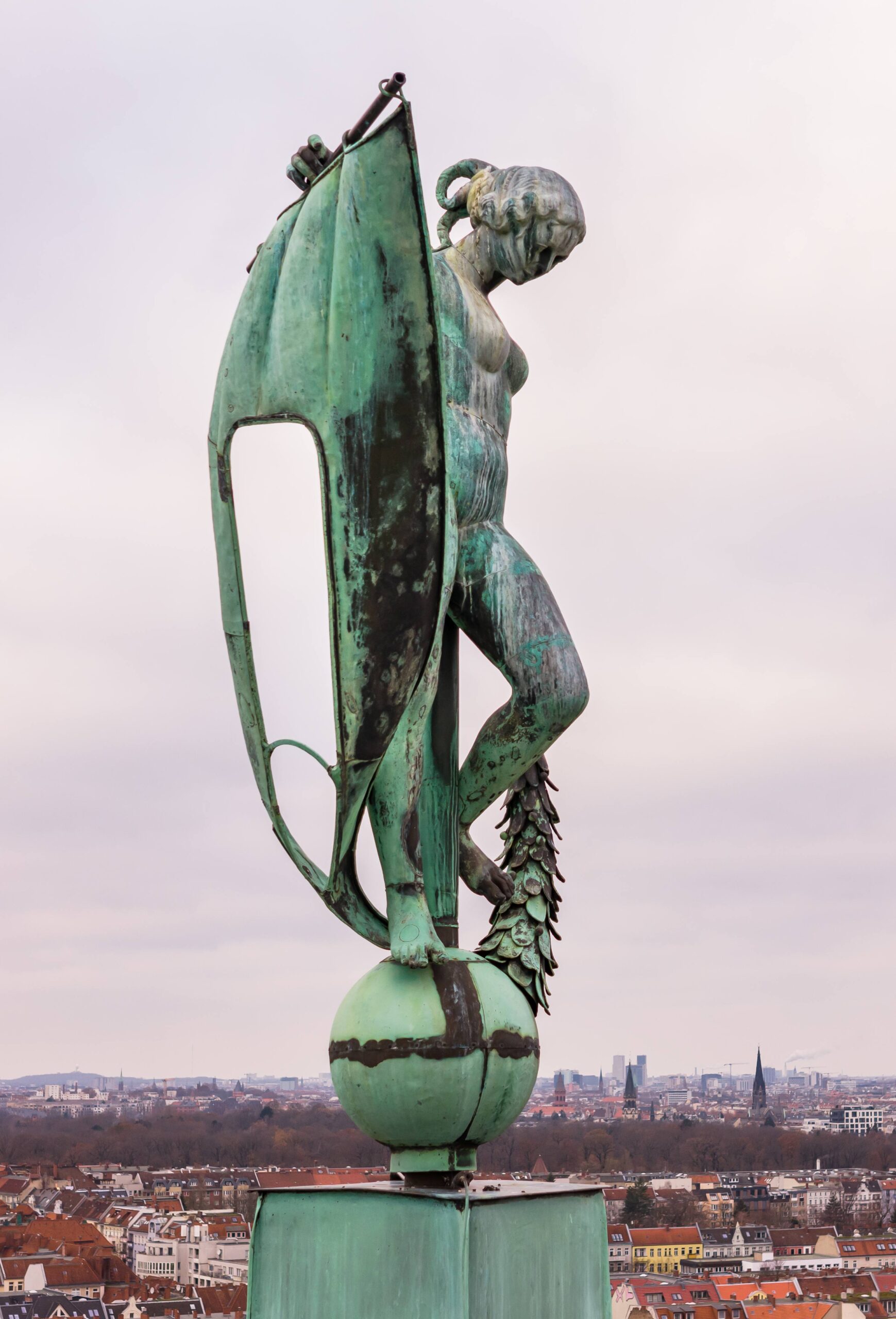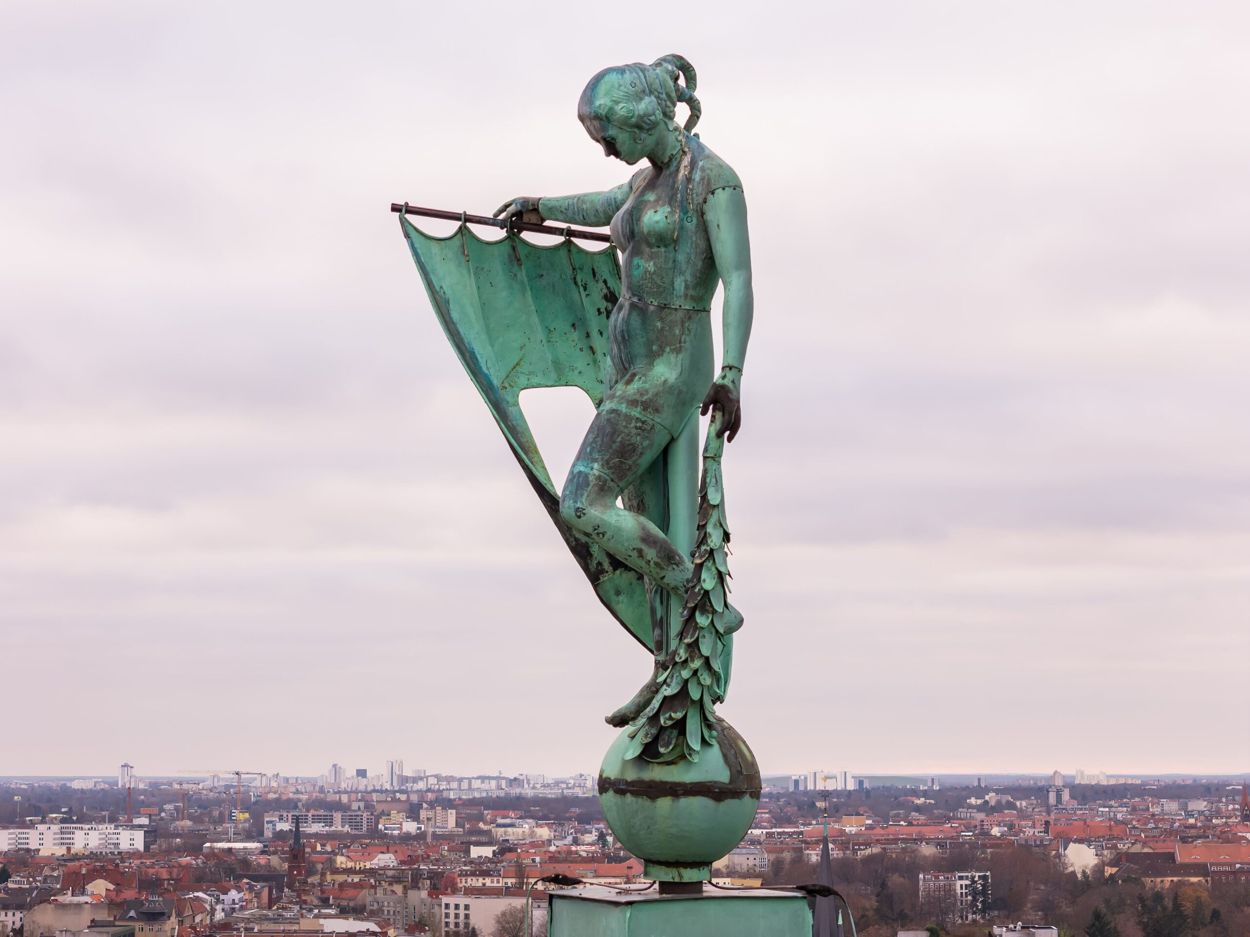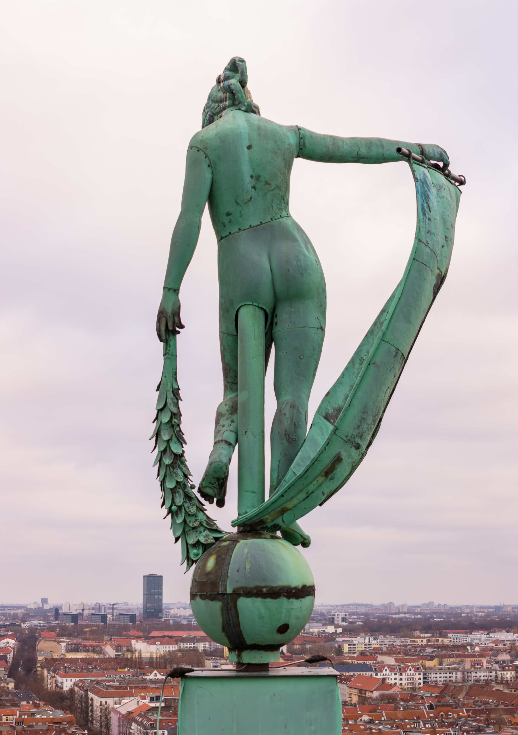 Auf der Spitze des kupfergedeckten Turmes des Rathauses Neuköllns steht die Statue der Glücksgöttin Fortuna. Die überlebensgroße Gestalt steht auf einer Weltkugel, in der linken Hand hält sie eine herabhängende Lorbeergirlande, in der Rechten ein großes Segel (Nicola Vösgen).