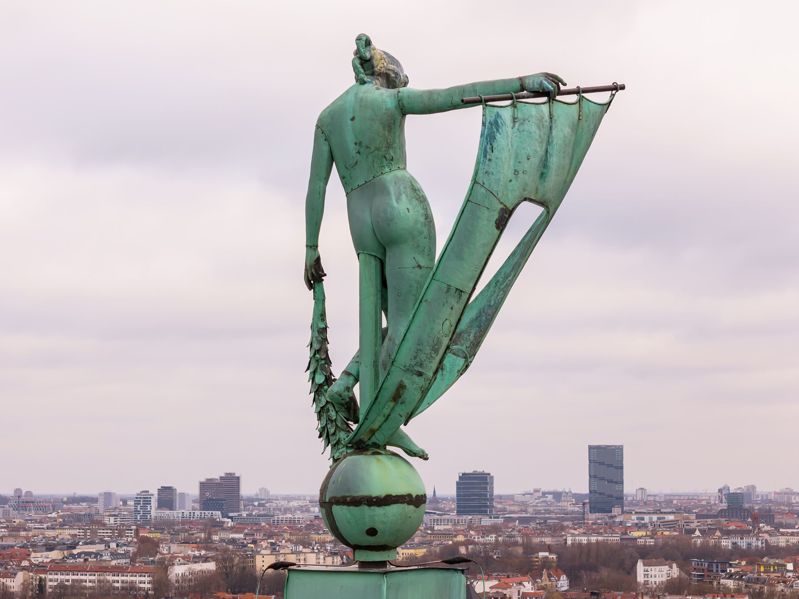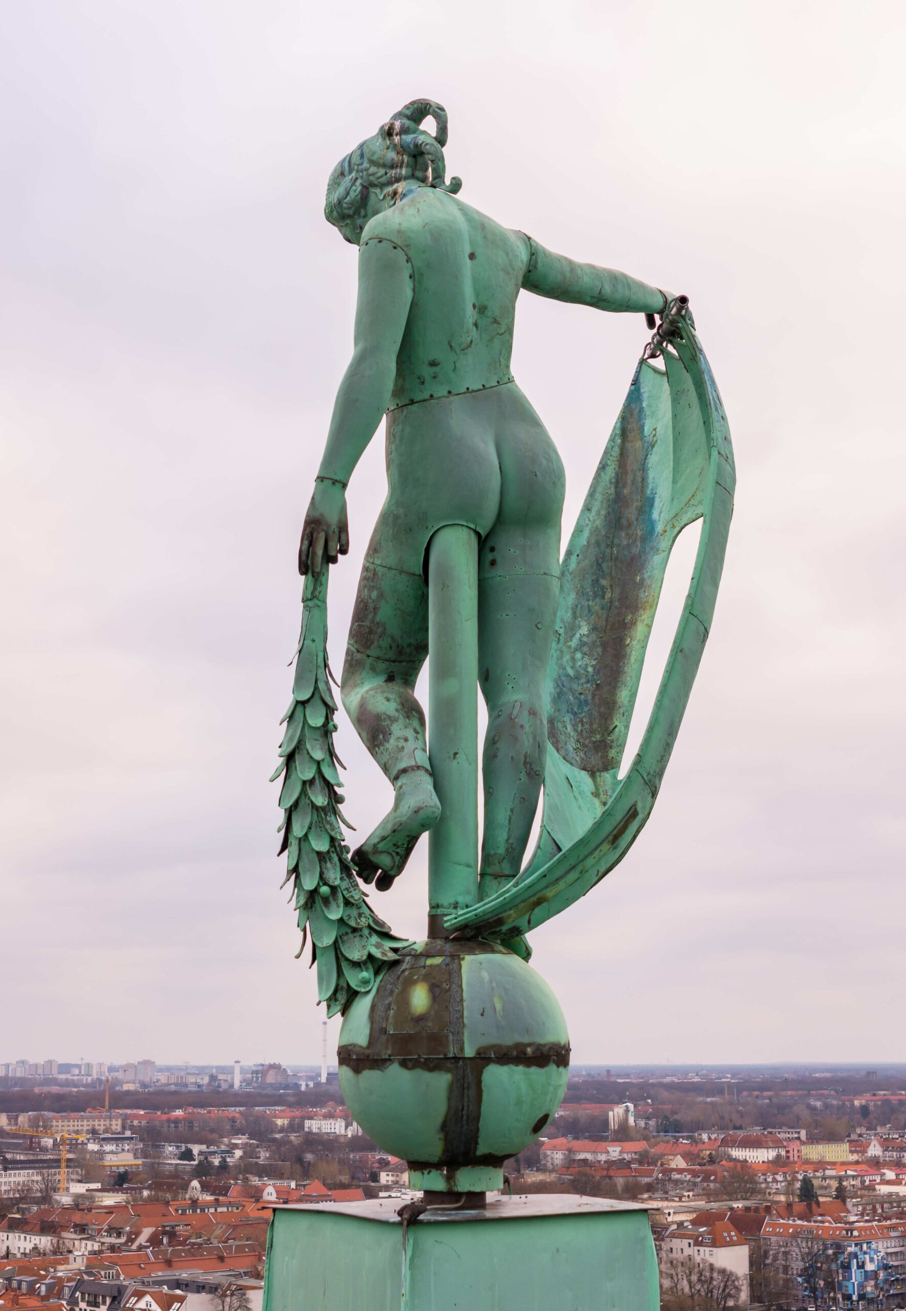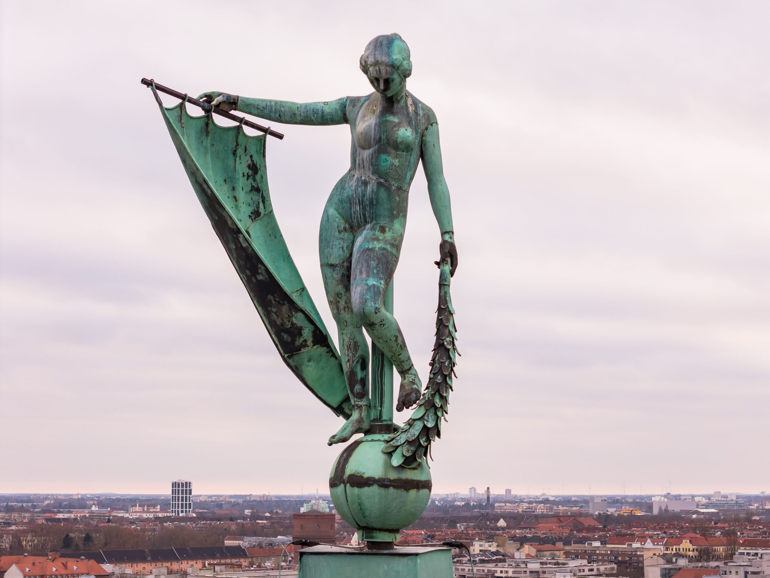 Auf der Spitze des kupfergedeckten Turmes des Rathauses Neuköllns steht die Statue der Glücksgöttin Fortuna. Die überlebensgroße Gestalt steht auf einer Weltkugel, in der linken Hand hält sie eine herabhängende Lorbeergirlande, in der Rechten ein großes Segel (Nicola Vösgen).