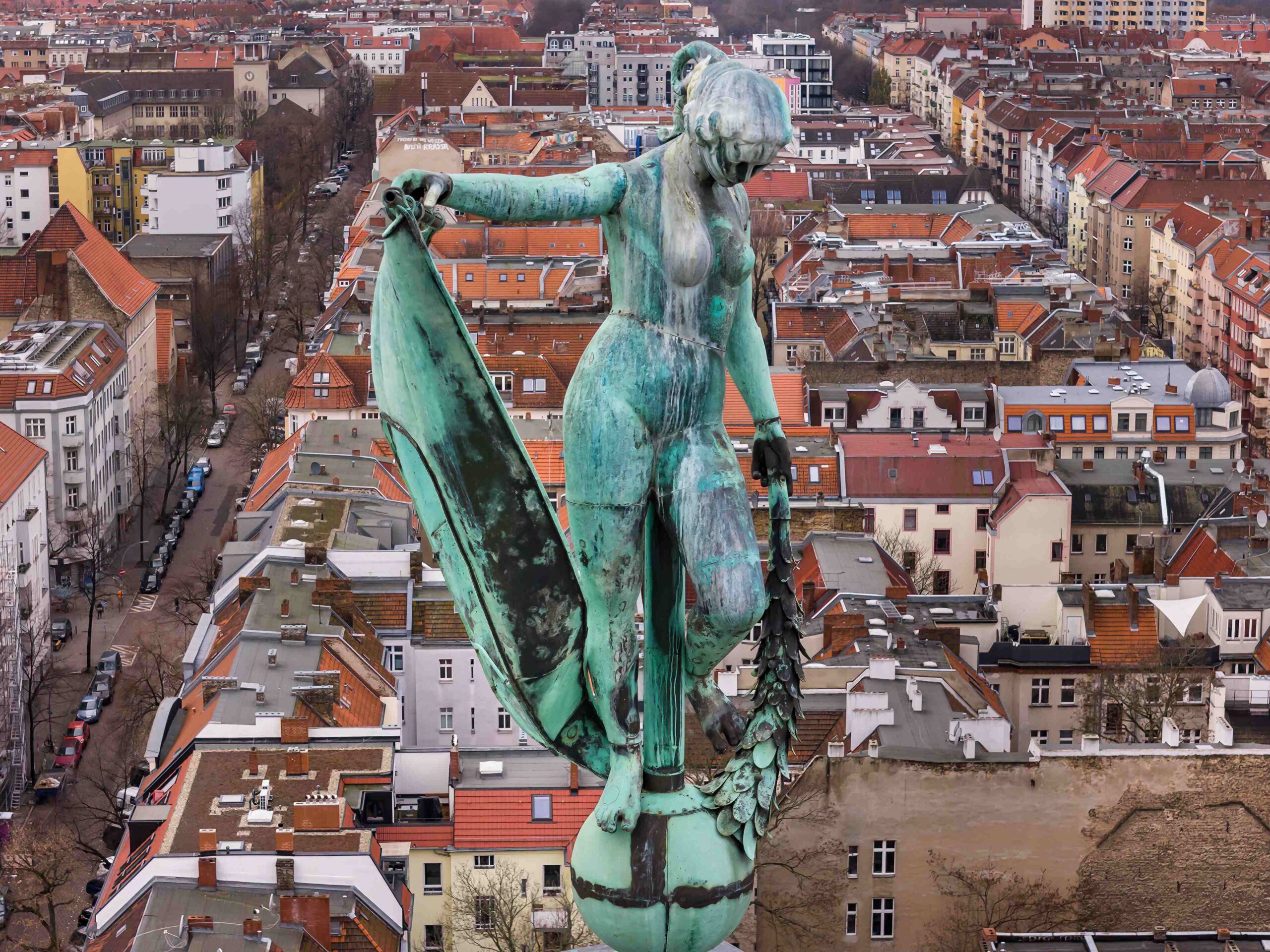 Auf der Spitze des kupfergedeckten Turmes des Rathauses Neuköllns steht die Statue der Glücksgöttin Fortuna. Die überlebensgroße Gestalt steht auf einer Weltkugel, in der linken Hand hält sie eine herabhängende Lorbeergirlande, in der Rechten ein großes Segel (Nicola Vösgen).