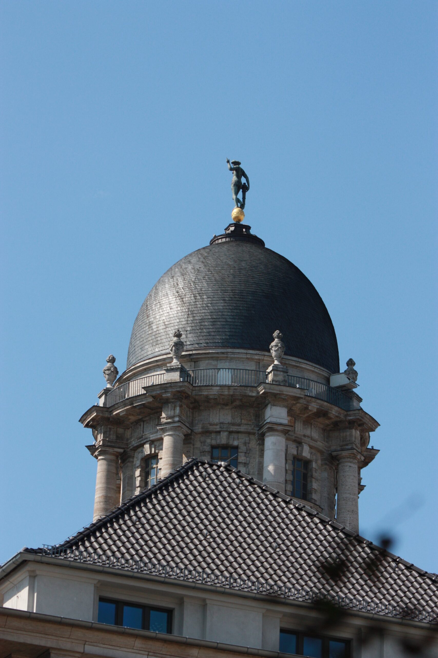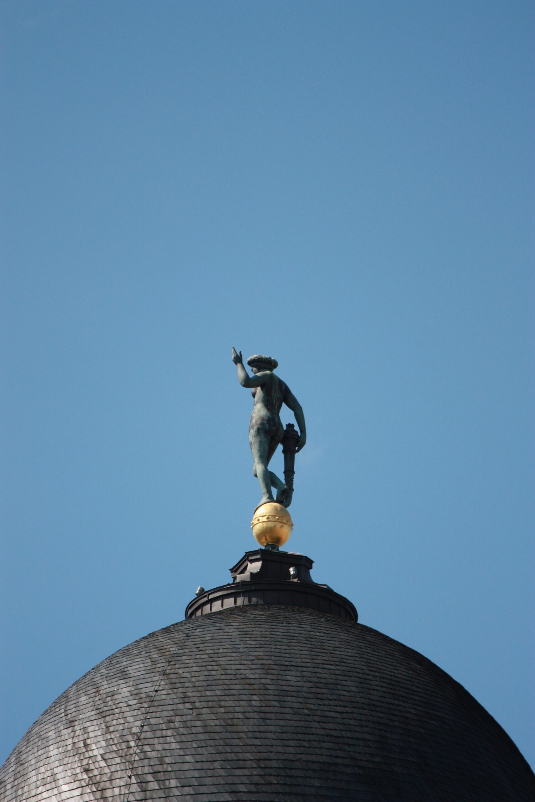 Auf der Turmkuppel des Alten Stadthauses steht auf einer vergoldeten (Welt-)Kugel die Statue einer Fortuna, der Glücks- und Schicksalsgöttin der römischen Mythologie. Sie ist dargestellt als weit überlebensgroße weibliche Aktfigur mit einem von der rechten Hand gestützten, nach oben geöffneten Füllhorn und erhobener linker Hand, ihr Kopf ist mit Lorbeer umkränzt (Nicola Vösgen).