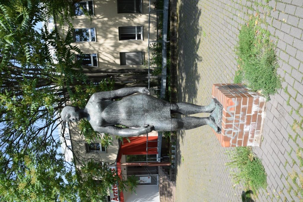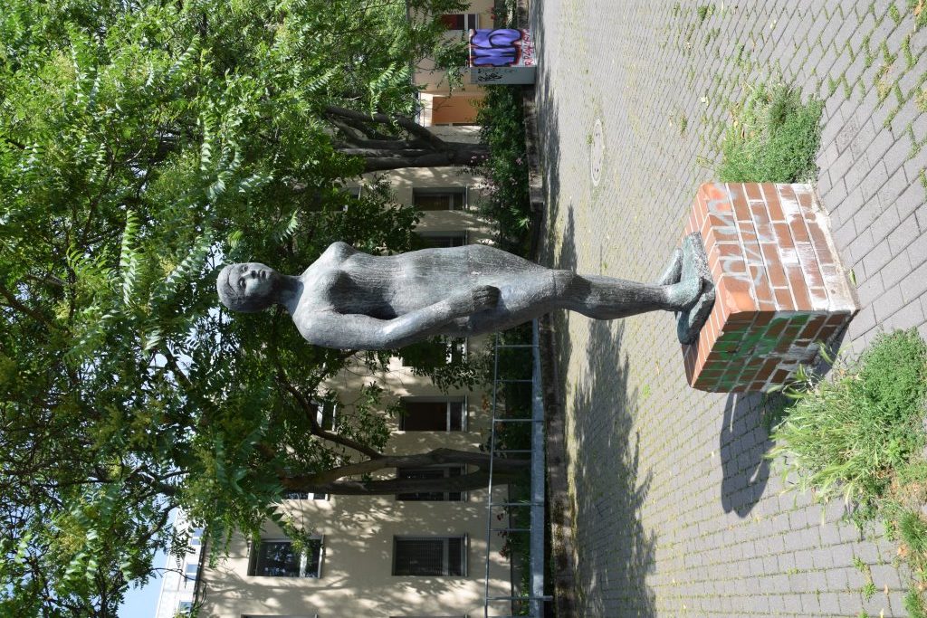 Die Bronzeplastik „Frau“ von Karl Lemke aus dem Jahr 1975 (23.07.1975) schmückt die Grünfläche vor dem Ärztehaus am Rosenfelder Ring 15 in Friedrichsfelde.