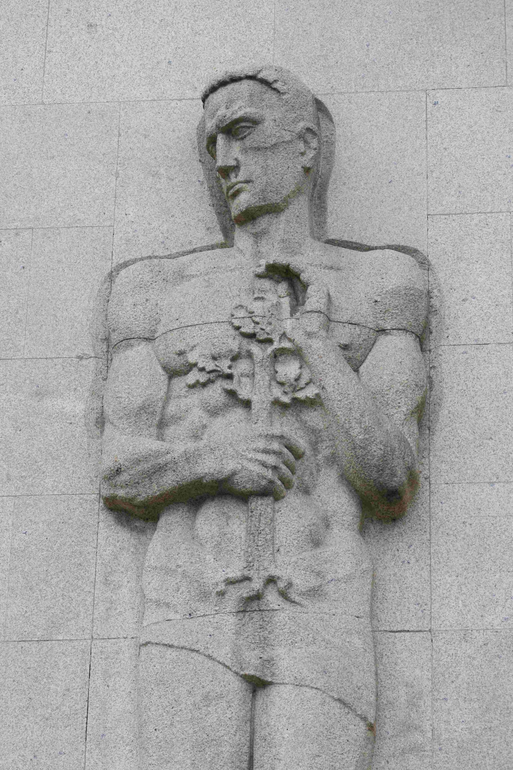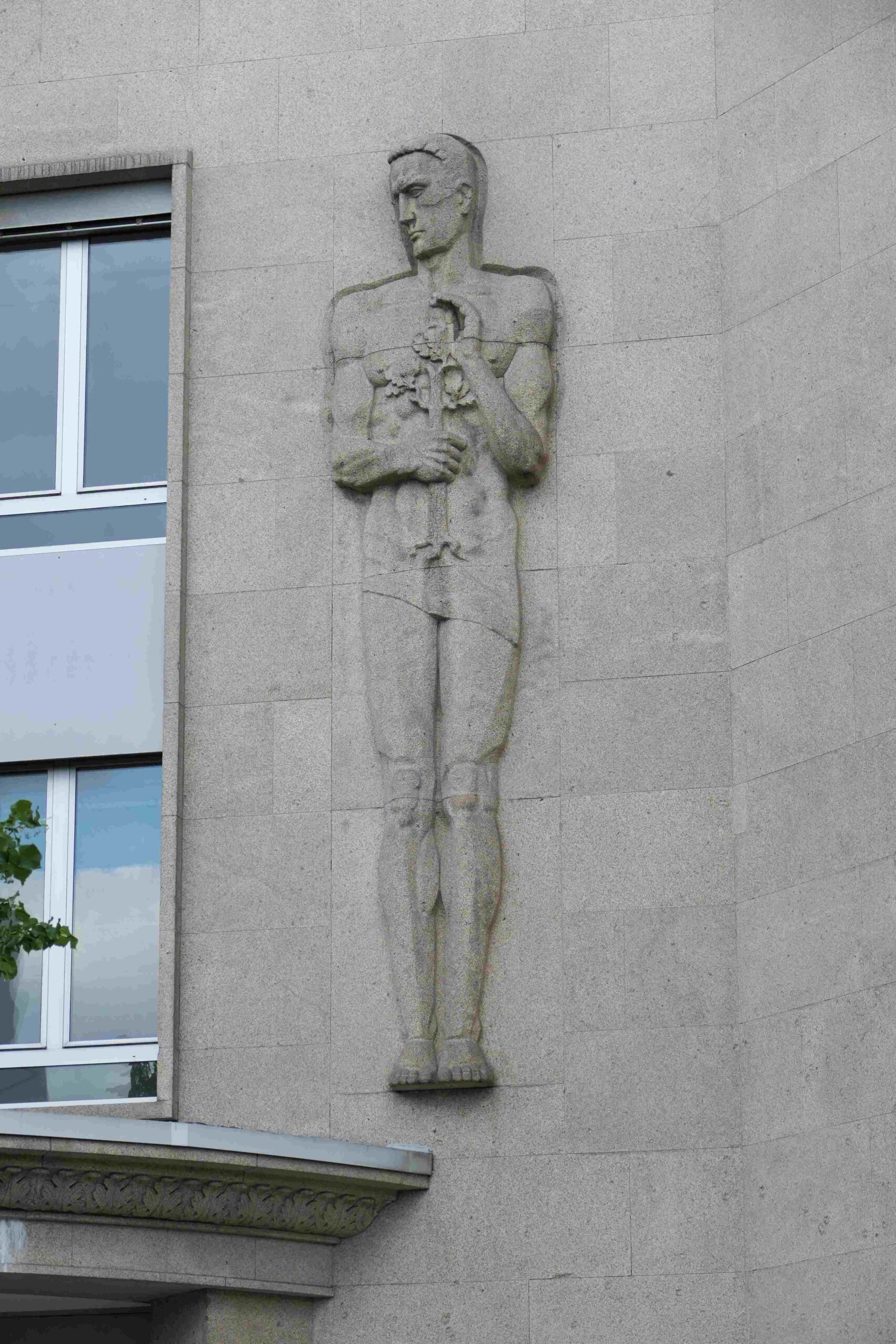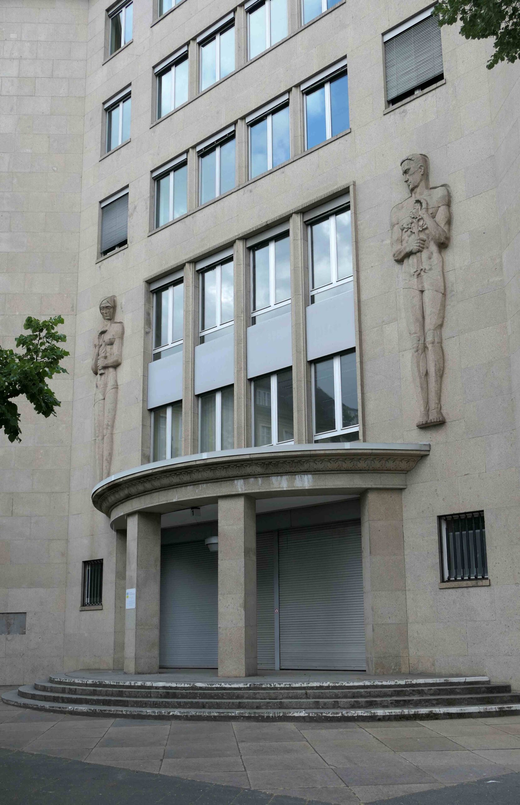 Der südlich gelegene Haupteingang des ehemaligen Verwaltungsgebäudes des Deutsche Arbeitsfront-Versicherungsring wird durch einen halbrund vorspringenden, von zwei Pfeilern getragenen Vorbau betont. Über das erste und zweite Geschoss ist eine vierteilige Fensterfläche gezogen, die in gesamter Höhe von zwei ca. 6 Meter hohen, figürlichen Darstellungen flankiert wird. Links eine Frau, die mit der rechten Hand eine Flamme schützt, rechts ein Mann, der in seiner rechten Hand eine kleine Eiche hält, die er mit der Linken schützend bedeckt (Nicola Vösgen).