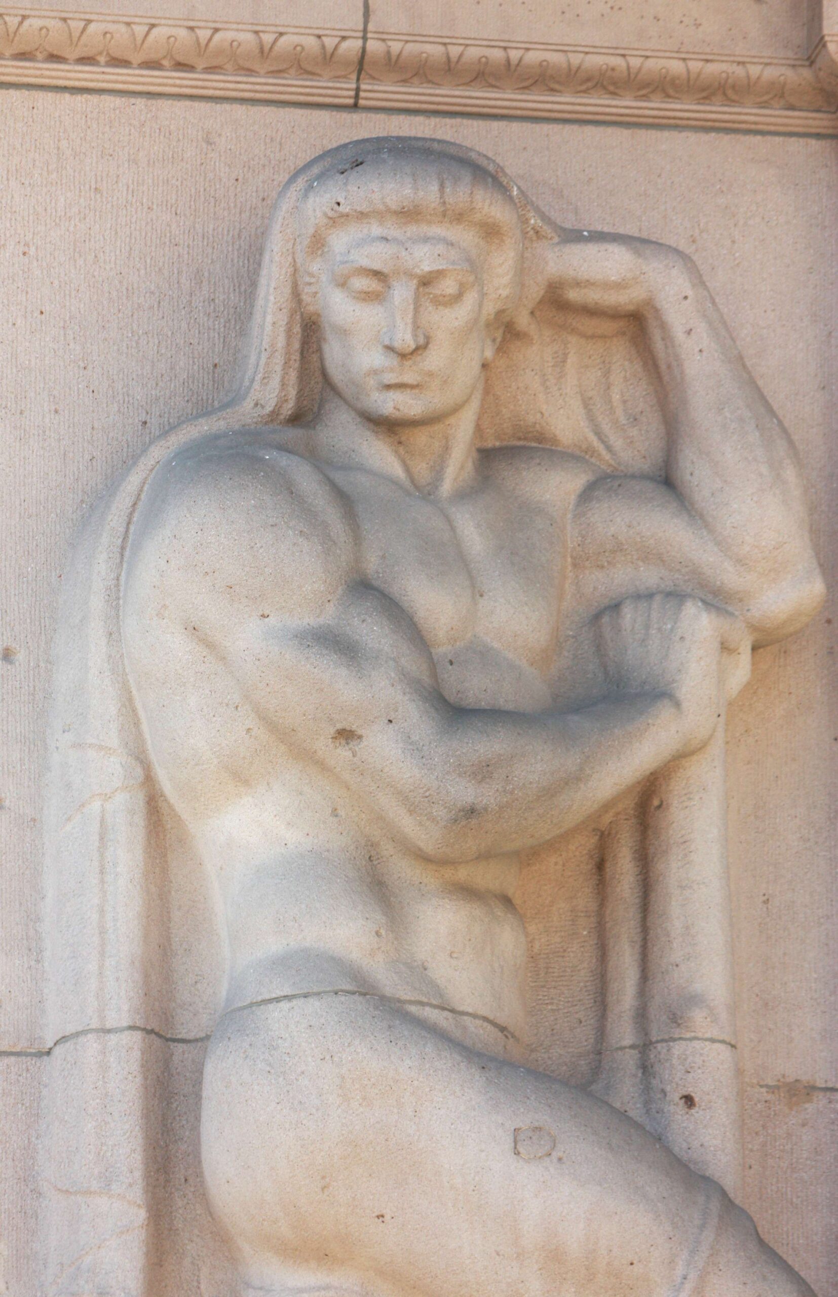 An der Freiherr-vom-Steinstraße befindet sich an dem nach Osten gerichteten hinteren Flügel des Rathauses Schöneberg ein als Wandrelief gestaltetes Denkmal für den Staatsmann Heinrich Friedrich Karl Reichsfreiherr vom und zum Stein (1857 – 1831). Das Portraitmedaillon des Freiherrn vom Stein wird zu beiden Seiten von athletischen männlichen Figuren flankiert, die offenbar gerade aus tiefem Schlaf erwachen. Sie sind als Allegorien auf den durch Stein erweckten „deutschen Gedanken“ zu verstehen. Der linke Athlet stützt mit dem quer über dem Oberkörper geführten rechten Arm eine Waffe (?), auf der auch der linke Oberarm ruht. Die rechte Figur hält in ihrer rechten Hand eine Fackel, der mit einem Tuch bedeckte linke Arm ist hinter dem Kopf erhoben.