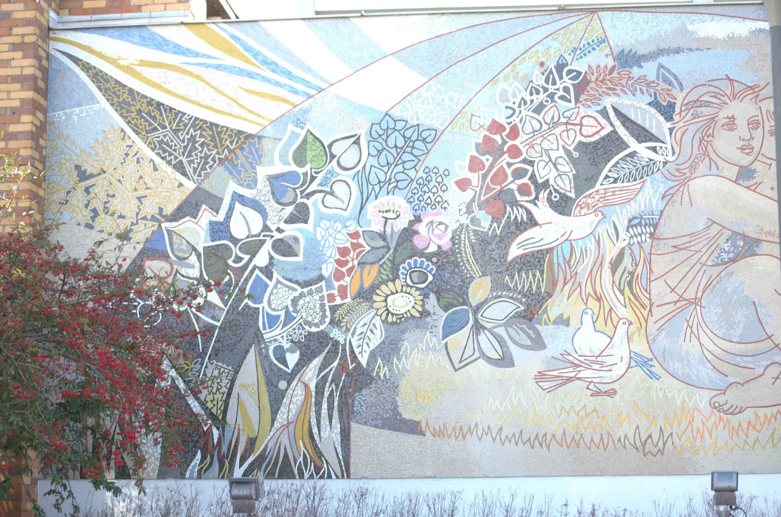Das Wandmosaik mit dem Titel “Frieden” ziert die Längsseite einer Gaststätte an der Marzahner Promenade. Es handelt sich um ein “querrechteckiges Außenwandbild […] an der fensterlosen Südwestaußenwand eines Gaststättengebäudes. […] [Es] stellt eine Mutter mit ihrem Kind in einer schönen und harmonischen Natur unter das Zeichen der Friedenstaube. Sie wird im Bild von einer Sonne und der Profilzeichnung einer jugendlichen Frau überblendet. So soll das Bild veranschaulichen, dass ein glückliches und gesundes Leben nur in Frieden möglich ist. Natürliche Gelb-, Sand- und Ockerfarben dominieren die Erscheinung des Bildes, so dass sich die Mosaikgestaltung in die von Klinkerfassaden geschmückte Architektur der Marzahner Promenade harmonisch einfügt.” (Quelle: Goldberg 2008, Kunst in der Großsiedlung, S. 135). Das Wandmosaik reiht sich in die ideologische Konzeption der Marzahner Promenade.