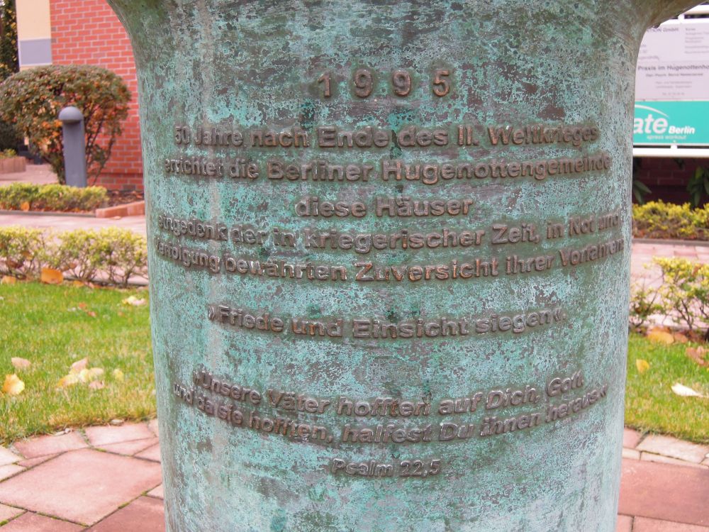 »1995 / 50 Jahre nach Ende des II. Weltkrieges / errichtet die Berliner Hugenottengemeinde / diese Häuser / eingedenk der in kriegerischer Zeit, in Not und / Verfolgung bewährten Zuversicht ihrer Vorfahren: / "Friede und Einsicht siegen". / "Unsere Väter hoffen auf Dich, Gott, / und da sie hoffte, halfest Du ihnen heraus." / Psalm 22,5«