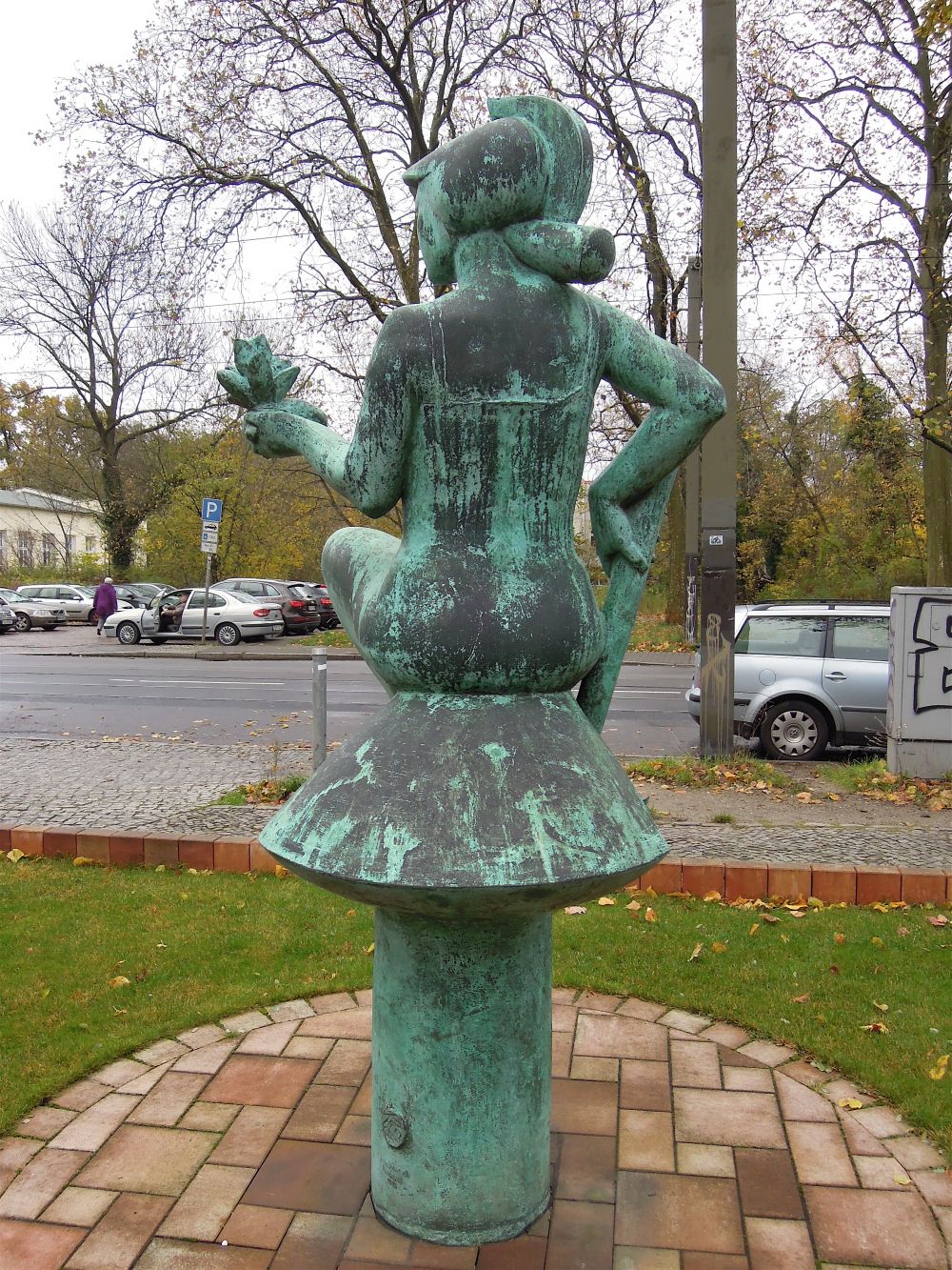 Im Mittelpunkt eines gepflasterten Rondells steht ein bronzener Säulensockel, auf dem eine lebensgroße weibliche Bronzefigur sitzt. Sie stellt eine Bäuerin mit nacktem Oberkörper dar, die in der linken erhobenen Hand wohl eine Kartoffelknolle hält, aus der eine Artischocke hervorwächst. Der rechte Arm ist nach hinten gerichtet, der eine Kriegsfackel löscht. Er hält einen Gegenstand, der ebenso einen großen Ham-mer anklingen lässt. Ihr Kopf ist helmartig mit einer Schirmmütze bedeckt, in der am Hinterkopf eine Sichel eingearbeitet ist. Die Beine von einem Rock eng umschlungen, hockt die Figur auf einem kegelförmigen Unterbau, der wohl zerstörtes Kriegsgerät symbolisieren soll. Am runden Sockel eine Inschrift mit erhabenen Lettern (Jürgen Tomisch).