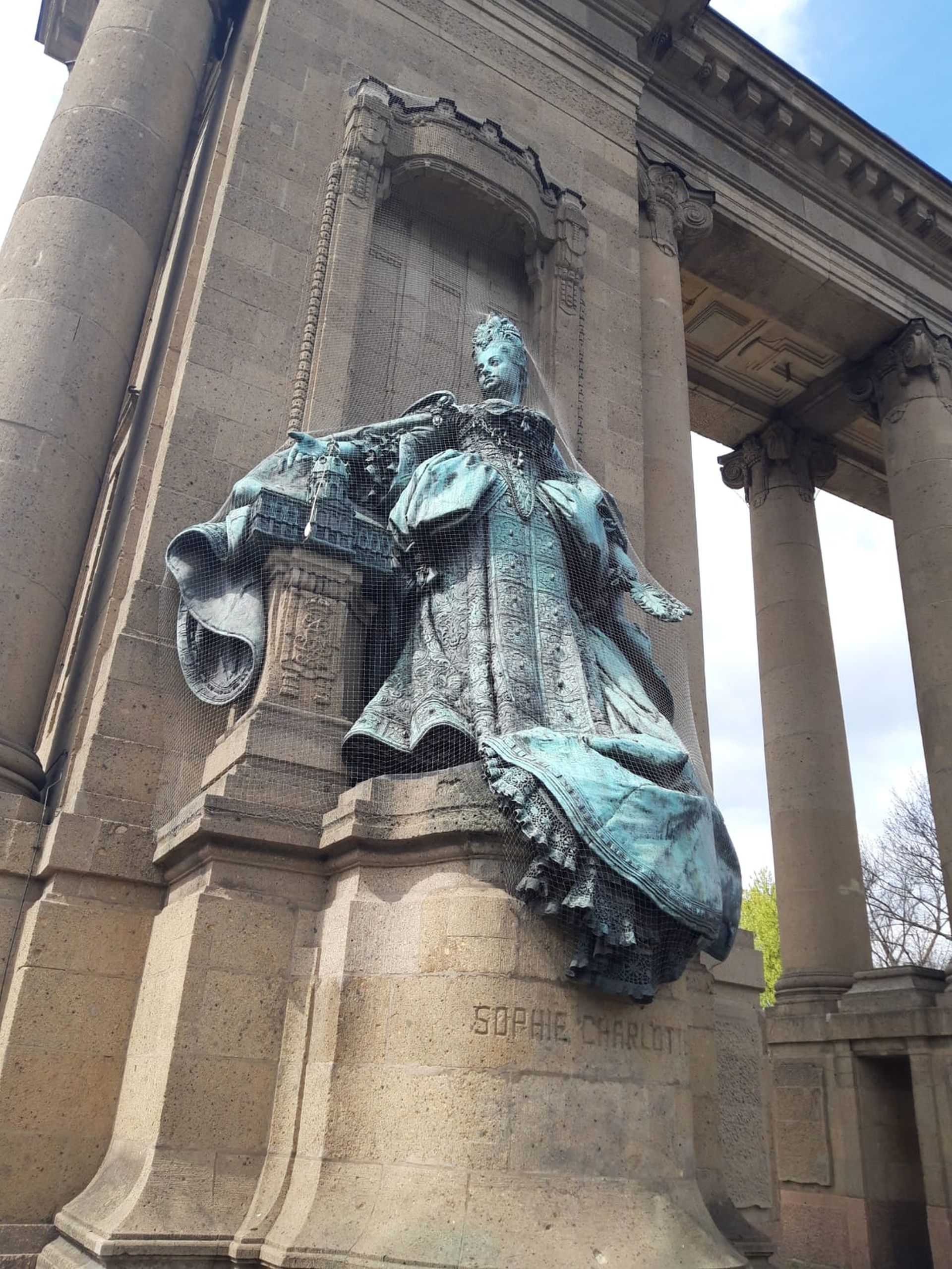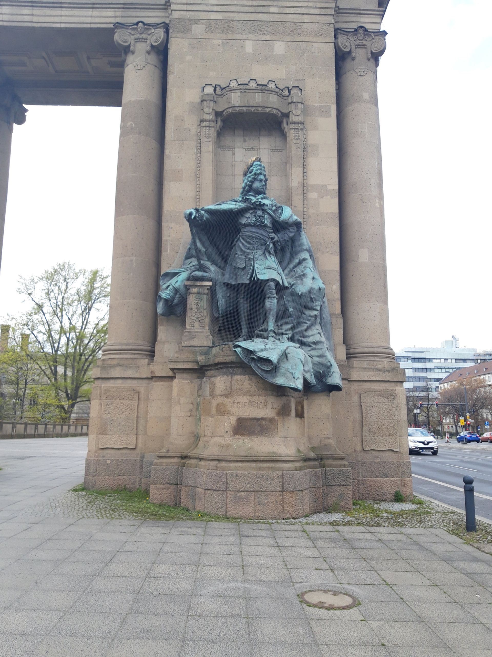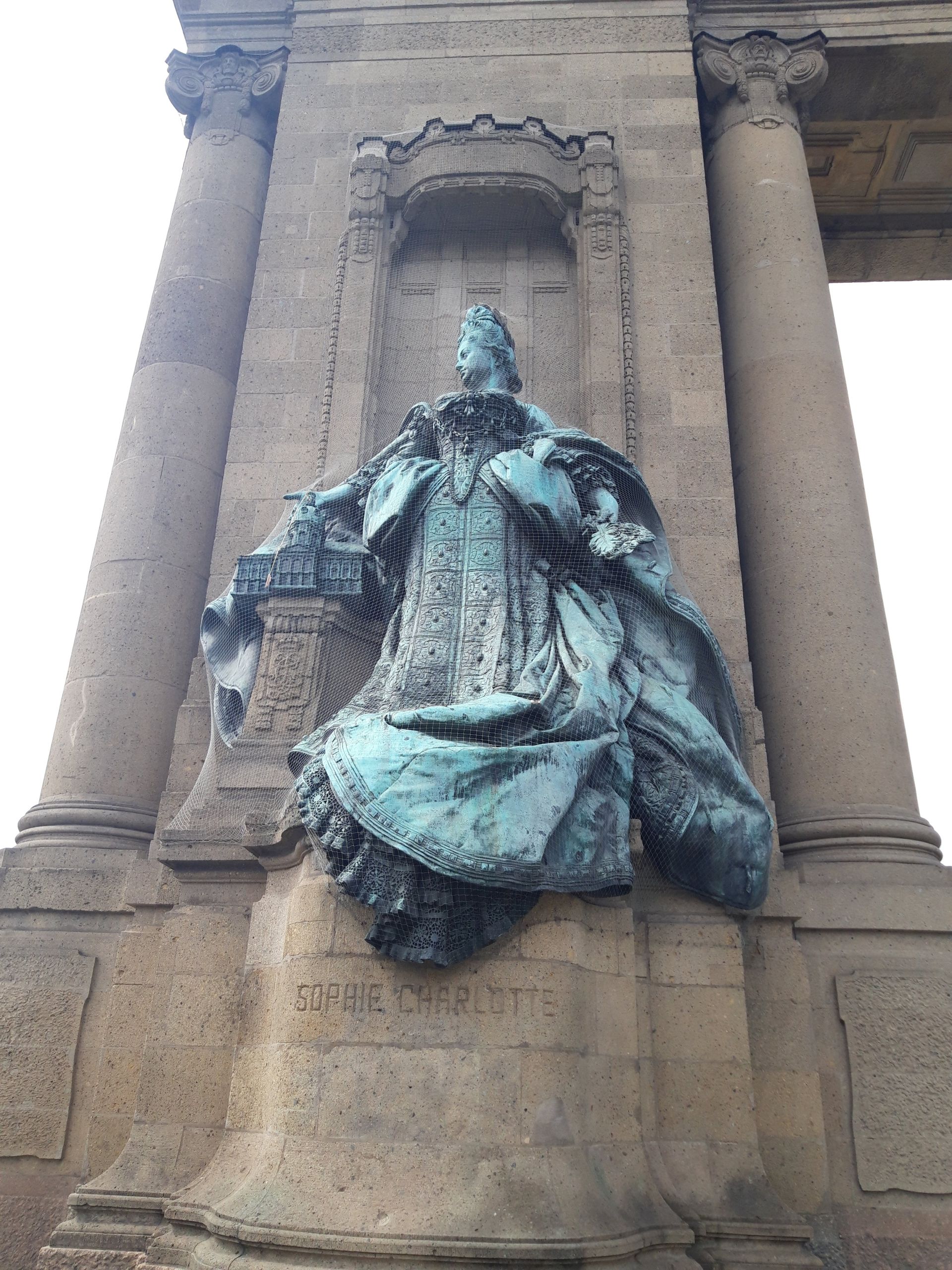 Die zwei bronzenen Plastiken zeigen Preußens ersten König Friedrich I. (1657-1713) und seine Frau Königin Sophie Charlotte von Braunschweig-Hannover (1668-1705). Sie sind Teil des Charlottenburger Tors und befinden sich jeweils auf der zur Straße gerichteten Seite des sandsteinernen tempelartigen Bauwerks. Beide sind östlich zum Brandenburger Tor ausgerichtet. Die quadratischen Sockel sind wie das Tor selbst aus Sandstein gefertigt- Die eingemeißelten Innenschriften sind zentral und auf Augenhöhe. Beide Plastiken sind von einem Baldachin überdacht, welcher als Halbrelief ins Tor eingemeißelt ist. Friedrich I. befindet sich auf der linken Seit. Er steht im Kontrapost, die linke Hand in die Hüfte gestemmt, die rechte auf ein Zepter gestützt, dessen Ende auf einem bronzenen Kissen ruht. Die darunter befindliche, kleine Säule aus Sandstein zeigt die Initialen R und F. Dies steht für „Fredericus rex“, also König Friedrich. Er trägt eine Allongeperücke, darauf einen vergoldeten Lorbeerkranz sowie einen sehr ausladenden Hermelinmantel. Sophie Charlotte hat als Pendant zur anderen Bronze ihren Blick jener zugewandt. In der linken Hand hält sie eine Feder, mit der rechten deutet sie auf ein kleines Modell des Charlottenburger Schlosses, welches nach ihr benannt wurde. Die Säule zeigt ihre Initialen S, C und R. Auch sie trägt pompöse Kleidung. Beide wirken sehr majestätisch. Ihre Oberfläche ist grün patiniert (Justine Seurig).