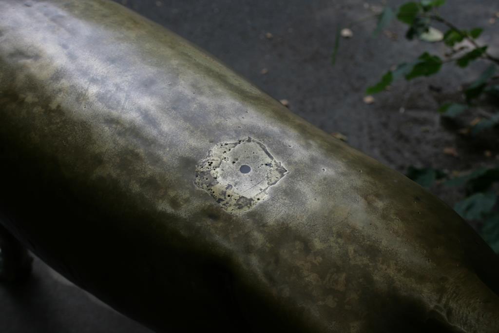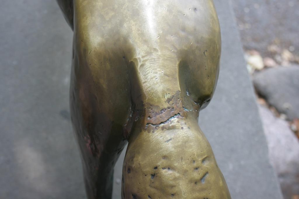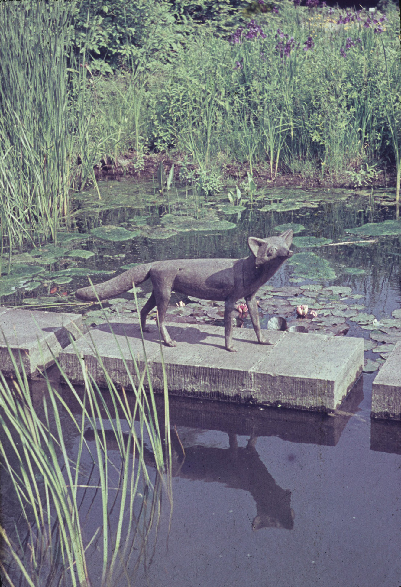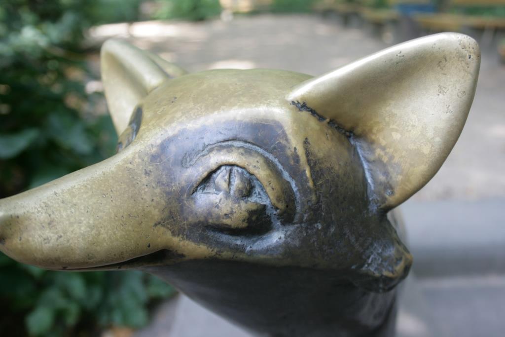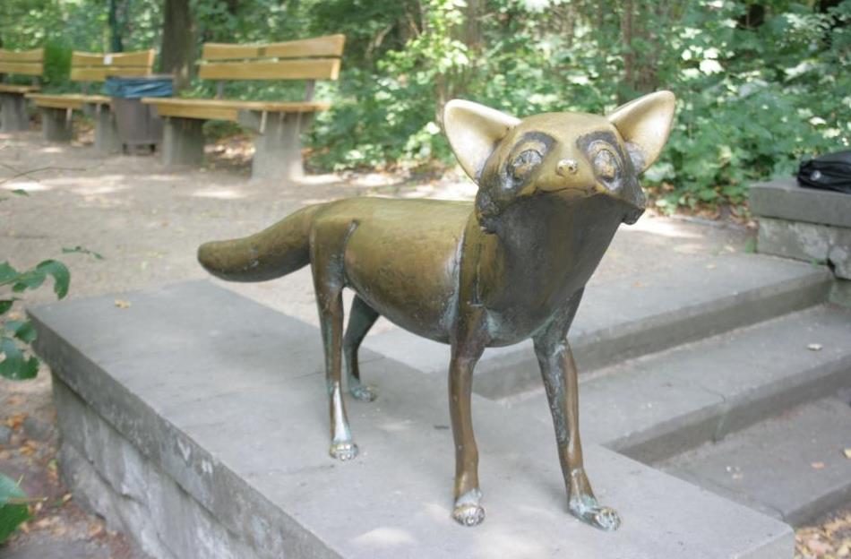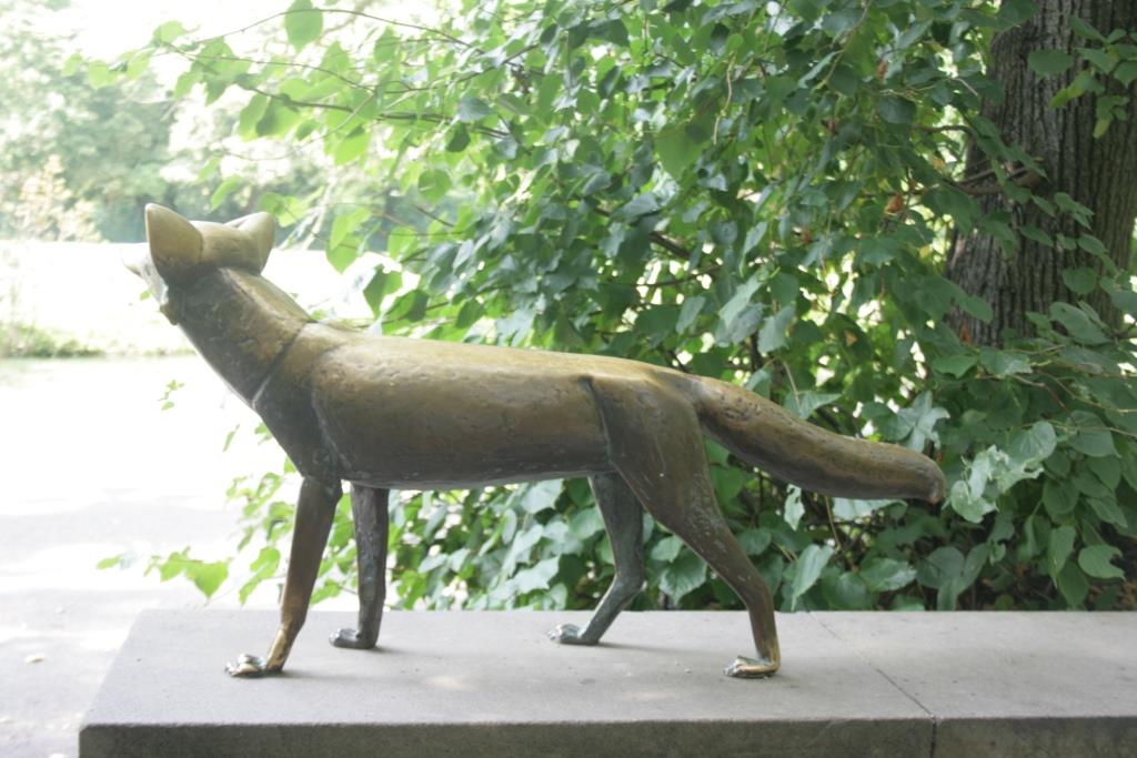 Auf der Wange einer aus Kalksteinblöcken gefügten Treppe zu einer Sitzterrasse am Lenné-Ring (Promenade) steht plinthenlos auf den vier Pfoten die naturnah, jedoch fast menschlich anmutend und stilisiert formulierte Figur eines aufmerksam aufschauenden Fuchses mit buschigem, fast horizontal abstehenden Schweif und gespitzen Ohren (Jörg Kuhn)