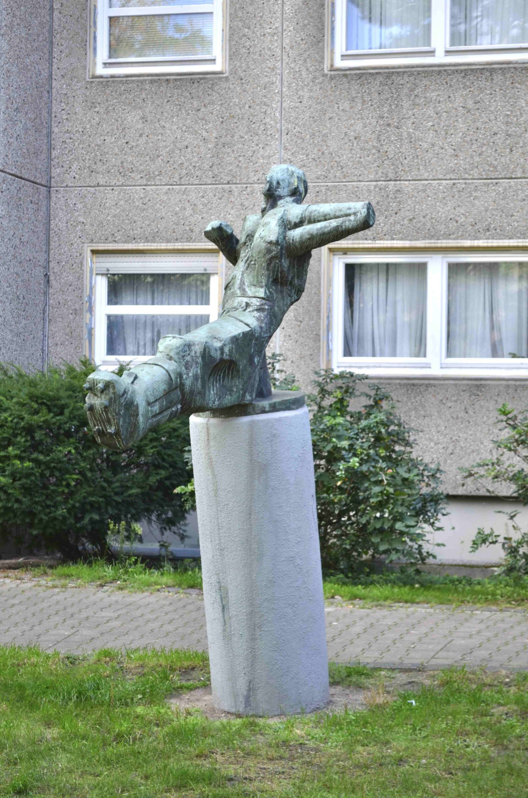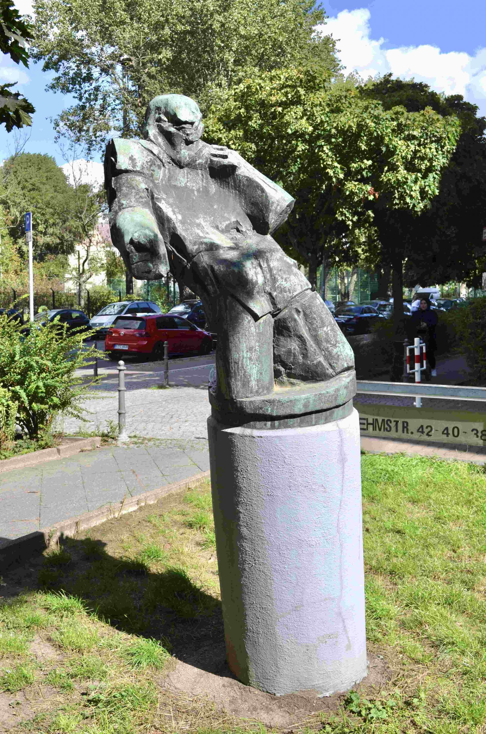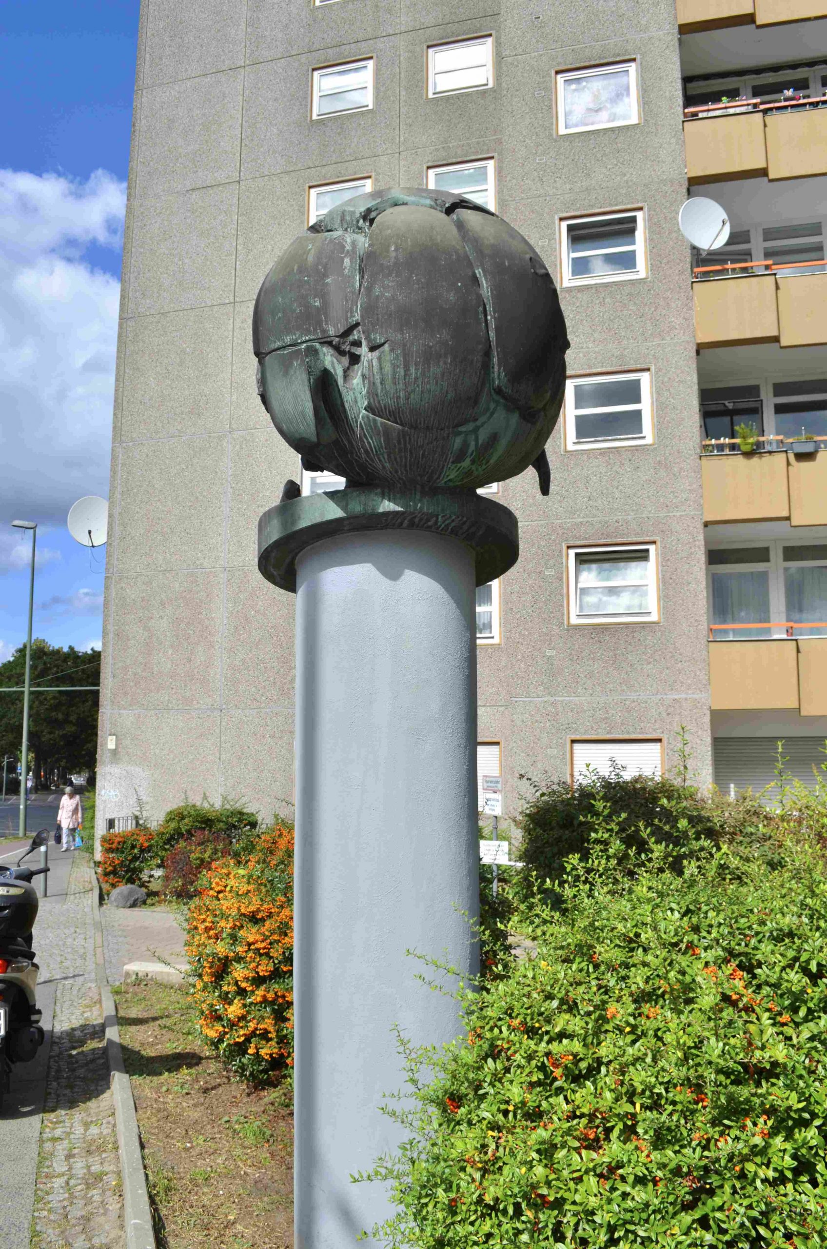 Das 1978 entstandene, mehrteilige Kunstwerk erinnert daran, dass im ehemaligen Stadion Gesundbrunnen (Plumpe) Hertha BSC 1930 und 1931 die Fussballmeisterschaft gewann. "1904 wechselte Hertha vom 'Exter' an der schönhauser Allee auf den Schebera-Platz, der heute nicht nur die Heimstätte des SV Norden-Nordwest, sondern auch der älteste noch existierende Fußballvereinssportplatz Deutschlandes ist. Gleich gegenüber davon erinnern heute recht merkwürdig anmutende Skulpturen an die 1974 abgerissene Plumpe, das legendäre Stadion, in dem Hertha seine größten Erfolge feierte, und in dem Hanne Sobek kickte, dem man unweit von hier einen - zugegeben recht schmucklosen - Platz vor einem Einkaufscenter gewidmet hat" (zitiert aus Christian Schlodder: "Motto fürs Morgen. Hertha BSC hat von den Berliner Gründungsklubs die erfolgreichste Geschichte", in: Berliner Zeitung Nr. 248, Freitag, 25.10.2019, S. 18). "Die mehrteilige Skulpturengruppe (...) bezieht sich in kritischer Weise auf die Vergangenheit des Standortes, des ehemaligen Hertha-Sportplatzes, der in konfliktreicher Weise der Wohnanlage (Behmstraße und Bellermannstraße, JK) Platz machen musste. Daher zum Beispiel ein zerfetzter 'Fußball' in abstrahierter Darstellung auf einer Einzel-Säule vor der Anlage in der Bellermannstraße: Anspielung auf die rüden Begleitmethoden der Verkaufsverhandlungen. In der Behmstraße stehen vier 'Fußballer'-Skulpturen auf runden, leicht schräg gestellten Pfeilern und lassen die Härte dieser Sportart spüren" (St. Endlich, 1990, S. 186) (Jörg Kuhn).