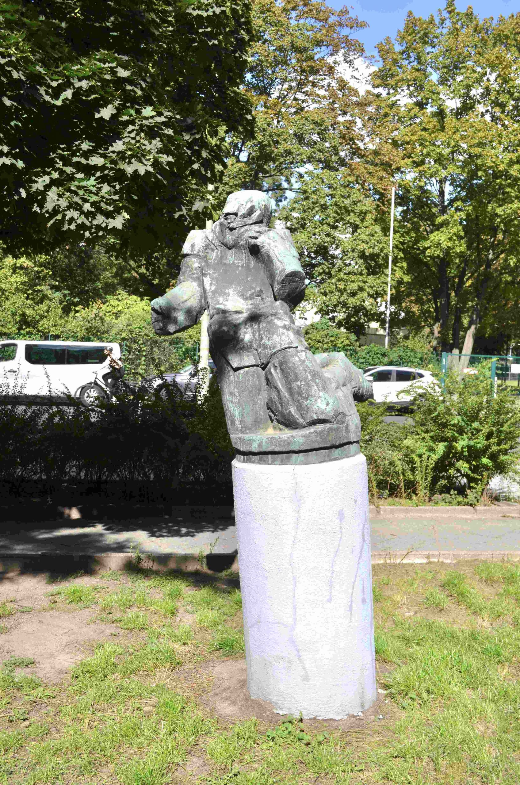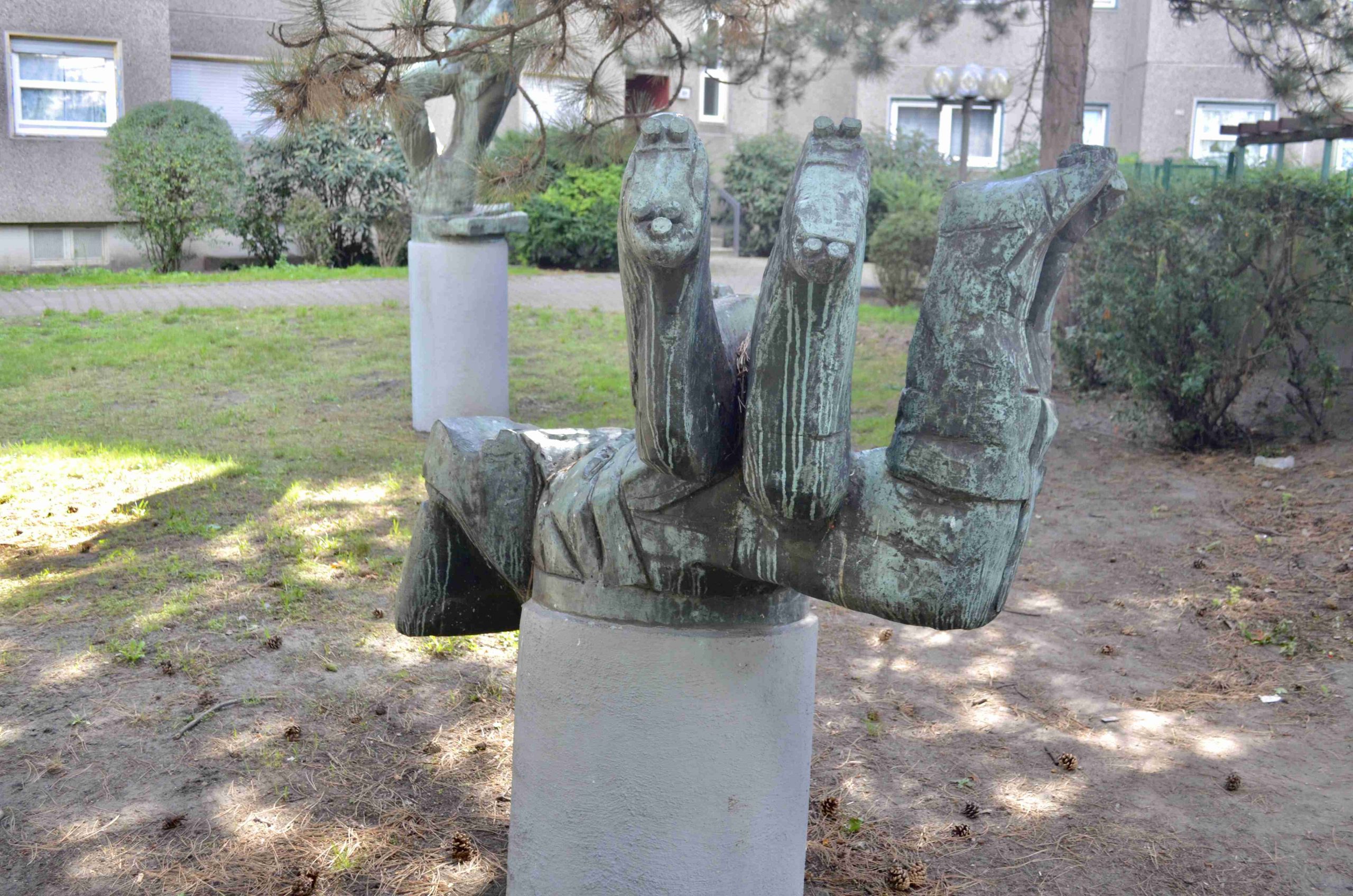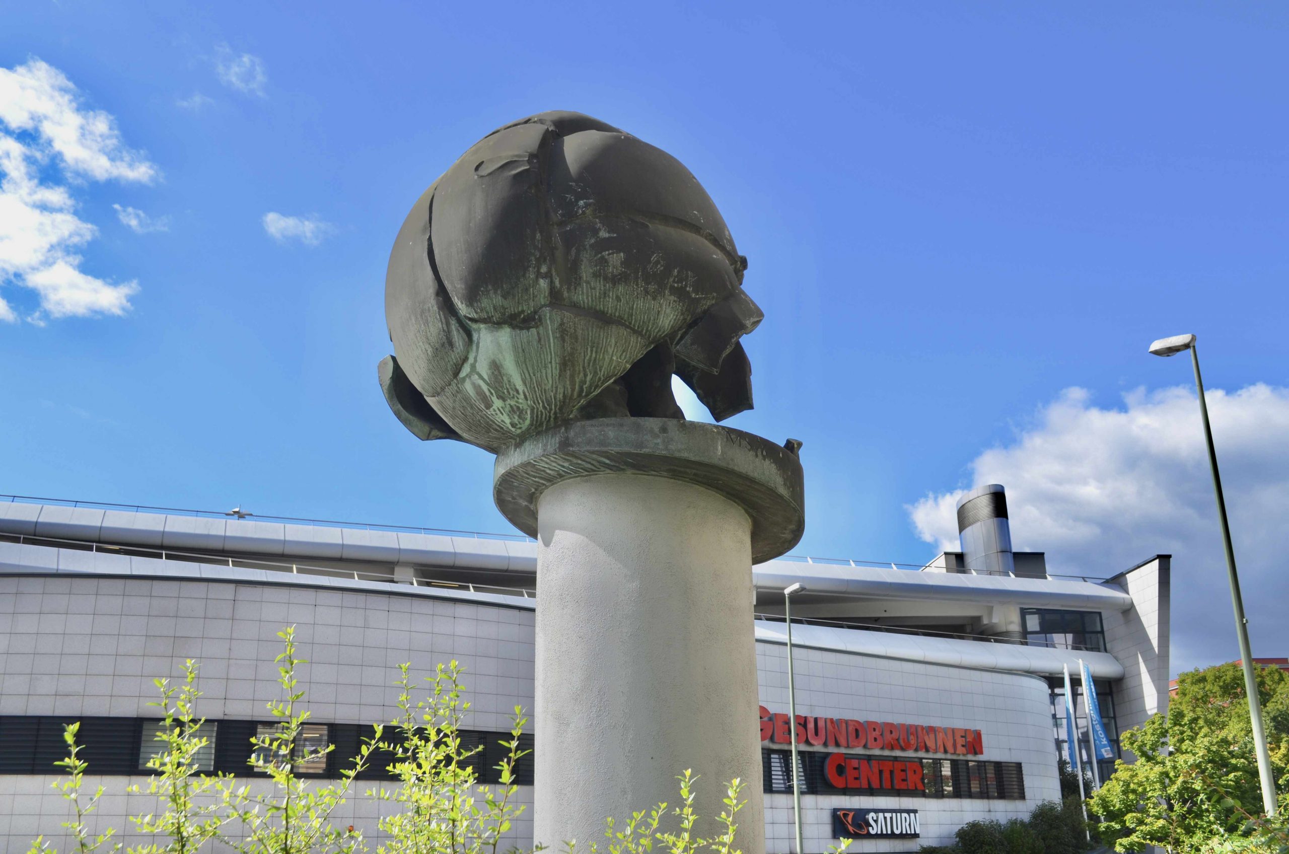 Das 1978 entstandene, mehrteilige Kunstwerk erinnert daran, dass im ehemaligen Stadion Gesundbrunnen (Plumpe) Hertha BSC 1930 und 1931 die Fussballmeisterschaft gewann. "1904 wechselte Hertha vom 'Exter' an der schönhauser Allee auf den Schebera-Platz, der heute nicht nur die Heimstätte des SV Norden-Nordwest, sondern auch der älteste noch existierende Fußballvereinssportplatz Deutschlandes ist. Gleich gegenüber davon erinnern heute recht merkwürdig anmutende Skulpturen an die 1974 abgerissene Plumpe, das legendäre Stadion, in dem Hertha seine größten Erfolge feierte, und in dem Hanne Sobek kickte, dem man unweit von hier einen - zugegeben recht schmucklosen - Platz vor einem Einkaufscenter gewidmet hat" (zitiert aus Christian Schlodder: "Motto fürs Morgen. Hertha BSC hat von den Berliner Gründungsklubs die erfolgreichste Geschichte", in: Berliner Zeitung Nr. 248, Freitag, 25.10.2019, S. 18). "Die mehrteilige Skulpturengruppe (...) bezieht sich in kritischer Weise auf die Vergangenheit des Standortes, des ehemaligen Hertha-Sportplatzes, der in konfliktreicher Weise der Wohnanlage (Behmstraße und Bellermannstraße, JK) Platz machen musste. Daher zum Beispiel ein zerfetzter 'Fußball' in abstrahierter Darstellung auf einer Einzel-Säule vor der Anlage in der Bellermannstraße: Anspielung auf die rüden Begleitmethoden der Verkaufsverhandlungen. In der Behmstraße stehen vier 'Fußballer'-Skulpturen auf runden, leicht schräg gestellten Pfeilern und lassen die Härte dieser Sportart spüren" (St. Endlich, 1990, S. 186) (Jörg Kuhn).