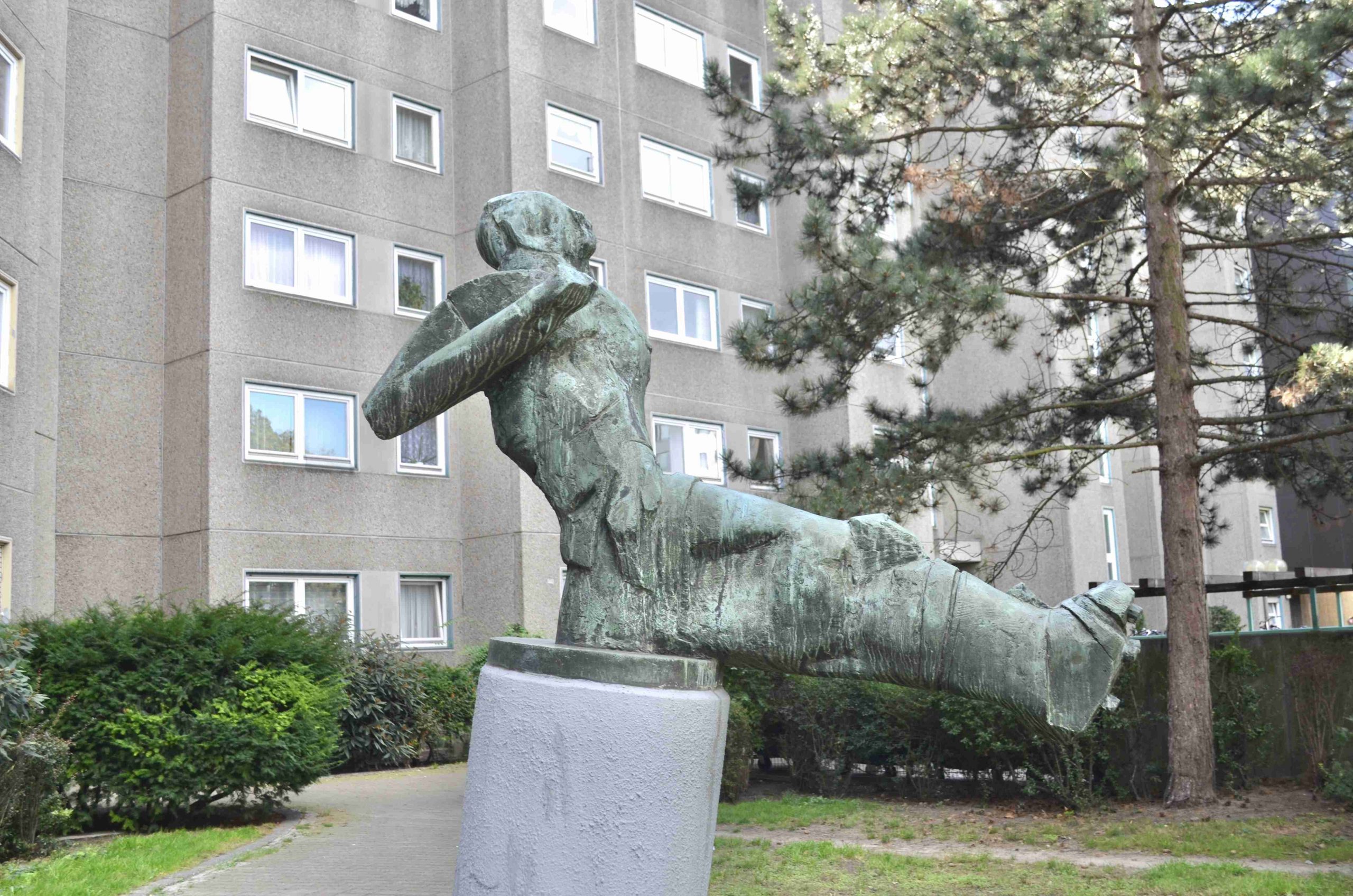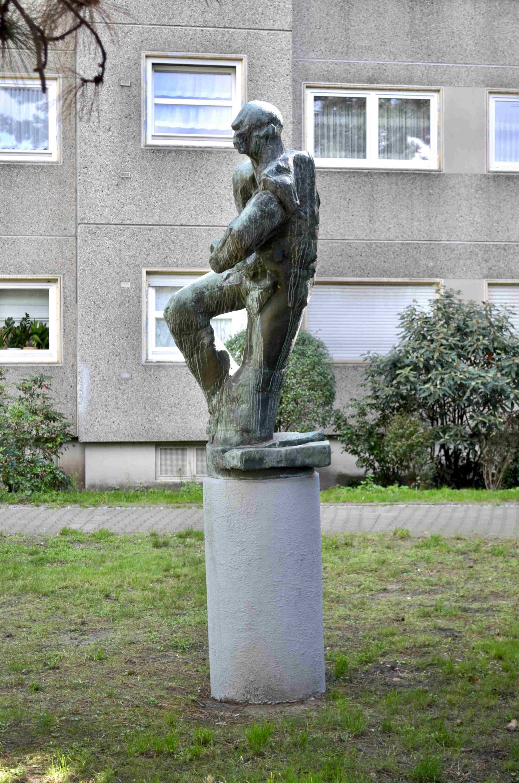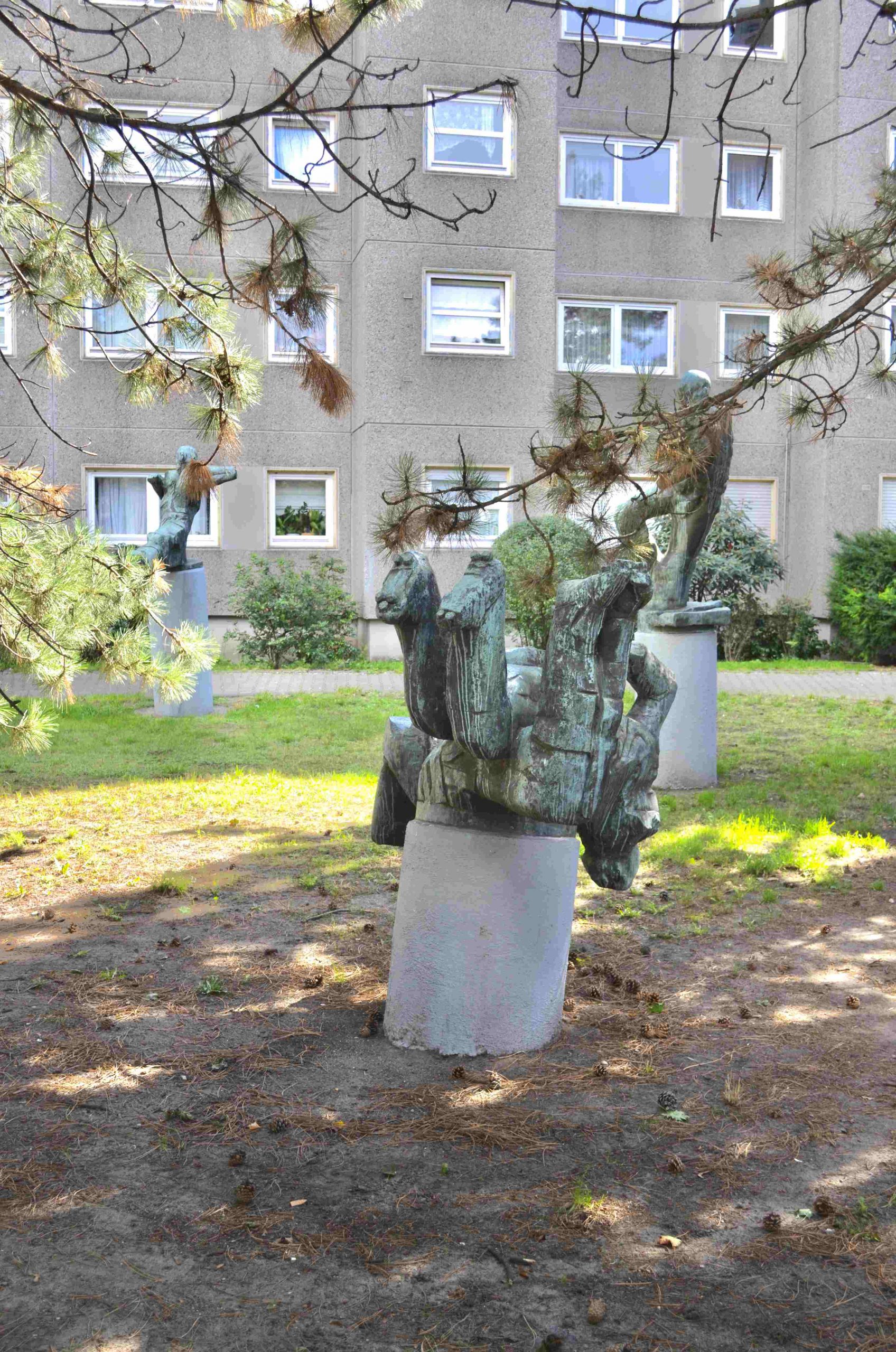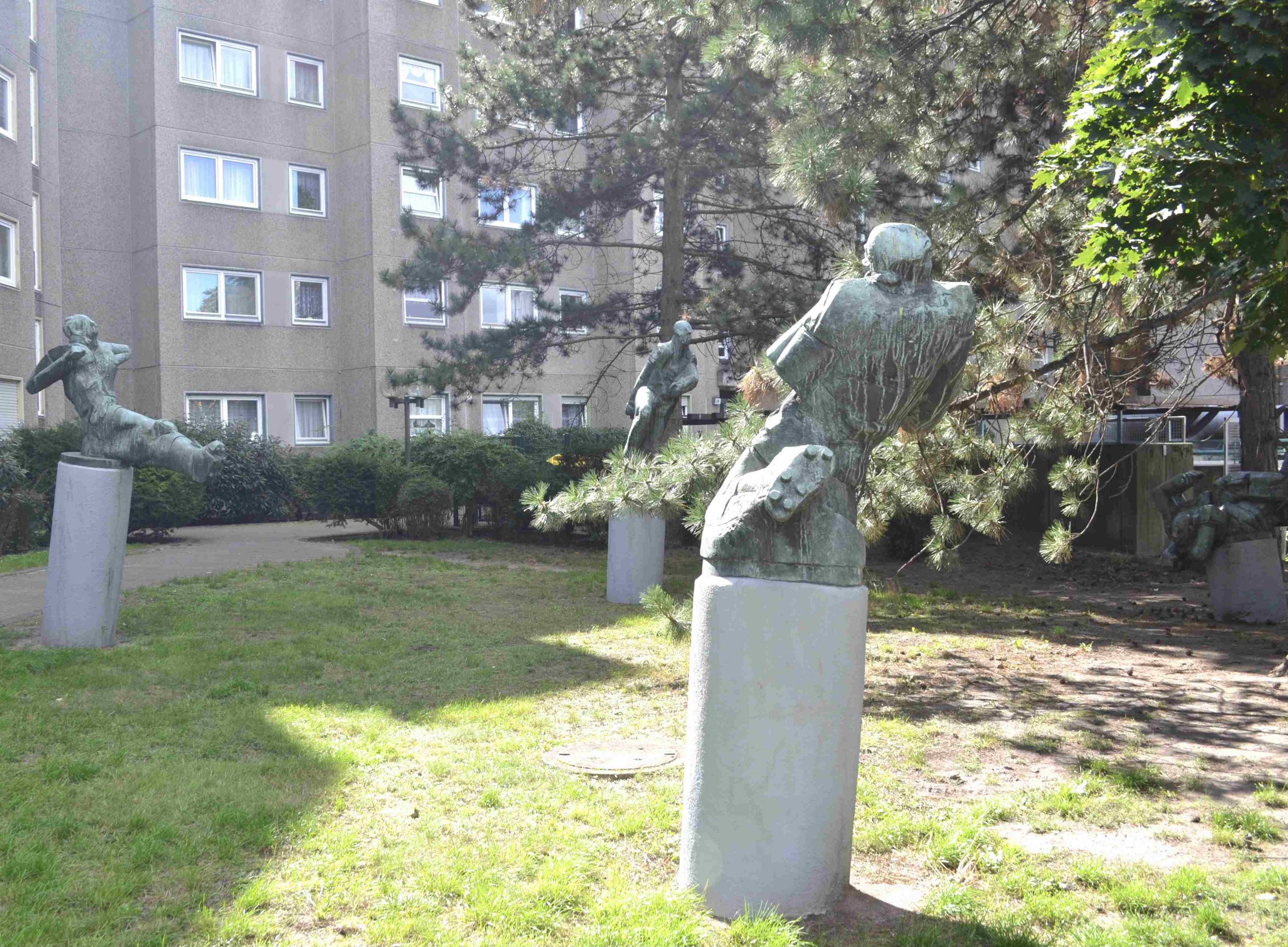 Mehrteiliges Ensemble abstrakt formulierter Fußballspieler (vier Figuren) und eines Fußballs vor zwei Wohnanlagen. Der Fußball des Ensembles ist vor einer Wohnanalge an der Ecke Bellermannstraße, Behmstraße aufgestellt. Die Fußballer Figuren stehen auf einer Grünfläche vor einer Wohnanlage in der Behmstraße 40 (Pauline Ahrens).