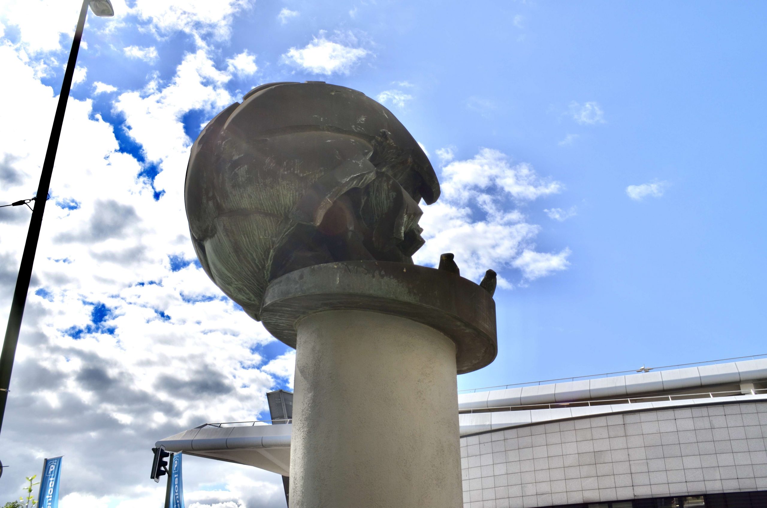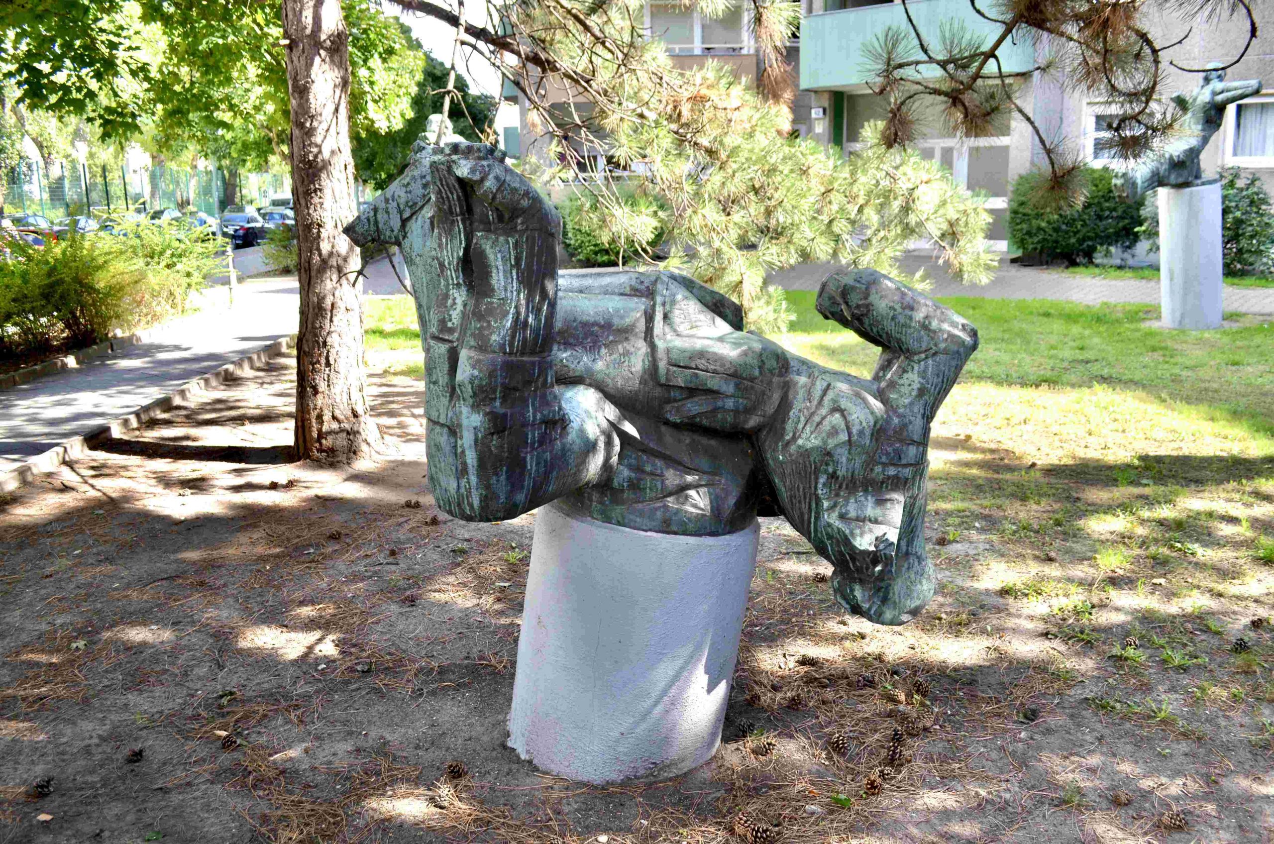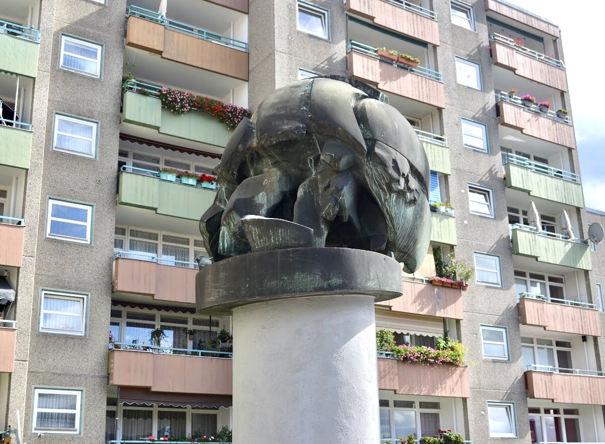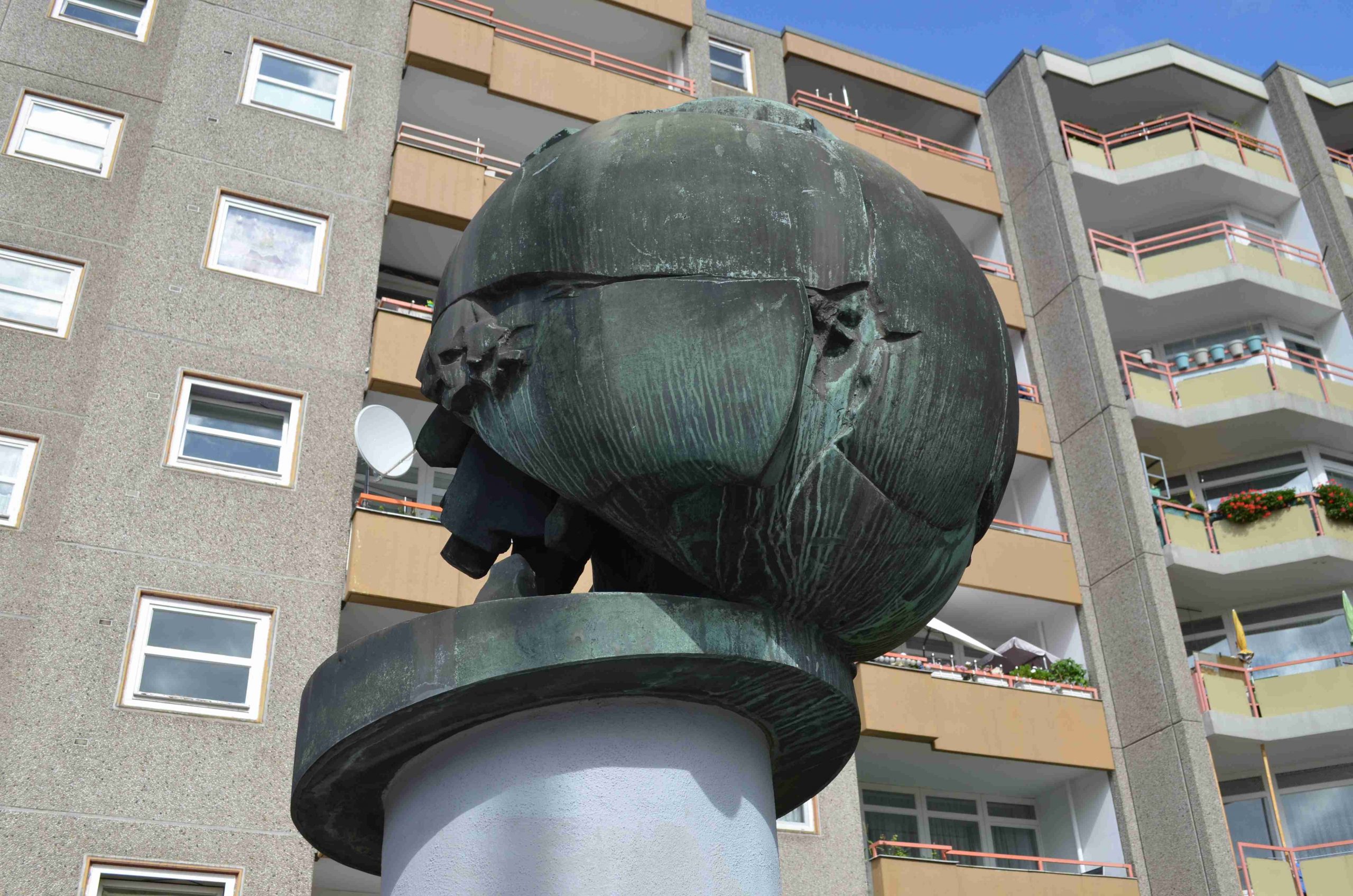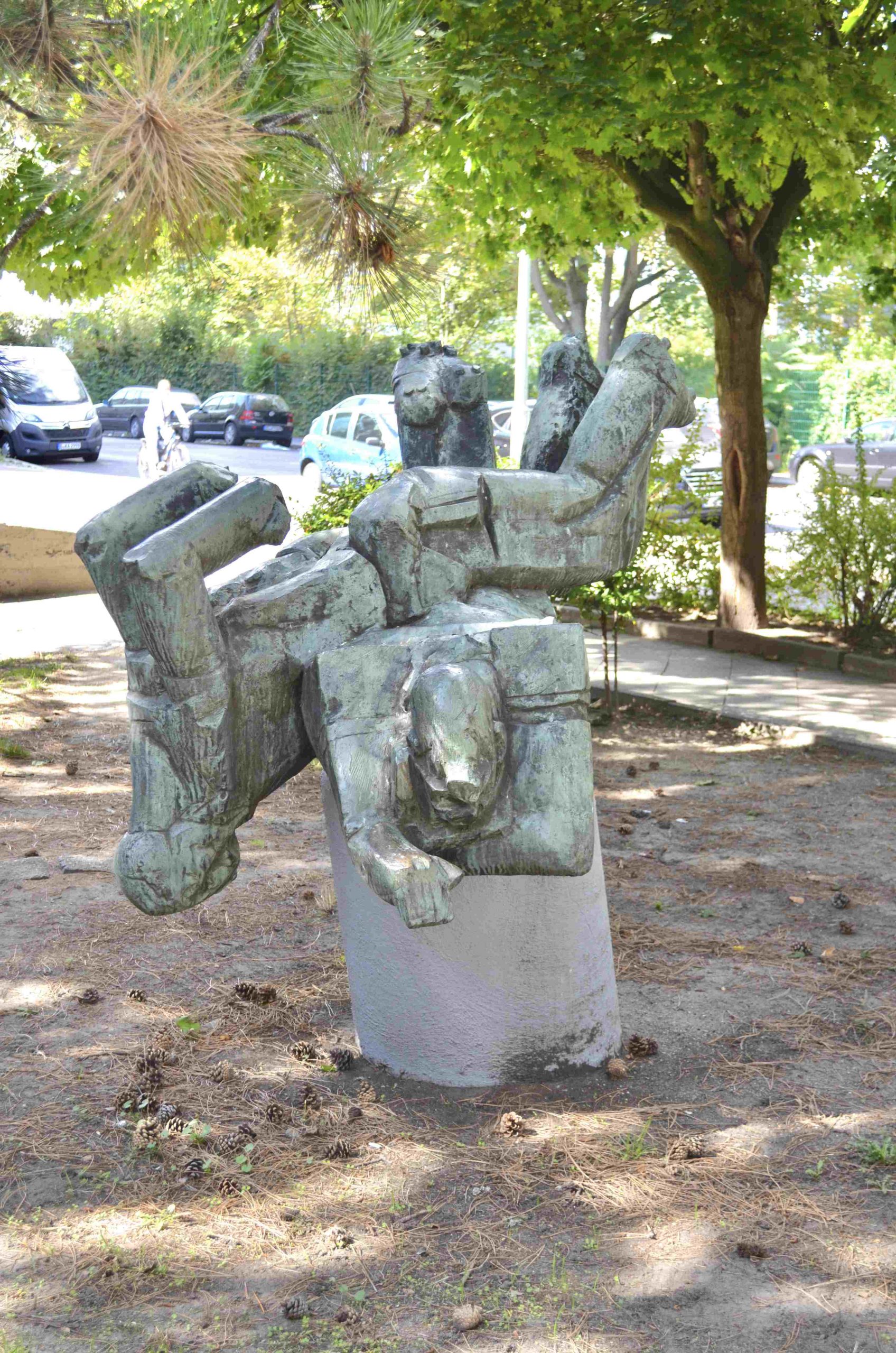 Mehrteiliges Ensemble abstrakt formulierter Fußballspieler (vier Figuren) und eines Fußballs vor zwei Wohnanlagen. Der Fußball des Ensembles ist vor einer Wohnanalge an der Ecke Bellermannstraße, Behmstraße aufgestellt. Die Fußballer Figuren stehen auf einer Grünfläche vor einer Wohnanlage in der Behmstraße 40 (Pauline Ahrens).