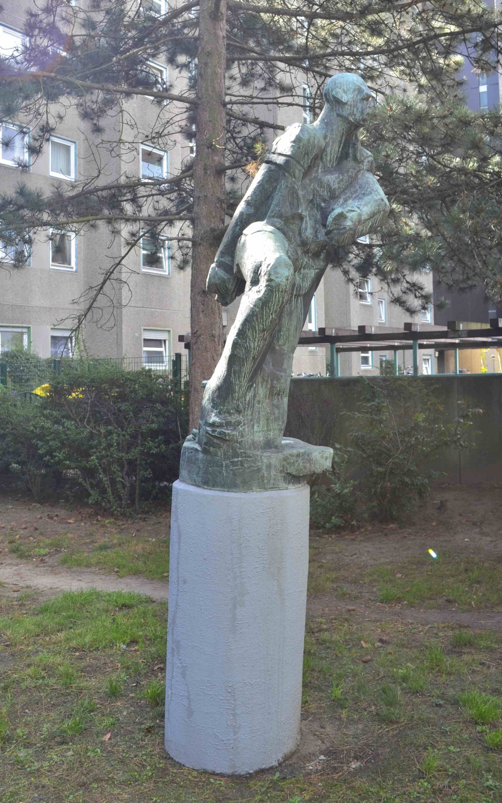 Mehrteiliges Ensemble abstrakt formulierter Fußballspieler (vier Figuren) und eines Fußballs vor zwei Wohnanlagen. Der Fußball des Ensembles ist vor einer Wohnanalge an der Ecke Bellermannstraße, Behmstraße aufgestellt. Die Fußballer Figuren stehen auf einer Grünfläche vor einer Wohnanlage in der Behmstraße 40 (Pauline Ahrens).