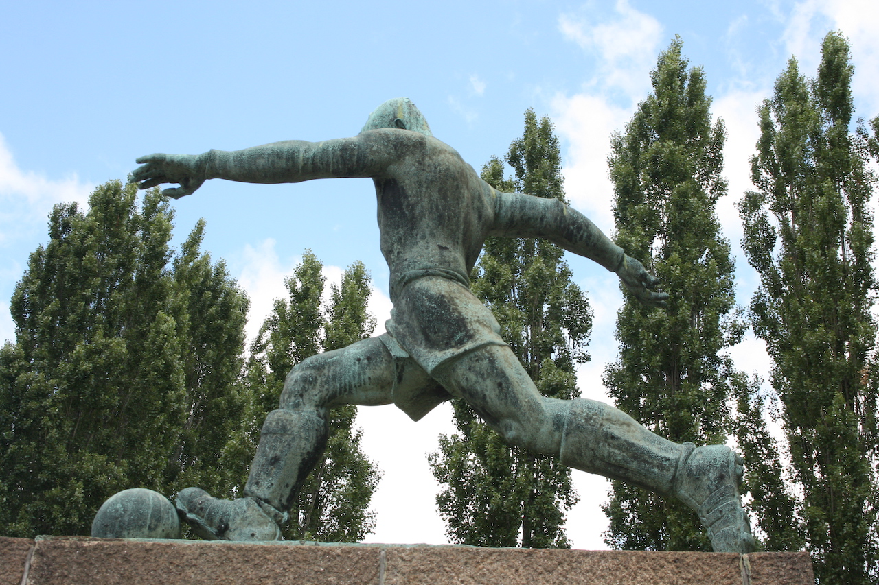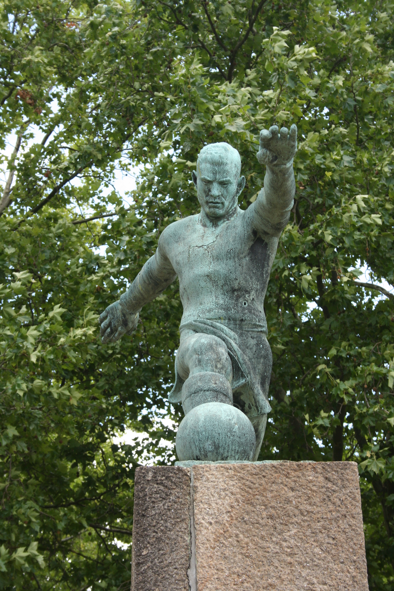 Auf einem Rasenstück im Eingangsbereich des Ludwig-Jahn-Sport-Parks steht innerhalb eines Blumenbeets auf rechteckiger Standplatte aus gestocktem grauen Granit auf einem schmalen hohen längsrechteckigen Sockel aus Granitblöcken die etwas unterlebensgroße Figur eines Fußballspielers auf längsrechteckiger Plinthe. Der junge Mann in zeittypischer Sportbekleidung der Zeit um 1930, enganliegendem Sporttrikothemd, Sporthose, kurzen Stutzstrümpfen und Stollenschuhen, ist gerade im Begriff, einen Fußball, dessen Lauf er mit seinem weit nach vorn ausgestreckten rechten Fuß fixierend unterbrochen hat, mit dem schwungholend weit nach hinten ausgestreckten linken Fuß nach vorne zu schießen. Die Beine sind in starker Laufstellung dargestellt, jedoch fest konturiert. Die Arme folgen der weit nach vorn und nach hinten ausgreifenden Beinen in gegenläufiger Richtung. Der rechte Arm ist weit nach hinten ausgestreckt, die rechte Hand weit geöffnet, so dass die Handinnenfläche nach oben weist. Der linke Arm ist mit ausgestreckter linker Hand gerade nach vorne geführt. Der Kopf mit den kappenartig anliegenden Haaren ist geneigt, der Blick auf den Ball gerichtet. Die Figur ist bei aller Naturnähe leicht expressionistisch gestaltet und entspricht damit dem italienischen Zeitgeschmack der 1930er Jahre. Die gut komponierte Plastik vermittelt trotz ihrer naturgemäßen statischen Fixierung ein großes Maß an Bewegungssimulation, soweit dies ohne starke Abstraktion darstellbar ist (Jörg Kuhn).