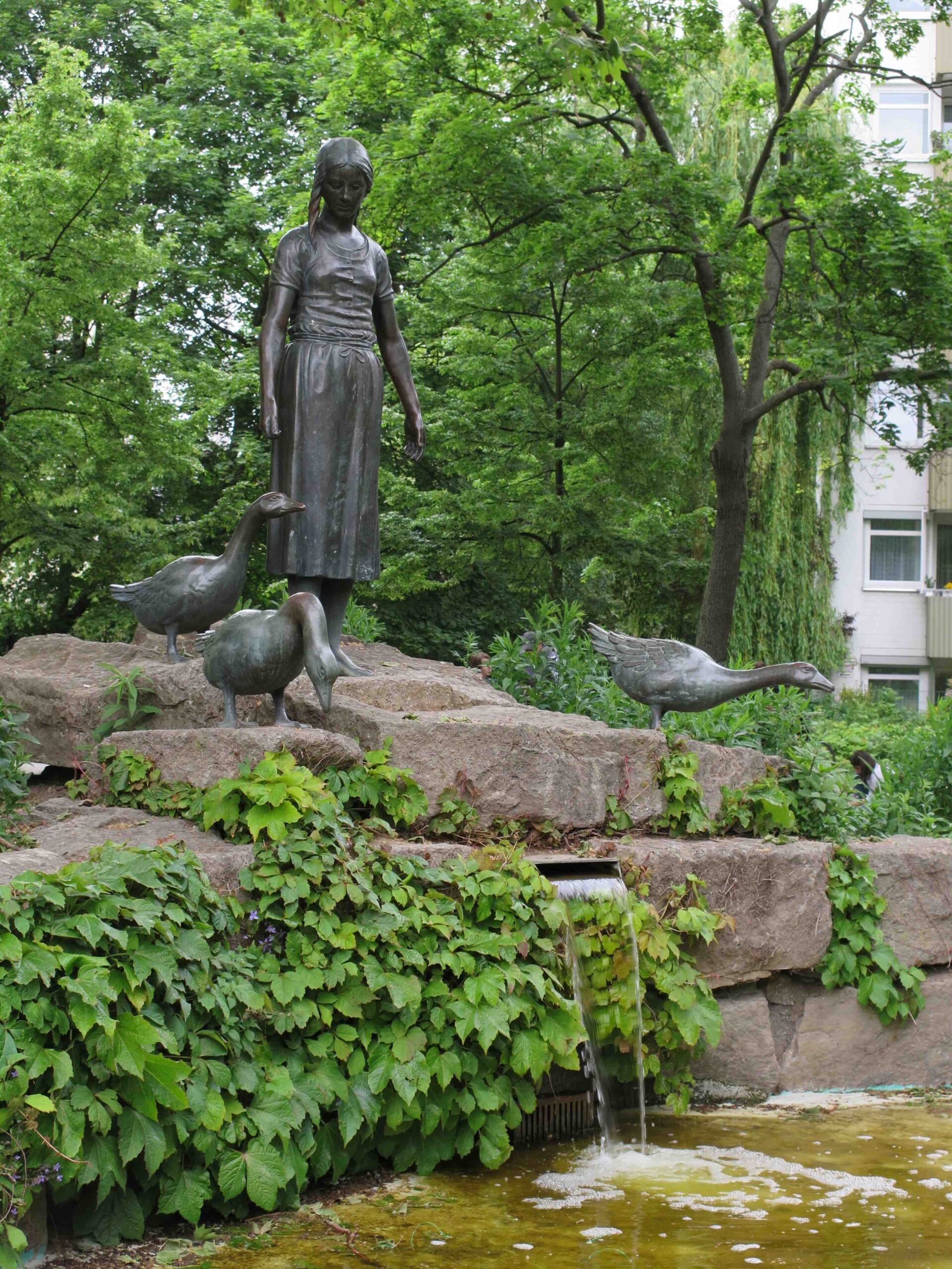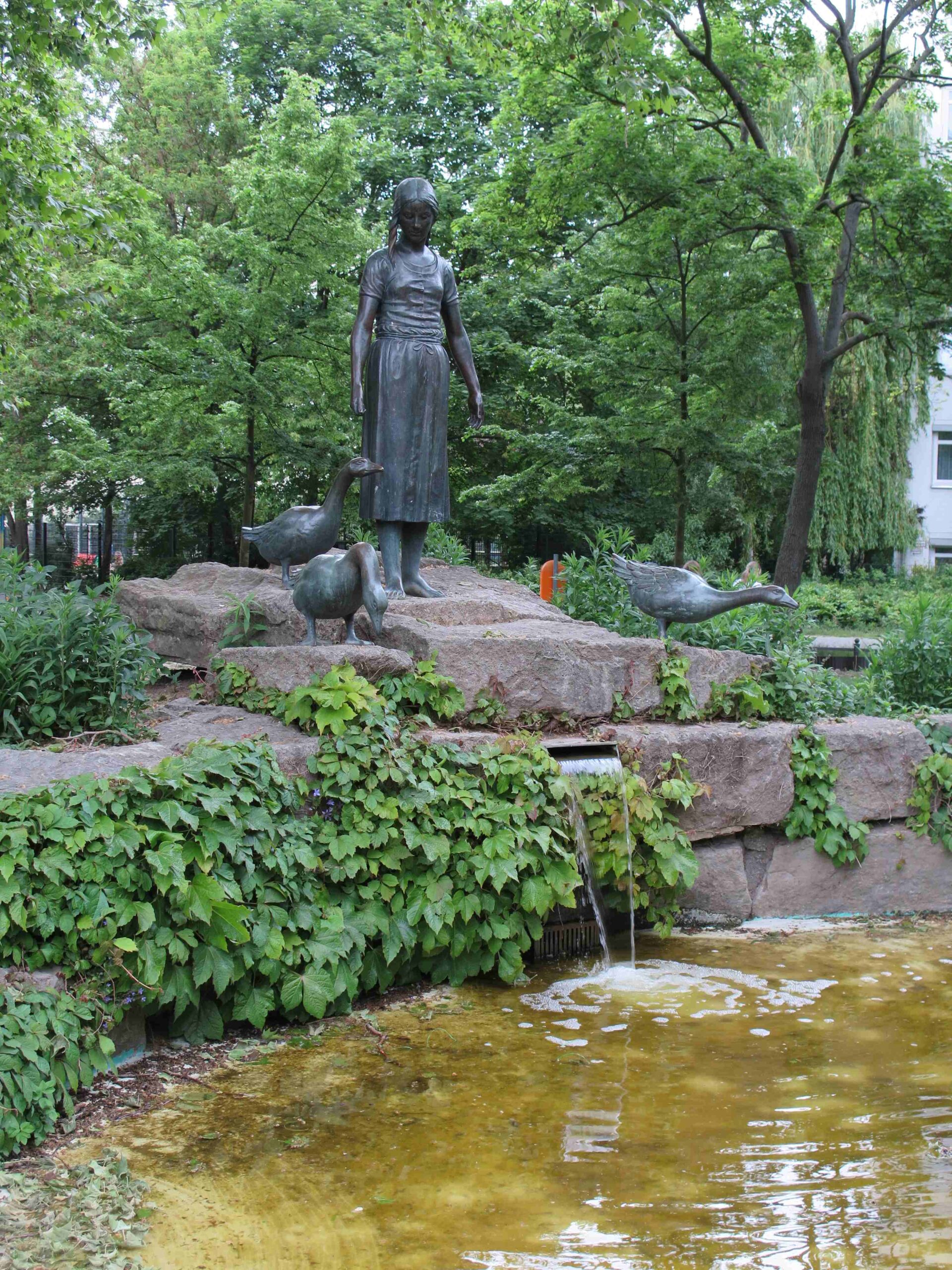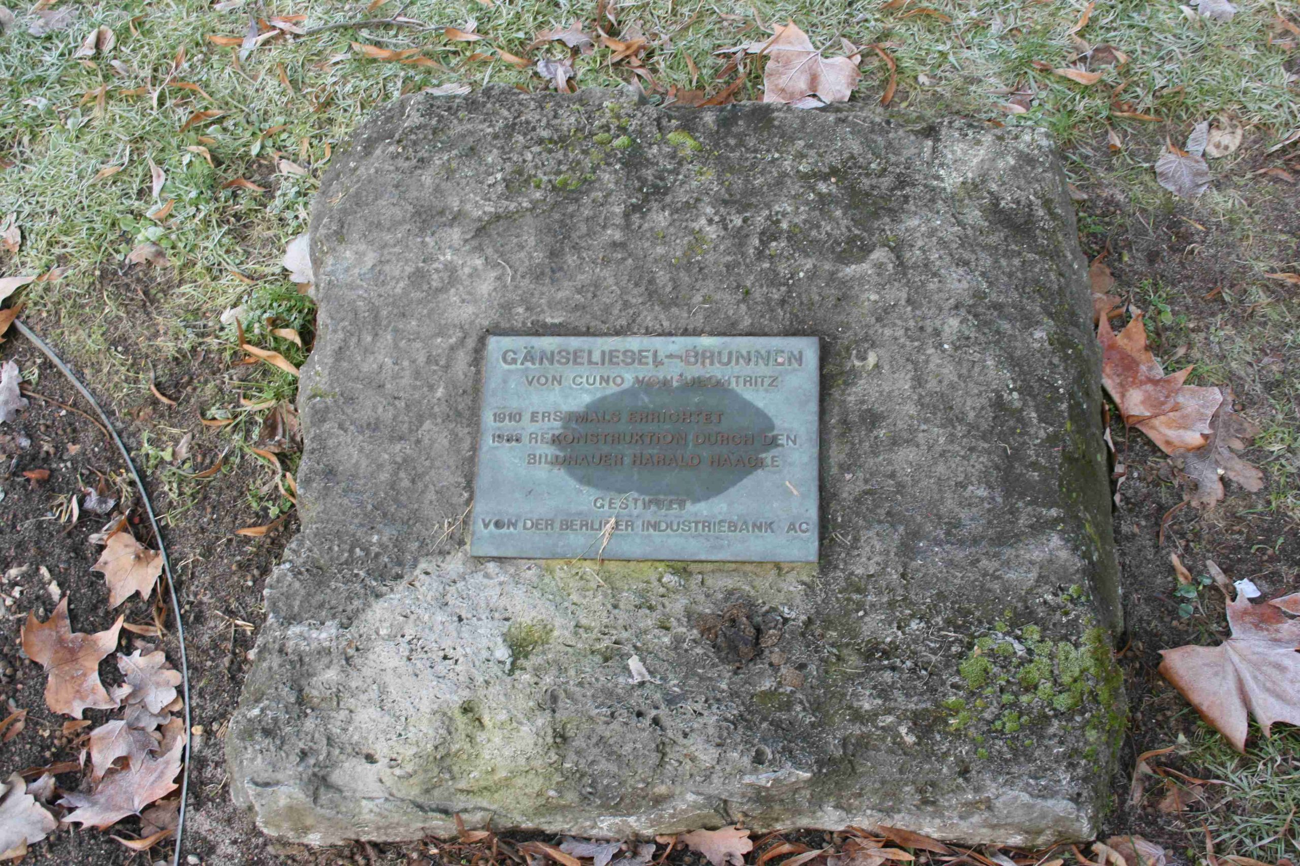 »GÄNSELIESEL-BRUNNEN / VON CUNO VON UECHTRITZ / 1910 ERSTMALS ERRICHTET / 1988 REKONSTRUKTION DURCH DEN / BILDHAUER HARALD HAACKE / GESTIFTET / VON DER BERLINER INDUSTRIEBANK AG«