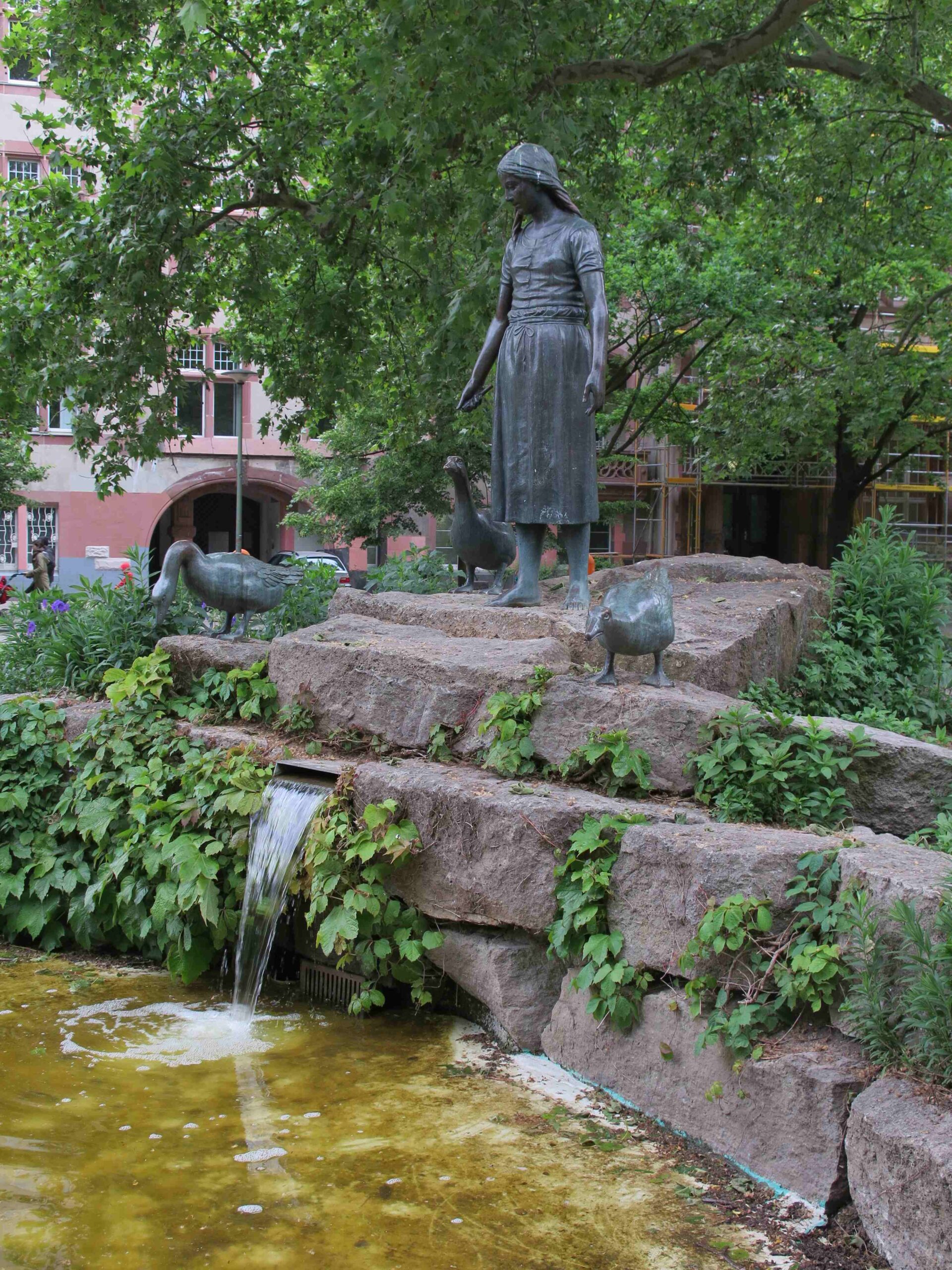 In eine inszenierte „Landschaft“ sind die Figuren einer Gäsemagd und den zugehörigen drei Gänsen oberhalb eines Brunnenbeckens aufgestellt. Die Formulierung der Gänseliesel als in schlichter, ländlicher Tracht gewandetem Bauernmädchen entspricht der in der bildenden und angewandten Kunst und der zeitgenössischen Literatur um 1900 üblichen Idealisierung des Landlebens. Ein im Vordergrund liegender Steinbrocken birgt die erläuternde Inschriftentafel (Jörg Kuhn).
