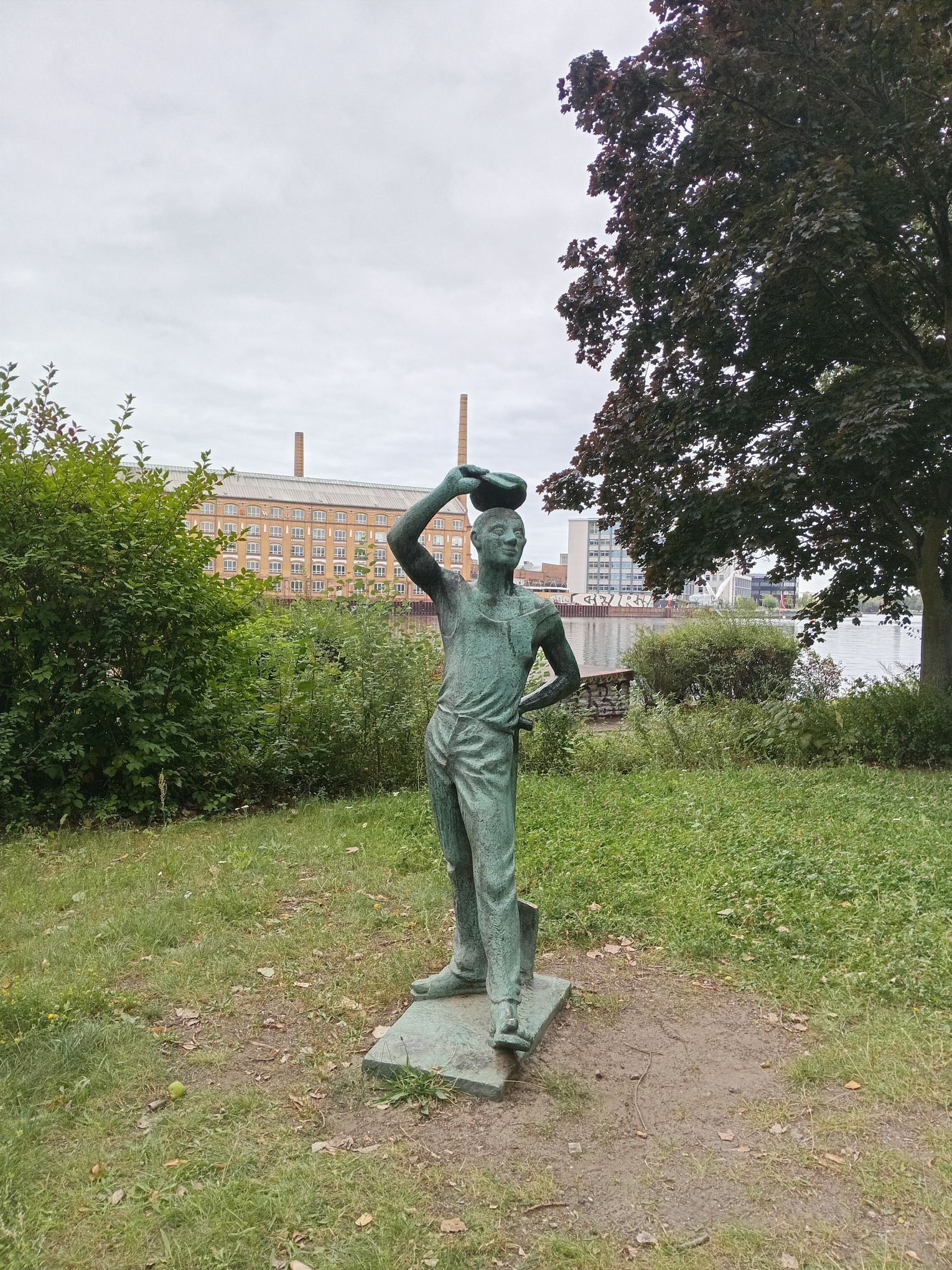 Diese Bronzeplastik ist ein Nachguss der 1962-1963 von Karl-Heinz Schamal geschaffenen Plastik, welche sich auf dem Antonplatz befindet. Ein weiterer Guss aus dem Jahr 1973 befindet sich in Potsdam auf der Freundschaftsinsel. Dieser wurde im Zuge der 10. Weltfestspiele der Jugend und Studenten angefertigt. Diese Plastik stand zwischenzeitlich vor der Rinkartstraße 13, wurde aber durch die Initiative der Bewohner*innen 2023 wieder an das Ufer der Spree gesetzt. (Rieke Fender)