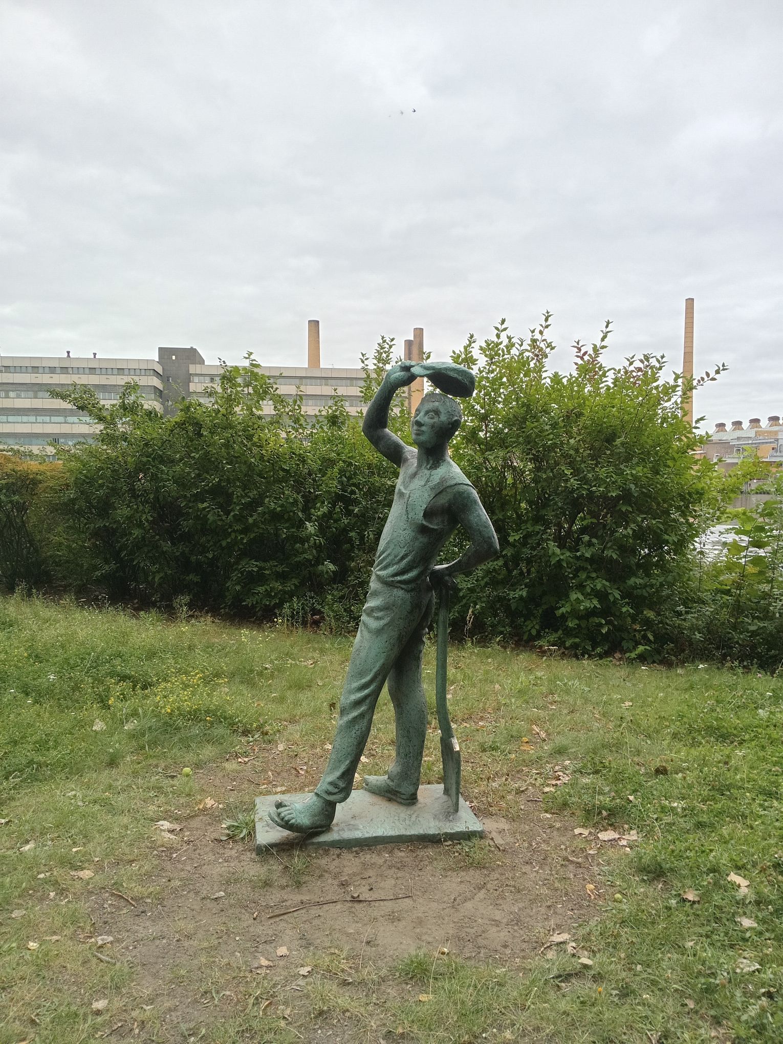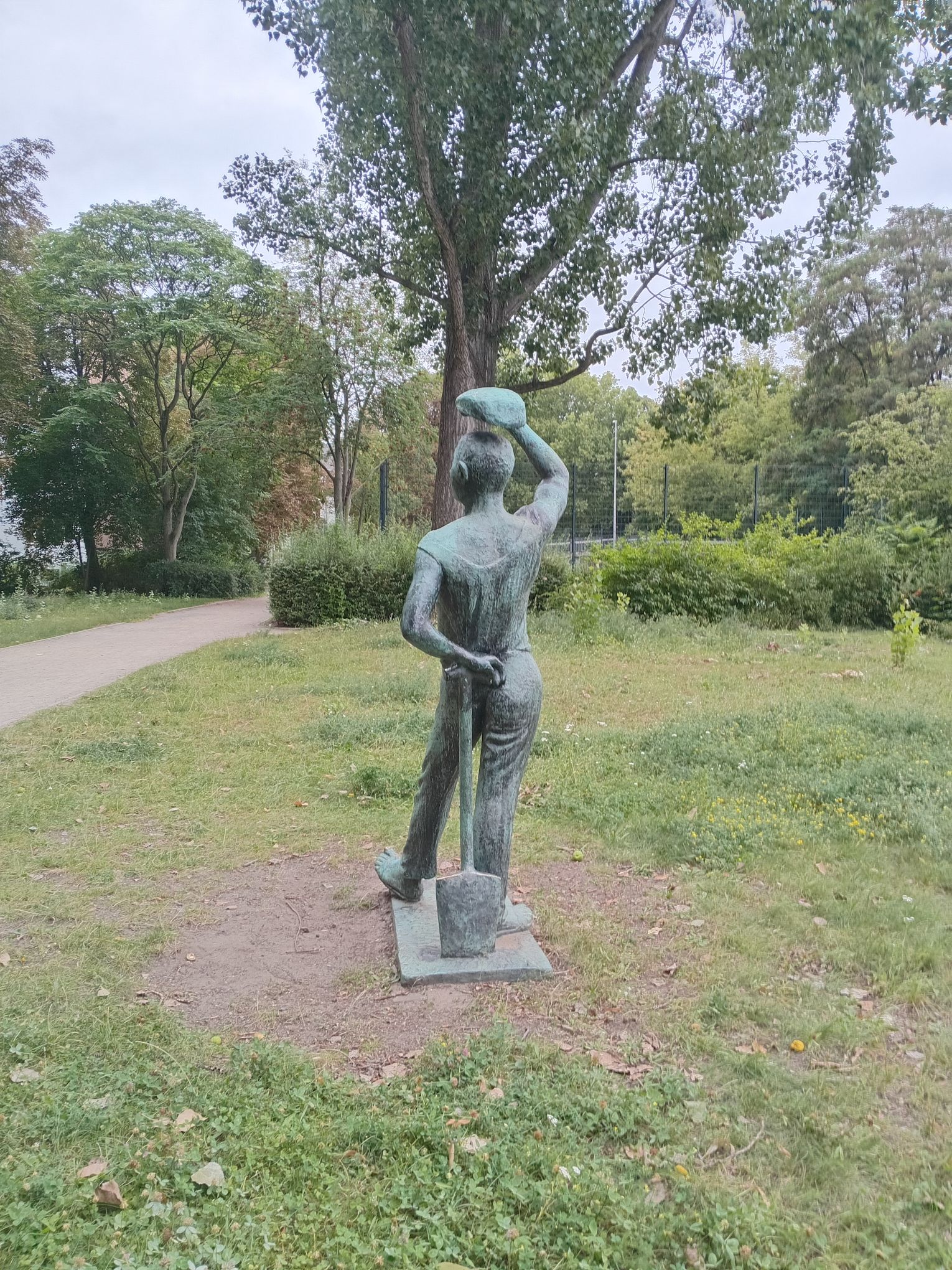 Diese Plastik stellt einen jungen Mann in Lebensgröße dar. Er hat sein Gewicht auf sein rechtes Bein verlagert, wobei das linke leicht nach vorn gestreckt ist. Mit seiner rechten Hand hebt er grüßend seine Mütze und die andere befindet sich hinter seinem Rücken, wo er sie auf den sich dort befindenden Spaten, stützt. Er trägt ein enganliegendes Unterhemd und eine lange Hose. An seinen Füßen befinden sich einfache Sandalen, bei denen seine Zehen herausschauen. Der Gesichtsausdruck des jungen Mannes ist entspannt und er scheint zu lächeln. (Rieke Fender)