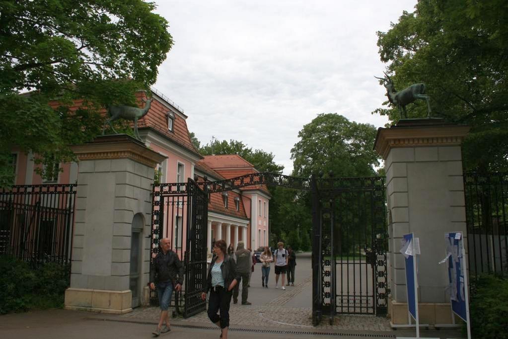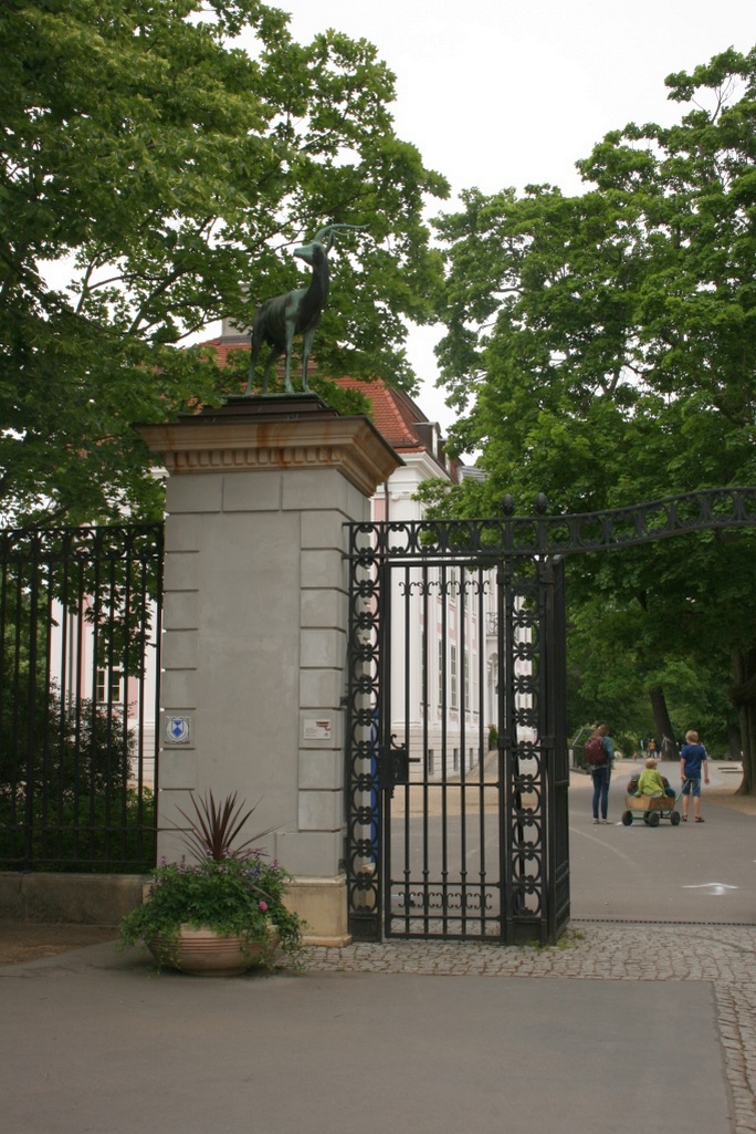 Auf den gemauerten und verputzten Vierkant-Pfeilern des Haupttores am Eingang zum Schlosspark Friedrichsfelde im Tierpark stehen, einander antithetisch gegenüberstehend auf sehr flachen, quadratischen Standplatten die beiden zierlichen Gazellen-Figuren. Die Köpfe der Tiere sind jeweils zur einander abgewandten Seite gewendet (Jörg Kuhn).