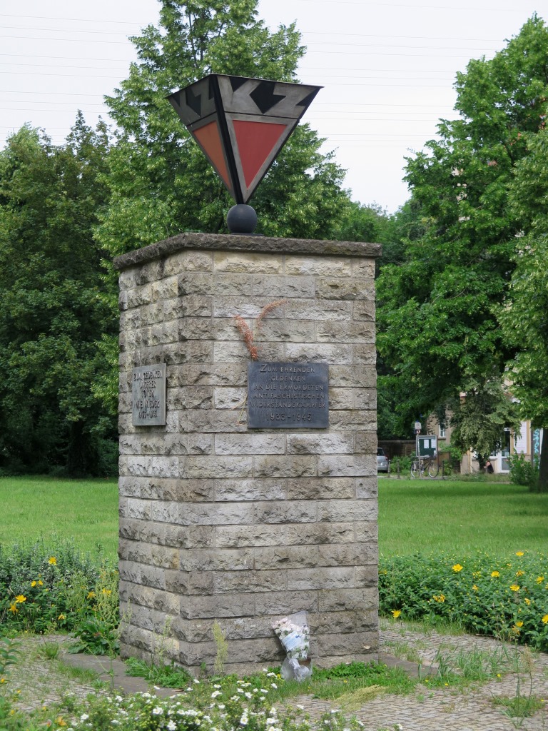 Auf den weiteren drei Tafeln, ebenfalls in erhabenen Buchstaben, die identische Inschrift: ZUM GEDENKEN / UNSERER / TOTEN / NIE WIEDER / 1933 – 1945. Der Sockel endet mit einer dunkleren, leicht überstehenden Deckplatte. Darauf befindet sich eine Metallkugel, die eine auf dem Kopf stehende Pyramide aus verschiedenfarbigem Metall trägt. In die jeweils untere Spitze der Pyramide ist an jeder Seite ein gleichschenkeliges Dreieck aus rotem Metall eingefügt, dass auf den sog. Häftlingswinkel verweist, ein seit 1937 gebräuchliches Symbol, das der Kennzeichnung der Häftlinge in den Konzentrationslagern diente. Die politischen Häftlinge mussten einen roten Winkel tragen. Darüber stehen, in die äußere Form der Pyramide eingeschrieben, die silberfarbenen Buchstaben KZ vor schwarzem Hintergrund (Nicola Vösgen).