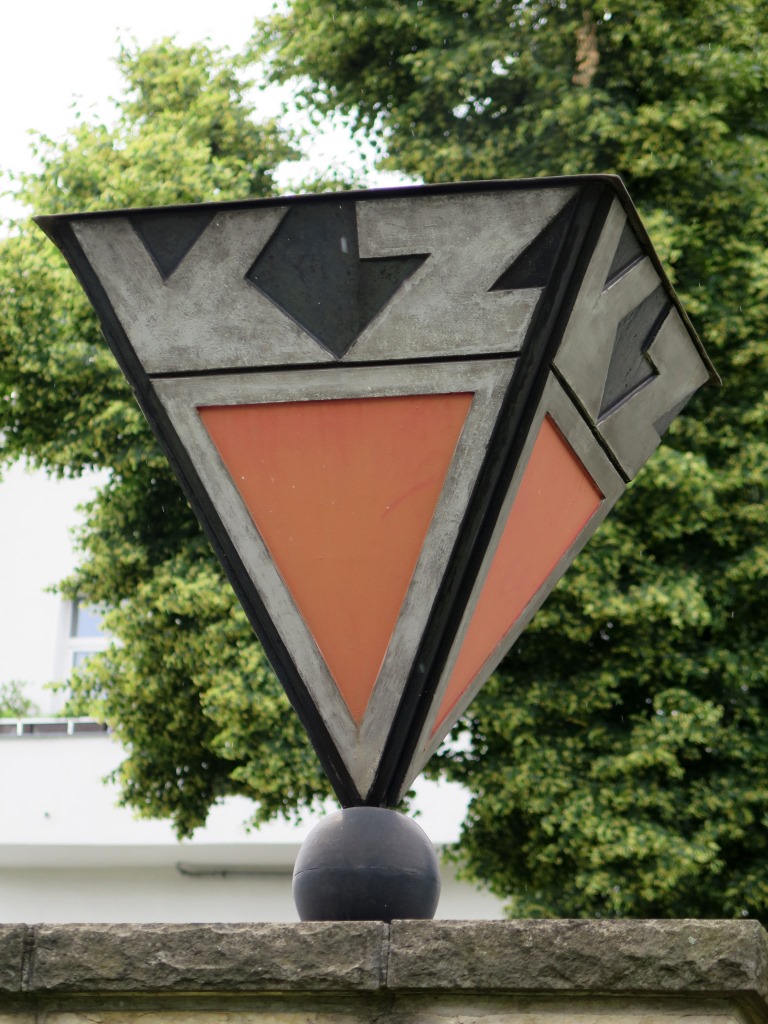 Auf den weiteren drei Tafeln, ebenfalls in erhabenen Buchstaben, die identische Inschrift: ZUM GEDENKEN / UNSERER / TOTEN / NIE WIEDER / 1933 – 1945. Der Sockel endet mit einer dunkleren, leicht überstehenden Deckplatte. Darauf befindet sich eine Metallkugel, die eine auf dem Kopf stehende Pyramide aus verschiedenfarbigem Metall trägt. In die jeweils untere Spitze der Pyramide ist an jeder Seite ein gleichschenkeliges Dreieck aus rotem Metall eingefügt, dass auf den sog. Häftlingswinkel verweist, ein seit 1937 gebräuchliches Symbol, das der Kennzeichnung der Häftlinge in den Konzentrationslagern diente. Die politischen Häftlinge mussten einen roten Winkel tragen. Darüber stehen, in die äußere Form der Pyramide eingeschrieben, die silberfarbenen Buchstaben KZ vor schwarzem Hintergrund (Nicola Vösgen).